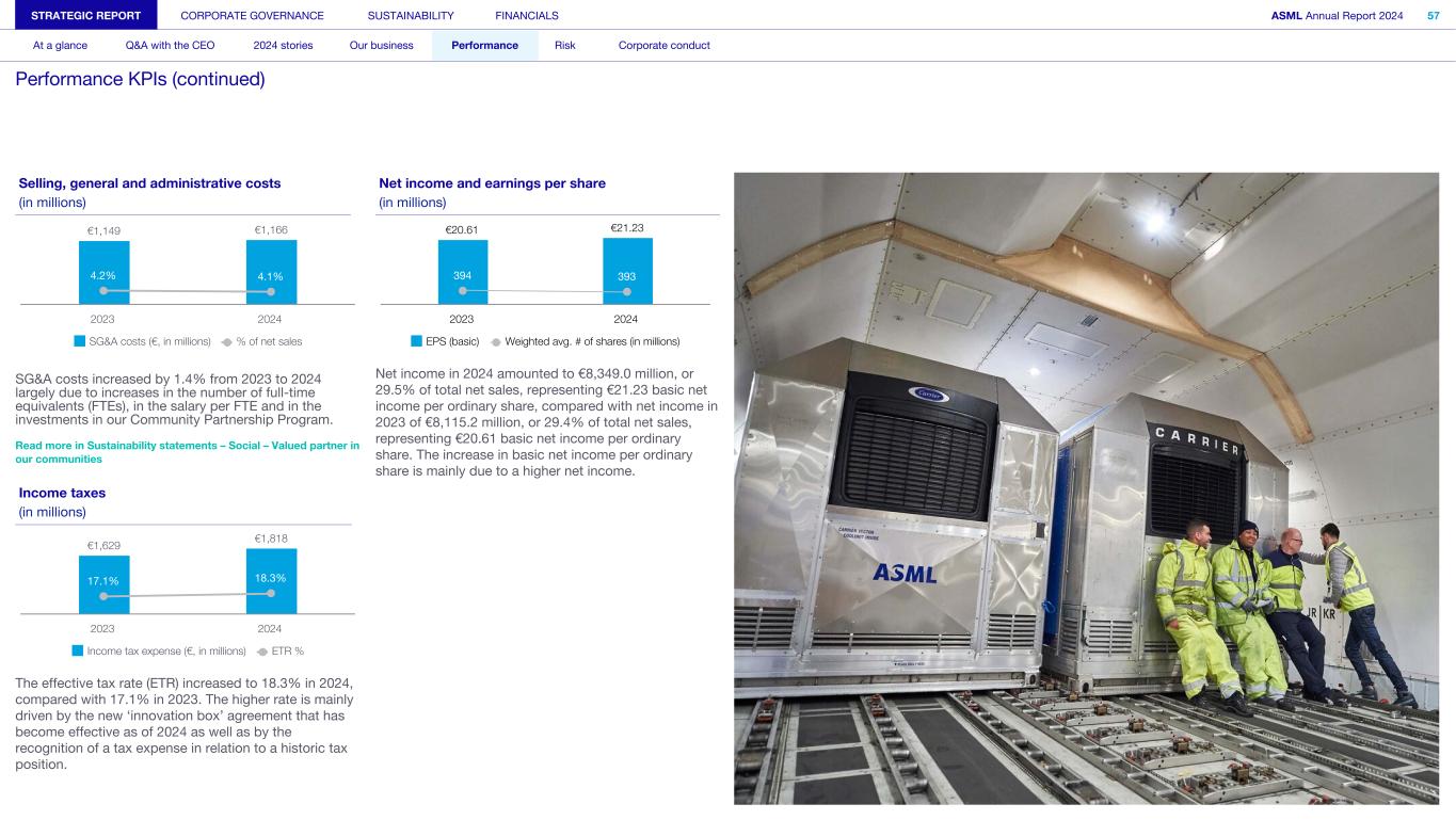 Selling, general and administrative costs (in millions) €1,149 €1,166 4.2% 4.1% SG&A costs (€, in millions) % of net sales 2023 2024 SG&A costs increased by 1.4% from 2023 to 2024 largely due to increases in the number of full-time equivalents (FTEs), in the salary per FTE and in the investments in our Community Partnership Program. Read more in Sustainability statements – Social – Valued partner in our communities Income taxes (in millions) €1,629 €1,818 17.1% 18.3% Income tax expense (€, in millions) ETR % 2023 2024 The effective tax rate (ETR) increased to 18.3% in 2024, compared with 17.1% in 2023. The higher rate is mainly driven by the new ‘innovation box’ agreement that has become effective as of 2024 as well as by the recognition of a tax expense in relation to a historic tax position. Net income and earnings per share (in millions) €20.61 €21.23 394 393 EPS (basic) Weighted avg. # of shares (in millions) 2023 2024 Net income in 2024 amounted to €8,349.0 million, or 29.5% of total net sales, representing €21.23 basic net income per ordinary share, compared with net income in 2023 of €8,115.2 million, or 29.4% of total net sales, representing €20.61 basic net income per ordinary share. The increase in basic net income per ordinary share is mainly due to a higher net income. STRATEGIC REPORT CORPORATE GOVERNANCE SUSTAINABILITY FINANCIALS ASML Annual Report 2024 57 At a glance Q&A with the CEO 2024 stories Our business Performance Risk Corporate conduct Performance KPIs (continued)