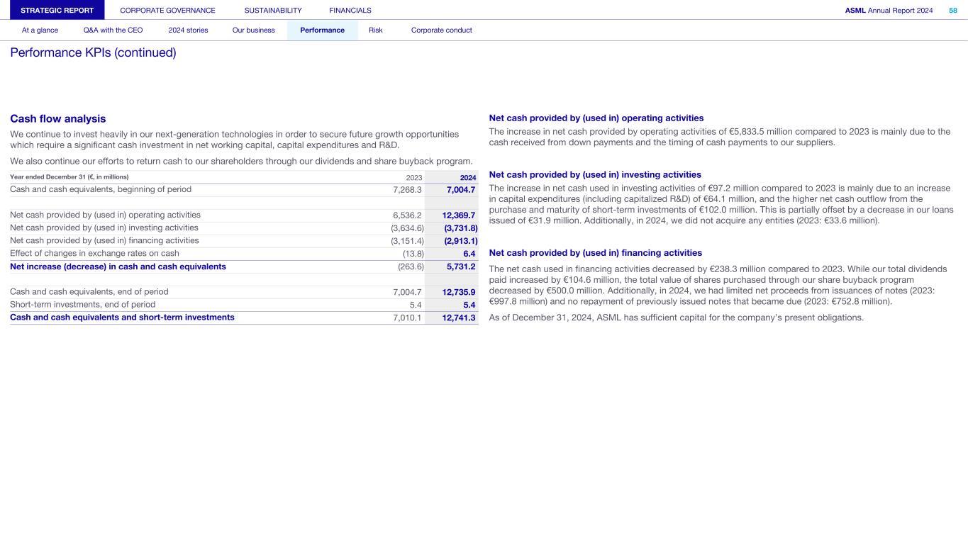 Cash flow analysis We continue to invest heavily in our next-generation technologies in order to secure future growth opportunities which require a significant cash investment in net working capital, capital expenditures and R&D. We also continue our efforts to return cash to our shareholders through our dividends and share buyback program. Year ended December 31 (€, in millions) 2023 2024 Cash and cash equivalents, beginning of period 7,268.3 7,004.7 Net cash provided by (used in) operating activities 6,536.2 12,369.7 Net cash provided by (used in) investing activities (3,634.6) (3,731.8) Net cash provided by (used in) financing activities (3,151.4) (2,913.1) Effect of changes in exchange rates on cash (13.8) 6.4 Net increase (decrease) in cash and cash equivalents (263.6) 5,731.2 Cash and cash equivalents, end of period 7,004.7 12,735.9 Short-term investments, end of period 5.4 5.4 Cash and cash equivalents and short-term investments 7,010.1 12,741.3 Net cash provided by (used in) operating activities The increase in net cash provided by operating activities of €5,833.5 million compared to 2023 is mainly due to the cash received from down payments and the timing of cash payments to our suppliers. Net cash provided by (used in) investing activities The increase in net cash used in investing activities of €97.2 million compared to 2023 is mainly due to an increase in capital expenditures (including capitalized R&D) of €64.1 million, and the higher net cash outflow from the purchase and maturity of short-term investments of €102.0 million. This is partially offset by a decrease in our loans issued of €31.9 million. Additionally, in 2024, we did not acquire any entities (2023: €33.6 million). Net cash provided by (used in) financing activities The net cash used in financing activities decreased by €238.3 million compared to 2023. While our total dividends paid increased by €104.6 million, the total value of shares purchased through our share buyback program decreased by €500.0 million. Additionally, in 2024, we had limited net proceeds from issuances of notes (2023: €997.8 million) and no repayment of previously issued notes that became due (2023: €752.8 million). As of December 31, 2024, ASML has sufficient capital for the company’s present obligations. STRATEGIC REPORT CORPORATE GOVERNANCE SUSTAINABILITY FINANCIALS ASML Annual Report 2024 58 At a glance Q&A with the CEO 2024 stories Our business Performance Risk Corporate conduct Performance KPIs (continued)