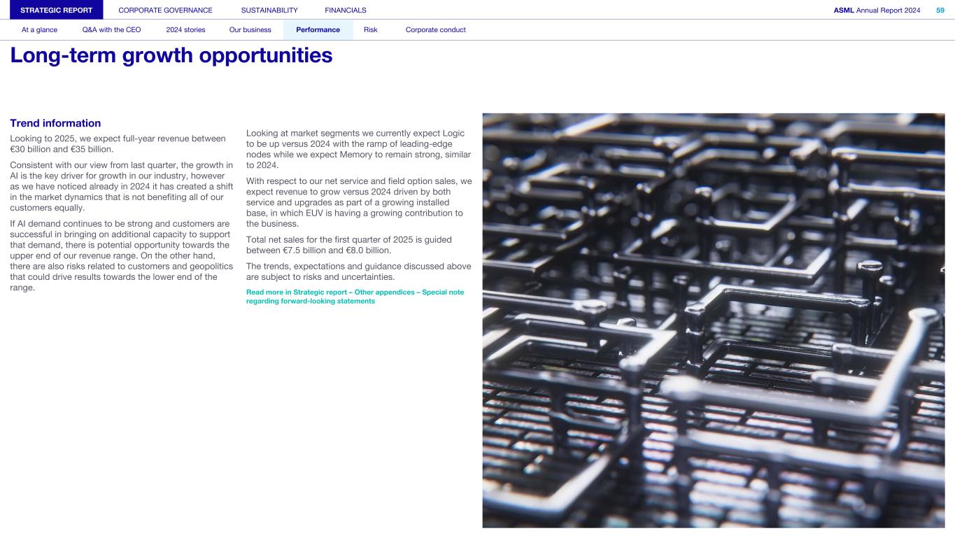 Trend information Looking to 2025, we expect full-year revenue between €30 billion and €35 billion. Consistent with our view from last quarter, the growth in AI is the key driver for growth in our industry, however as we have noticed already in 2024 it has created a shift in the market dynamics that is not benefiting all of our customers equally. If AI demand continues to be strong and customers are successful in bringing on additional capacity to support that demand, there is potential opportunity towards the upper end of our revenue range. On the other hand, there are also risks related to customers and geopolitics that could drive results towards the lower end of the range. Looking at market segments we currently expect Logic to be up versus 2024 with the ramp of leading-edge nodes while we expect Memory to remain strong, similar to 2024. With respect to our net service and field option sales, we expect revenue to grow versus 2024 driven by both service and upgrades as part of a growing installed base, in which EUV is having a growing contribution to the business. Total net sales for the first quarter of 2025 is guided between €7.5 billion and €8.0 billion. The trends, expectations and guidance discussed above are subject to risks and uncertainties. Read more in Strategic report – Other appendices – Special note regarding forward-looking statements STRATEGIC REPORT CORPORATE GOVERNANCE SUSTAINABILITY FINANCIALS ASML Annual Report 2024 59 At a glance Q&A with the CEO 2024 stories Our business Performance Risk Corporate conduct Long-term growth opportunities