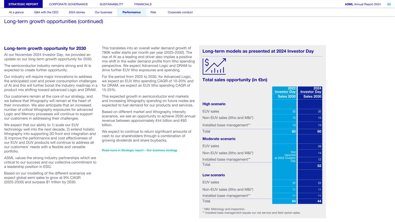 Long-term growth opportunity for 2030 At our November 2024 Investor Day, we provided an update on our long-term growth opportunity for 2030. The semiconductor industry remains strong and AI is expected to create further opportunity. Our industry will require major innovations to address the anticipated cost and power consumption challenges of AI and this will further boost the industry roadmap in a product mix shifting toward advanced Logic and DRAM. Our customers remain at the core of our strategy, and we believe that lithography will remain at the heart of their innovation. We also anticipate that an increased number of critical lithography exposures for advanced Logic and Memory processes will continue to support our customers in addressing their challenges. We expect that our ability to 1) scale our EUV technology well into the next decade, 2) extend holistic lithography into supporting 3D front end integration and 3) improve the performance and cost effectiveness of our EUV and DUV products will continue to address all our customers’ needs with a flexible and versatile portfolio. ASML values the strong industry partnerships which are critical to our success and our collective commitment to a leadership position in ESG. Based on our modelling of the different scenarios we expect global semi sales to grow at 9% CAGR (2025-2030) and surpass $1 trillion by 2030. This translates into an overall wafer demand growth of 780K wafer starts per month per year (2025-2030). The rise of AI as a leading end driver also implies a positive mix-shift in the wafer demand profile from litho spending perspective. We expect Advanced Logic and DRAM to drive further EUV litho exposures and spending. For the period from 2025 to 2030, for Advanced Logic, we expect an EUV litho spending CAGR of 10-20% and for DRAM, we expect an EUV litho spending CAGR of 15-25%. This expected growth in semiconductor end markets and increasing lithography spending on future nodes are expected to fuel demand for our products and services. Based on different market and lithography intensity scenarios, we see an opportunity to achieve 2030 annual revenue between approximately €44 billion and €60 billion. We expect to continue to return significant amounts of cash to our shareholders through a combination of growing dividends and share buybacks. Read more in Strategic report – Our business strategy Long-term models as presented at 2024 Investor Day Total sales opportunity (in €bn) 2022 Investor Day 2024 Investor Day Sales 2030 Sales 2030 High scenario C M EUV sales 32 32 Non-EUV sales (litho and M&I*) 15 15 Installed base management** 13 13 Total 60 60 Moderate scenario EUV sales Not reported at 2022 Investor Day 26 Non-EUV sales (litho and M&I*) 14 Installed base management** 12 Total 52 Low scenario 6 EUV sales 22 22 Non-EUV sales (litho and M&I*) 11 11 Installed base management** 11 11 Total 44 44 * M&I: Metrology and inspection. ** Installed base management equals our net service and field option sales. STRATEGIC REPORT CORPORATE GOVERNANCE SUSTAINABILITY FINANCIALS ASML Annual Report 2024 60 At a glance Q&A with the CEO 2024 stories Our business Performance Risk Corporate conduct Long-term growth opportunities (continued)