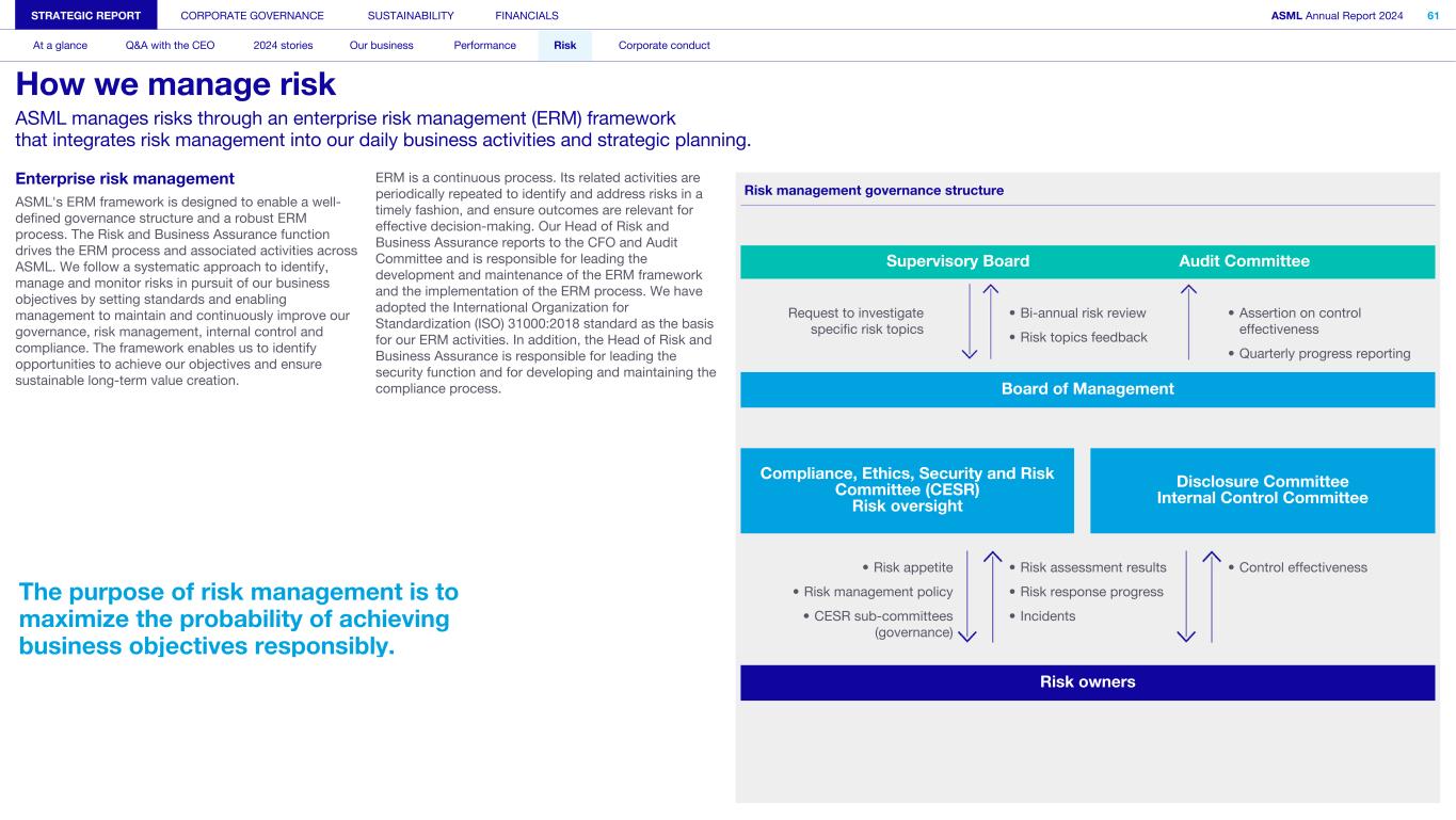 Enterprise risk management ASML's ERM framework is designed to enable a well- defined governance structure and a robust ERM process. The Risk and Business Assurance function drives the ERM process and associated activities across ASML. We follow a systematic approach to identify, manage and monitor risks in pursuit of our business objectives by setting standards and enabling management to maintain and continuously improve our governance, risk management, internal control and compliance. The framework enables us to identify opportunities to achieve our objectives and ensure sustainable long-term value creation. The purpose of risk management is to maximize the probability of achieving business objectives responsibly. ERM is a continuous process. Its related activities are periodically repeated to identify and address risks in a timely fashion, and ensure outcomes are relevant for effective decision-making. Our Head of Risk and Business Assurance reports to the CFO and Audit Committee and is responsible for leading the development and maintenance of the ERM framework and the implementation of the ERM process. We have adopted the International Organization for Standardization (ISO) 31000:2018 standard as the basis for our ERM activities. In addition, the Head of Risk and Business Assurance is responsible for leading the security function and for developing and maintaining the compliance process. Risk management governance structure Supervisory Board Audit Committee Request to investigate specific risk topics • Bi-annual risk review • Risk topics feedback • Assertion on control effectiveness • Quarterly progress reporting Board of Management Compliance, Ethics, Security and Risk Committee (CESR) Risk oversight Disclosure Committee Internal Control Committee • Risk appetite • Risk management policy • CESR sub-committees (governance) • Risk assessment results • Risk response progress • Incidents • Control effectiveness Risk owners STRATEGIC REPORT CORPORATE GOVERNANCE SUSTAINABILITY FINANCIALS ASML Annual Report 2024 61 At a glance Q&A with the CEO 2024 stories Our business Performance Risk Corporate conduct How we manage risk ASML manages risks through an enterprise risk management (ERM) framework that integrates risk management into our daily business activities and strategic planning.