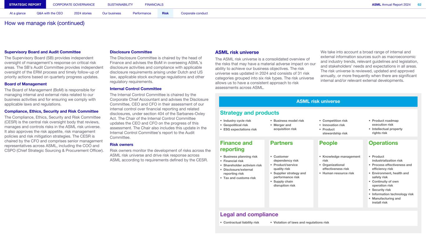 Supervisory Board and Audit Committee The Supervisory Board (SB) provides independent oversight of management’s response on critical risk areas. The SB’s Audit Committee provides independent oversight of the ERM process and timely follow-up of priority actions based on quarterly progress updates. Board of Management The Board of Management (BoM) is responsible for managing internal and external risks related to our business activities and for ensuring we comply with applicable laws and regulations. Compliance, Ethics, Security and Risk Committee The Compliance, Ethics, Security and Risk Committee (CESR) is the central risk oversight body that reviews, manages and controls risks in the ASML risk universe. It also approves the risk appetite, risk management policies and risk mitigation strategies. The CESR is chaired by the CFO and comprises senior management representatives across ASML, including the COO and CSPO (Chief Strategic Sourcing & Procurement Officer). Disclosure Committee The Disclosure Committee is chaired by the head of Finance and advises the BoM in overseeing ASML’s disclosure activities and compliance with applicable disclosure requirements arising under Dutch and US law, applicable stock exchange regulations and other regulatory requirements. Internal Control Committee The Internal Control Committee is chaired by the Corporate Chief Accountant and advises the Disclosure Committee, CEO and CFO in their assessment of our internal control over financial reporting and related disclosures, under section 404 of the Sarbanes-Oxley Act. The Chair of the Internal Control Committee updates the CEO and CFO on the progress of this assessment. The Chair also includes this update in the Internal Control Committee’s report to the Audit Committee. Risk owners Risk owners monitor the development of risks across the ASML risk universe and drive risk response across ASML according to requirements defined by the CESR. ASML risk universe The ASML risk universe is a consolidated overview of the risks that may have a material adverse impact on our ability to achieve our business objectives. The risk universe was updated in 2024 and consists of 31 risk categories grouped into six risk types. The risk universe allows us to have a consistent approach to risk assessments across ASML. ASML risk universe Strategy and products • Industry cycle risk • Geopolitical risk • ESG expectations risk • Business model risk • Merger and acquisition risk • Competition risk • Innovation risk • Product stewardship risk • Product roadmap execution risk • Intellectual property rights risk Finance and reporting Partners People Operations • Business planning risk • Financial risk • Shareholder activism risk • Disclosure/external reporting risk • Tax and customs risk • Customer dependency risk • Product/service quality risk • Supplier strategy and performance risk • Supply chain disruption risk • Knowledge management risk • Organizational effectiveness risk • Human resource risk • Product industrialization risk • Process effectiveness and efficiency risk • Environment, health and safety risk • Continuity of own operation risk • Security risk • Information technology risk • Manufacturing and install risk Legal and compliance • Contractual liability risk • Violation of laws and regulations risk We take into account a broad range of internal and external information sources such as macroeconomic and industry trends, relevant guidelines and legislation, and stakeholders’ needs and expectations in all areas. The risk universe is reviewed, updated and approved annually, or more frequently when there are significant internal and/or relevant external developments. STRATEGIC REPORT CORPORATE GOVERNANCE SUSTAINABILITY FINANCIALS ASML Annual Report 2024 62 At a glance Q&A with the CEO 2024 stories Our business Performance Risk Corporate conduct How we manage risk (continued)