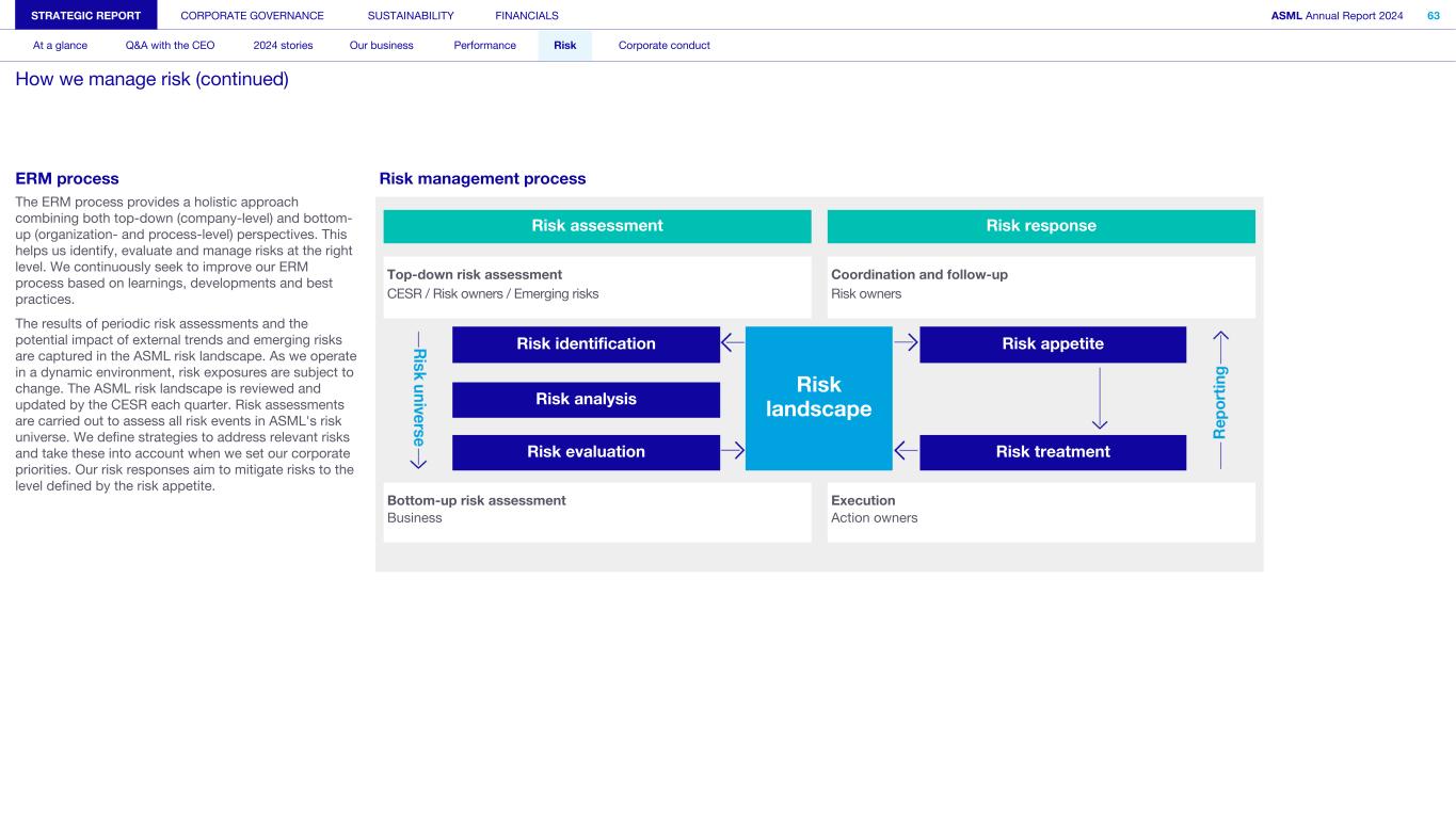 ERM process The ERM process provides a holistic approach combining both top-down (company-level) and bottom- up (organization- and process-level) perspectives. This helps us identify, evaluate and manage risks at the right level. We continuously seek to improve our ERM process based on learnings, developments and best practices. The results of periodic risk assessments and the potential impact of external trends and emerging risks are captured in the ASML risk landscape. As we operate in a dynamic environment, risk exposures are subject to change. The ASML risk landscape is reviewed and updated by the CESR each quarter. Risk assessments are carried out to assess all risk events in ASML's risk universe. We define strategies to address relevant risks and take these into account when we set our corporate priorities. Our risk responses aim to mitigate risks to the level defined by the risk appetite. Risk management process Risk assessment Risk response Top-down risk assessment Coordination and follow-up CESR / Risk owners / Emerging risks Risk owners Risk identification Risk landscape Risk appetite Risk analysis Risk evaluation Risk treatment Bottom-up risk assessment Execution Business Action owners STRATEGIC REPORT CORPORATE GOVERNANCE SUSTAINABILITY FINANCIALS ASML Annual Report 2024 63 At a glance Q&A with the CEO 2024 stories Our business Performance Risk Corporate conduct How we manage risk (continued)