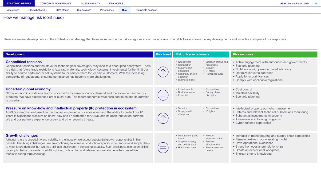 There are several developments in the context of our strategy that have an impact on the risk categories in our risk universe. The table below shows the key developments and includes examples of our responses: Development Risk trend Risk universe reference Risk response Geopolitical tensions • Geopolitical • Competition • Supply chain disruption • Continuity of own operation • Business model • Violation of laws and regulations • Security • IP rights • Human resource • Active engagement with authorities and governments • Scenario planning • Collaborate with peers in global advocacy • Optimize industrial footprint • Apply for export licenses • Comply with applicable regulations Geopolitical tensions and the strive for technological sovereignty may lead to a decoupled ecosystem. There is a risk that future trade restrictions (e.g. raw materials, technology, systems, investments) further limit our ability to source parts and/or sell systems to, or service them for, certain customers. With the increasing complexity of regulations, ensuring compliance has become more challenging. Uncertain global economy • Industry cycle • Business model • Financial • Competition • Supply chain disruption • Cost control • Maintain flexibility • Scenario planning Global economic conditions lead to uncertainty for semiconductor demand and therefore demand for our products. We have experienced order push-outs. The macroeconomic weakness continues and its duration is uncertain. Pressure on know-how and intellectual property (IP) protection in ecosystem • Security • Supply chain disruption • Competition • IP rights • Intellectual property portfolio management • Patents and relevant technical publications monitoring • Substantial investments in security • Awareness and training programs • Cyber defense capabilities ASML’s strengths are based on the innovation power in our ecosystem and the ability to protect our IP. There is significant pressure on know-how and IP protection for ASML and its open innovation partners. We and our partners experience cyber- and other security threats. Growth challenges • Manufacturing and install • Supplier strategy and performance • Human resource • Product industrialization • Process effectiveness • Product/service quality • Increase of manufacturing and supply chain capabilities • Remain flexible in our operating model • Drive operational excellence • Strengthen ecosystem relationships • Create an exceptional workplace • Shorten time to knowledge Although there is uncertainty and volatility in the industry, we expect substantial growth opportunities in this decade. That brings challenges. We are continuing to increase production capacity in our end-to-end supply chain to meet future demand, but we may still face challenges in increasing capacity. Such challenges can be amplified by supply chain constraints. In addition, hiring, onboarding and retaining our workforce in the competitive market is a long-term challenge. STRATEGIC REPORT CORPORATE GOVERNANCE SUSTAINABILITY FINANCIALS ASML Annual Report 2024 64 At a glance Q&A with the CEO 2024 stories Our business Performance Risk Corporate conduct How we manage risk (continued)
