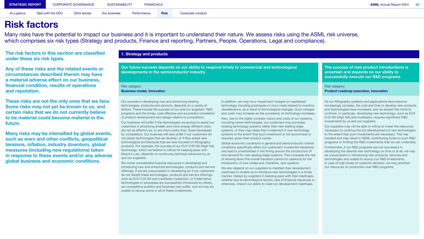 The risk factors in this section are classified under these six risk types. Any of these risks and the related events or circumstances described therein may have a material adverse effect on our business, financial condition, results of operations and reputation. These risks are not the only ones that we face. Some risks may not yet be known to us, and certain risks that we do not currently believe to be material could become material in the future. Many risks may be intensified by global events, such as wars and other conflicts, geopolitical tensions, inflation, industry downturn, global measures (including new regulations) taken in response to these events and/or any adverse global business and economic conditions. 1. Strategy and products Our future success depends on our ability to respond timely to commercial and technological developments in the semiconductor industry The success of new product introductions is uncertain and depends on our ability to successfully execute our R&D programs Risk category: Risk category: Business model, Innovation Product roadmap execution, Innovation Our success in developing new and enhancing existing technologies, products and services, depends on a variety of factors. These include the success of our and our suppliers’ R&D programs and the timely, cost-effective and successful completion of product development and design relative to competitors. Our business will suffer if the technologies we pursue to assist our customers in producing smaller and more energy-efficient chips are not as effective as, or are more costly than, those developed by competitors. Our business will also suffer if our customers do not adopt technologies that we develop, or if they adopt new technological architectures that are less focused on lithography products. For example, the success of our EUV 0.55 NA (High NA) technology, which we believe is critical for keeping pace with Moore’s Law, depends on continuing technical advances by us and our suppliers. We invest considerable financial resources in developing and introducing new and enhanced technologies, products and service offerings. If we are unsuccessful in developing (or if our customers do not adopt) these technologies, products and service offerings, such as EUV 0.55 NA and multibeam inspection, or if alternative technologies or processes are successfully introduced by others, our competitive position and business may suffer, and we may be unable to recoup some or all of these investments. In addition, we may incur impairment charges on capitalized technology including prototypes or incur costs related to inventory obsolescence, as a result of technological changes. Such charges and costs may increase as the complexity of technology increases. Also, due to the highly complex nature and costs of our systems, including newer technologies, our customers may purchase existing technology systems rather than new leading-edge systems, or they may delay their investment in new technology systems to the extent that such investment is not economical or required, given their product cycles. Global economic conditions in general and semiconductor market conditions specifically affect our customers’ investment decisions and lead to uncertainties in the timing around the introduction of and demand for new leading-edge systems. This increases the risk of slowing down the overall transition period (or cadence) for the introduction of new nodes and, therefore, new systems. We also depend on our suppliers to maintain their development roadmaps to enable us to introduce new technologies in a timely manner. Delays by suppliers in keeping pace with their roadmaps, whether due to technological factors, lack of financial resources or otherwise, impact our ability to meet our development roadmaps. As our lithography systems and applications have become increasingly complex, the cost and time to develop new products and technologies have increased, and we expect this trend to continue. In particular, developing new technology, such as EUV 0.55 NA (High NA) and multibeam, requires significant R&D investments by us and our suppliers. Our suppliers may not be able or willing to invest the resources necessary to continue the (co-)development of new technologies to the extent that such investments are necessary. This has resulted and may result in ASML contributing funds to such R&D programs or limiting the R&D investments that we can undertake. Furthermore, if our R&D programs are not successful in developing the desired new technology on time or at all, we may be unsuccessful in introducing new products, services and technologies and unable to recoup our R&D investments. In case of high levels of customer demand, we may prioritize our resources on production over R&D programs. STRATEGIC REPORT CORPORATE GOVERNANCE SUSTAINABILITY FINANCIALS ASML Annual Report 2024 65 At a glance Q&A with the CEO 2024 stories Our business Performance Risk Corporate conduct Risk factors Many risks have the potential to impact our business and it is important to understand their nature. We assess risks using the ASML risk universe, which comprises six risk types (Strategy and products, Finance and reporting, Partners, People, Operations, Legal and compliance).