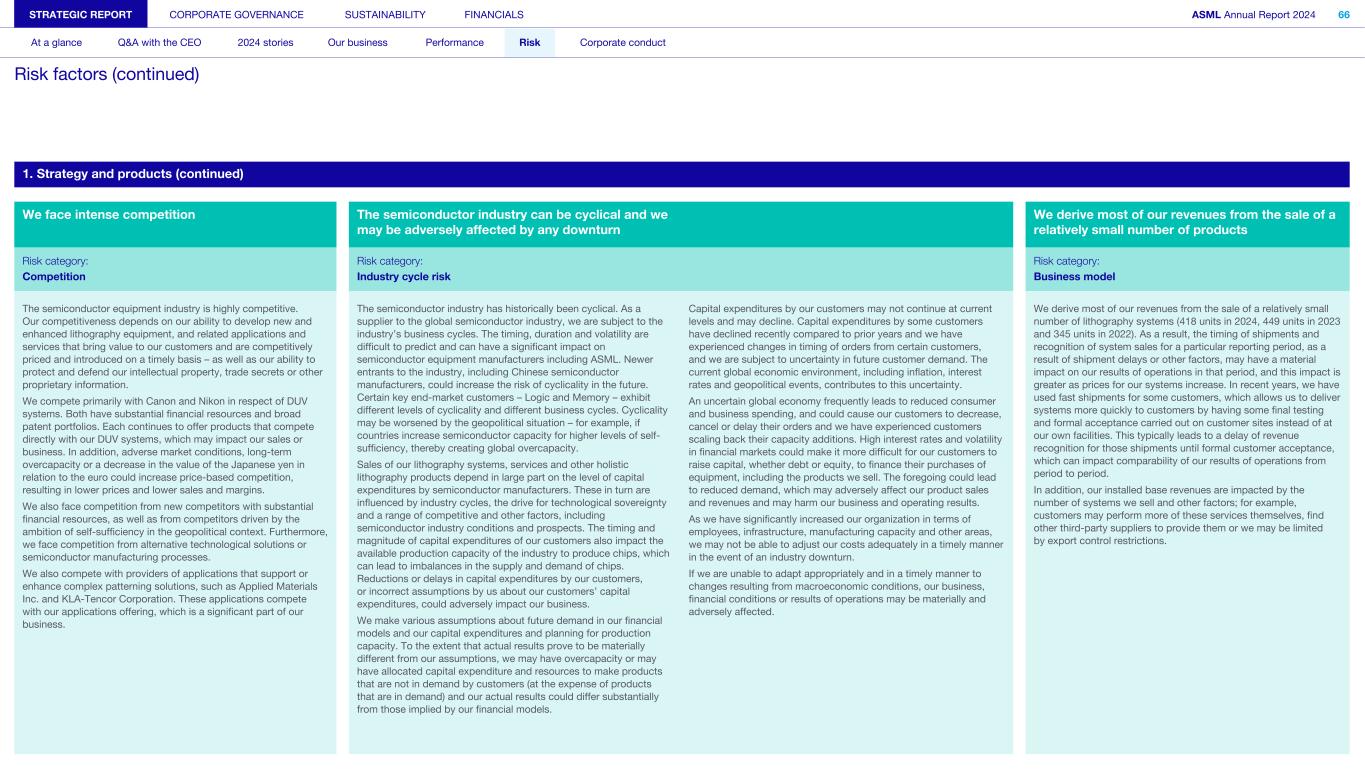 1. Strategy and products (continued) We face intense competition The semiconductor industry can be cyclical and we may be adversely affected by any downturn We derive most of our revenues from the sale of a relatively small number of products Risk category: Risk category: Risk category: Competition Industry cycle risk Business model The semiconductor equipment industry is highly competitive. Our competitiveness depends on our ability to develop new and enhanced lithography equipment, and related applications and services that bring value to our customers and are competitively priced and introduced on a timely basis – as well as our ability to protect and defend our intellectual property, trade secrets or other proprietary information. We compete primarily with Canon and Nikon in respect of DUV systems. Both have substantial financial resources and broad patent portfolios. Each continues to offer products that compete directly with our DUV systems, which may impact our sales or business. In addition, adverse market conditions, long-term overcapacity or a decrease in the value of the Japanese yen in relation to the euro could increase price-based competition, resulting in lower prices and lower sales and margins. We also face competition from new competitors with substantial financial resources, as well as from competitors driven by the ambition of self-sufficiency in the geopolitical context. Furthermore, we face competition from alternative technological solutions or semiconductor manufacturing processes. We also compete with providers of applications that support or enhance complex patterning solutions, such as Applied Materials Inc. and KLA-Tencor Corporation. These applications compete with our applications offering, which is a significant part of our business. The semiconductor industry has historically been cyclical. As a supplier to the global semiconductor industry, we are subject to the industry’s business cycles. The timing, duration and volatility are difficult to predict and can have a significant impact on semiconductor equipment manufacturers including ASML. Newer entrants to the industry, including Chinese semiconductor manufacturers, could increase the risk of cyclicality in the future. Certain key end-market customers – Logic and Memory – exhibit different levels of cyclicality and different business cycles. Cyclicality may be worsened by the geopolitical situation – for example, if countries increase semiconductor capacity for higher levels of self- sufficiency, thereby creating global overcapacity. Sales of our lithography systems, services and other holistic lithography products depend in large part on the level of capital expenditures by semiconductor manufacturers. These in turn are influenced by industry cycles, the drive for technological sovereignty and a range of competitive and other factors, including semiconductor industry conditions and prospects. The timing and magnitude of capital expenditures of our customers also impact the available production capacity of the industry to produce chips, which can lead to imbalances in the supply and demand of chips. Reductions or delays in capital expenditures by our customers, or incorrect assumptions by us about our customers’ capital expenditures, could adversely impact our business. We make various assumptions about future demand in our financial models and our capital expenditures and planning for production capacity. To the extent that actual results prove to be materially different from our assumptions, we may have overcapacity or may have allocated capital expenditure and resources to make products that are not in demand by customers (at the expense of products that are in demand) and our actual results could differ substantially from those implied by our financial models. Capital expenditures by our customers may not continue at current levels and may decline. Capital expenditures by some customers have declined recently compared to prior years and we have experienced changes in timing of orders from certain customers, and we are subject to uncertainty in future customer demand. The current global economic environment, including inflation, interest rates and geopolitical events, contributes to this uncertainty. An uncertain global economy frequently leads to reduced consumer and business spending, and could cause our customers to decrease, cancel or delay their orders and we have experienced customers scaling back their capacity additions. High interest rates and volatility in financial markets could make it more difficult for our customers to raise capital, whether debt or equity, to finance their purchases of equipment, including the products we sell. The foregoing could lead to reduced demand, which may adversely affect our product sales and revenues and may harm our business and operating results. As we have significantly increased our organization in terms of employees, infrastructure, manufacturing capacity and other areas, we may not be able to adjust our costs adequately in a timely manner in the event of an industry downturn. If we are unable to adapt appropriately and in a timely manner to changes resulting from macroeconomic conditions, our business, financial conditions or results of operations may be materially and adversely affected. We derive most of our revenues from the sale of a relatively small number of lithography systems (418 units in 2024, 449 units in 2023 and 345 units in 2022). As a result, the timing of shipments and recognition of system sales for a particular reporting period, as a result of shipment delays or other factors, may have a material impact on our results of operations in that period, and this impact is greater as prices for our systems increase. In recent years, we have used fast shipments for some customers, which allows us to deliver systems more quickly to customers by having some final testing and formal acceptance carried out on customer sites instead of a