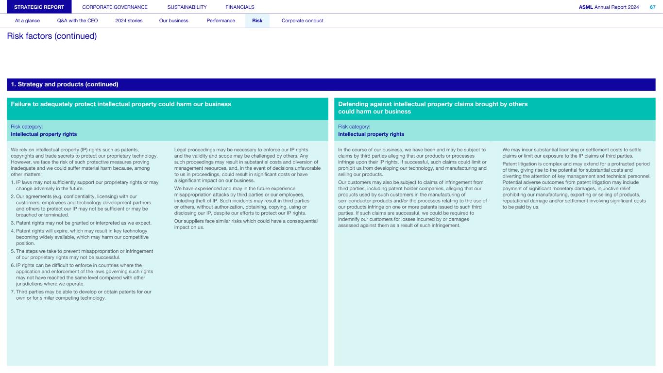 1. Strategy and products (continued) Failure to adequately protect intellectual property could harm our business Defending against intellectual property claims brought by others could harm our business Risk category: Risk category: Intellectual property rights Intellectual property rights We rely on intellectual property (IP) rights such as patents, copyrights and trade secrets to protect our proprietary technology. However, we face the risk of such protective measures proving inadequate and we could suffer material harm because, among other matters: 1. IP laws may not sufficiently support our proprietary rights or may change adversely in the future. 2. Our agreements (e.g. confidentiality, licensing) with our customers, employees and technology development partners and others to protect our IP may not be sufficient or may be breached or terminated. 3. Patent rights may not be granted or interpreted as we expect. 4. Patent rights will expire, which may result in key technology becoming widely available, which may harm our competitive position. 5. The steps we take to prevent misappropriation or infringement of our proprietary rights may not be successful. 6. IP rights can be difficult to enforce in countries where the application and enforcement of the laws governing such rights may not have reached the same level compared with other jurisdictions where we operate. 7. Third parties may be able to develop or obtain patents for our own or for similar competing technology. Legal proceedings may be necessary to enforce our IP rights and the validity and scope may be challenged by others. Any such proceedings may result in substantial costs and diversion of management resources, and, in the event of decisions unfavorable to us in proceedings, could result in significant costs or have a significant impact on our business. We have experienced and may in the future experience misappropriation attacks by third parties or our employees, including theft of IP. Such incidents may result in third parties or others, without authorization, obtaining, copying, using or disclosing our IP, despite our efforts to protect our IP rights. Our suppliers face similar risks which could have a consequential impact on us. In the course of our business, we have been and may be subject to claims by third parties alleging that our products or processes infringe upon their IP rights. If successful, such claims could limit or prohibit us from developing our technology, and manufacturing and selling our products. Our customers may also be subject to claims of infringement from third parties, including patent holder companies, alleging that our products used by such customers in the manufacturing of semiconductor products and/or the processes relating to the use of our products infringe on one or more patents issued to such third parties. If such claims are successful, we could be required to indemnify our customers for losses incurred by or damages assessed against them as a result of such infringement. We may incur substantial licensing or settlement costs to settle claims or limit our exposure to the IP claims of third parties. Patent litigation is complex and may extend for a protracted period of time, giving rise to the potential for substantial costs and diverting the attention of key management and technical personnel. Potential adverse outcomes from patent litigation may include payment of significant monetary damages, injunctive relief prohibiting our manufacturing, exporting or selling of products, reputational damage and/or settlement involving significant costs to be paid by us. STRATEGIC REPORT CORPORATE GOVERNANCE SUSTAINABILITY FINANCIALS ASML Annual Report 2024 67 At a glance Q&A with the CEO 2024 stories Our business Performance Risk Corporate conduct Risk factors (continued)