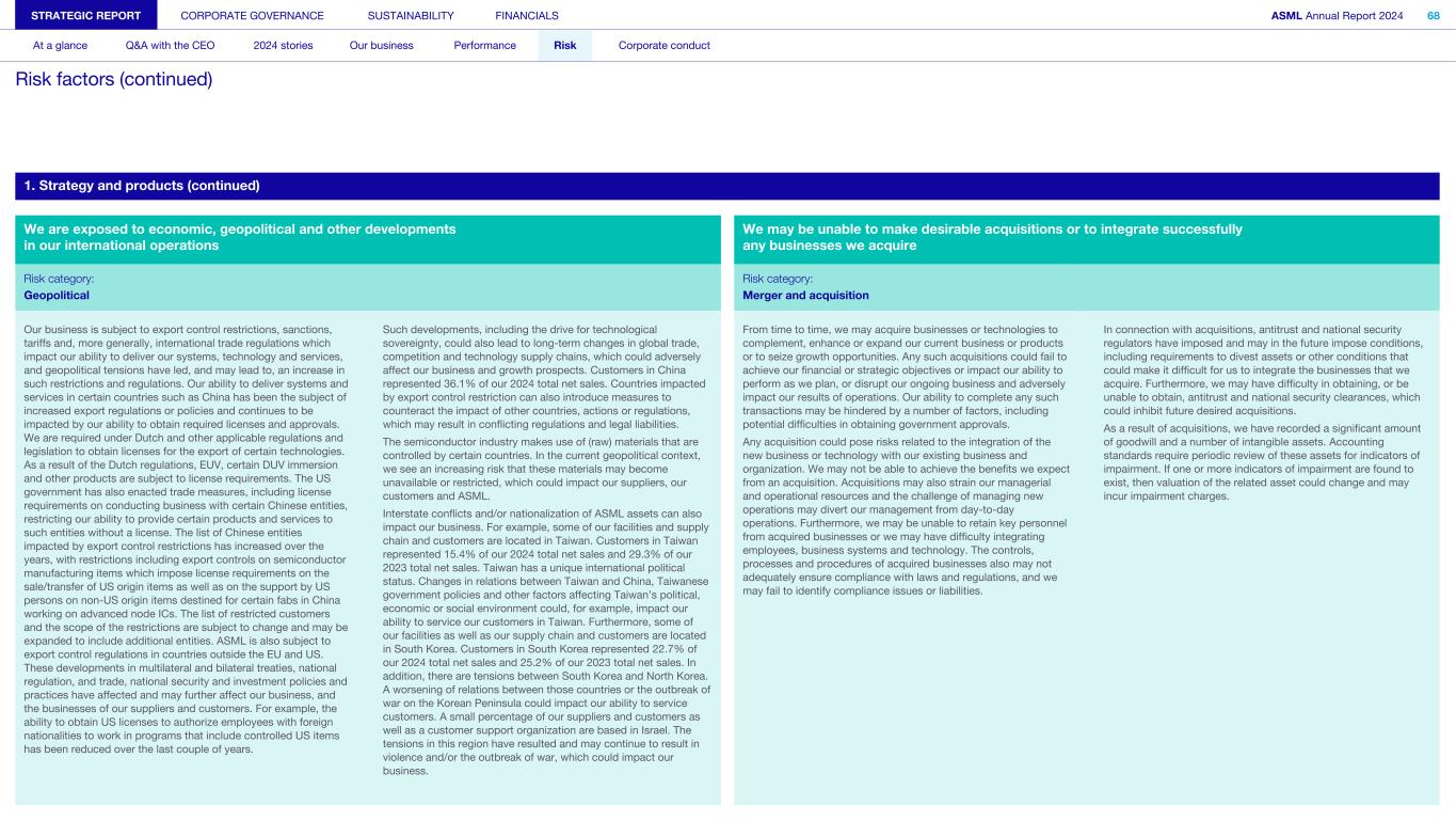 1. Strategy and products (continued) We are exposed to economic, geopolitical and other developments in our international operations We may be unable to make desirable acquisitions or to integrate successfully any businesses we acquire Risk category: Risk category: Geopolitical Merger and acquisition Our business is subject to export control restrictions, sanctions, tariffs and, more generally, international trade regulations which impact our ability to deliver our systems, technology and services, and geopolitical tensions have led, and may lead to, an increase in such restrictions and regulations. Our ability to deliver systems and services in certain countries such as China has been the subject of increased export regulations or policies and continues to be impacted by our ability to obtain required licenses and approvals. We are required under Dutch and other applicable regulations and legislation to obtain licenses for the export of certain technologies. As a result of the Dutch regulations, EUV, certain DUV immersion and other products are subject to license requirements. The US government has also enacted trade measures, including license requirements on conducting business with certain Chinese entities, restricting our ability to provide certain products and services to such entities without a license. The list of Chinese entities impacted by export control restrictions has increased over the years, with restrictions including export controls on semiconductor manufacturing items which impose license requirements on the sale/transfer of US origin items as well as on the support by US persons on non-US origin items destined for certain fabs in China working on advanced node ICs. The list of restricted customers and the scope of the restrictions are subject to change and may be expanded to include additional entities. ASML is also subject to export control regulations in countries outside the EU and US. These developments in multilateral and bilateral treaties, national regulation, and trade, national security and investment policies and practices have affected and may further affect our business, and the businesses of our suppliers and customers. For example, the ability to obtain US licenses to authorize employees with foreign nationalities to work in programs that include controlled US items has been reduced over the last couple of years. Such developments, including the drive for technological sovereignty, could also lead to long-term changes in global trade, competition and technology supply chains, which could adversely affect our business and growth prospects. Customers in China represented 36.1% of our 2024 total net sales. Countries impacted by export control restriction can also introduce measures to counteract the impact of other countries, actions or regulations, which may result in conflicting regulations and legal liabilities. The semiconductor industry makes use of (raw) materials that are controlled by certain countries. In the current geopolitical context, we see an increasing risk that these materials may become unavailable or restricted, which could impact our suppliers, our customers and ASML. Interstate conflicts and/or nationalization of ASML assets can also impact our business. For example, some of our facilities and supply chain and customers are located in Taiwan. Customers in Taiwan represented 15.4% of our 2024 total net sales and 29.3% of our 2023 total net sales. Taiwan has a unique international political status. Changes in relations between Taiwan and China, Taiwanese government policies and other factors affecting Taiwan’s political, economic or social environment could, for example, impact our ability to service our customers in Taiwan. Furthermore, some of our facilities as well as our supply chain and customers are located in South Korea. Customers in South Korea represented 22.7% of our 2024 total net sales and 25.2% of our 2023 total net sales. In addition, there are tensions between South Korea and North Korea. A worsening of relations between those countries or the outbreak of war on the Korean Peninsula could impact our ability to service customers. A small percentage of our suppliers and customers as well as a customer support organization are based in Israel. The tensions in this region have resulted and may continue to result in violence and/or the outbreak of war, which could impact our business. From time to time, we may acquire businesses or technologies to complement, enhance or expand our current business or products or to seize growth opportunities. Any such acquisitions could fail to achieve our financial or strategic objectives or impact our ability to perform as we plan, or disrupt our ongoing business and adversely impact our results of operations. Our ability to complete any such transactions may be hindered by a number of factors, including potential difficulties in obtaining government approvals. Any acquisition could pose risks related to the integration of the new business or technology with our existing business and organization. We may not be able to achieve the benefits we expect from an acquisition. Acquisitions may also strain our managerial and operational resources and the challenge of managing new operations may divert our management from day-to-day operations. Furthermore, we may be unable to retain key personnel from acquired businesses or we may have difficulty integrating employees, business systems and technology. The controls, processes and procedures of acquired businesses also may not adequately ensure compliance with laws and regulations, and we may fail to identify compliance issues or liabilities. In connection with acquisitions, antitrust and national security regulators have imposed and may in the future impose conditions, including requirements to divest assets or other conditions that could make it difficult for us to integrate the businesses that we acquire. Furthermore, we may have difficulty in obt