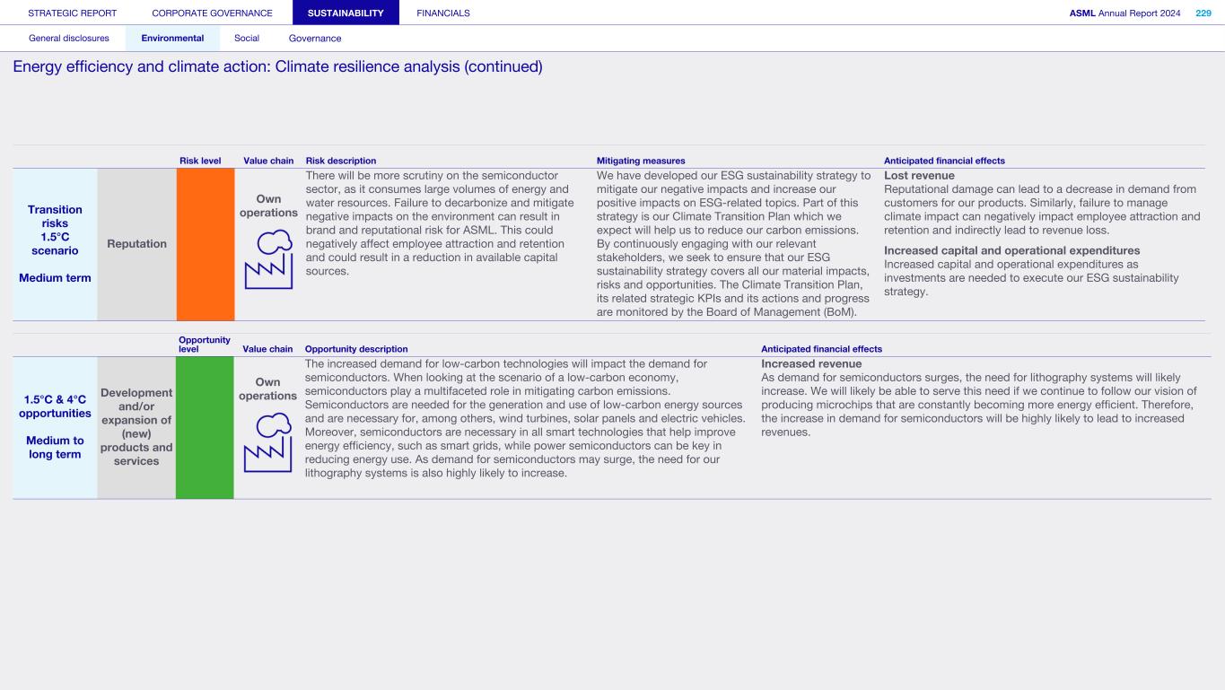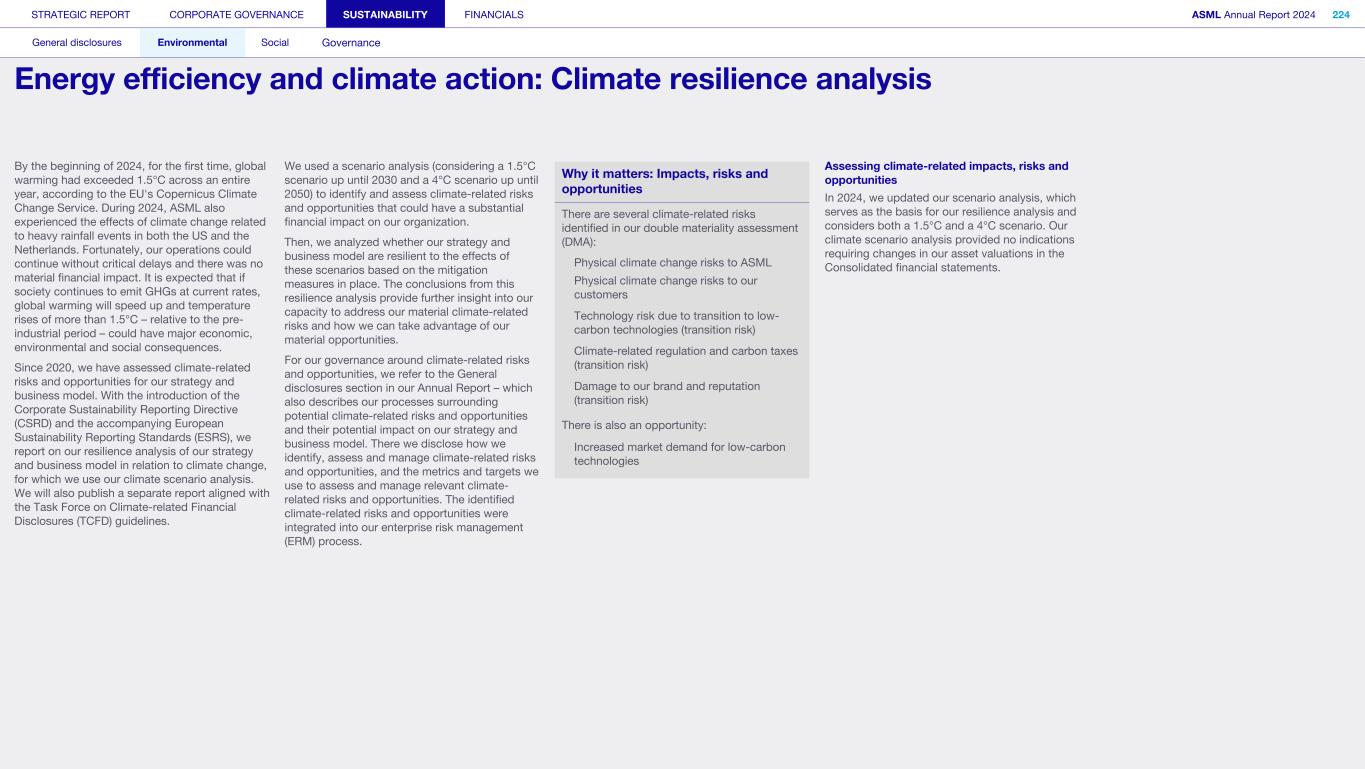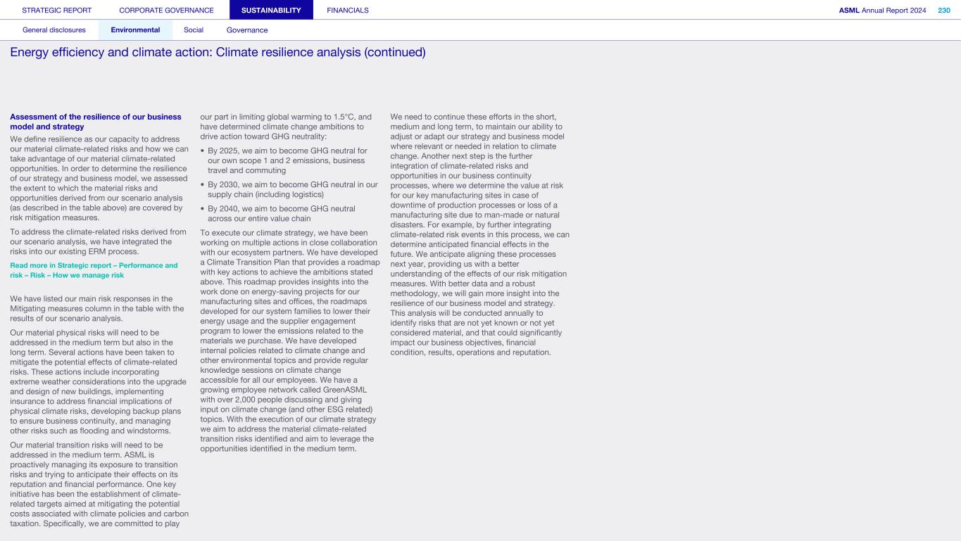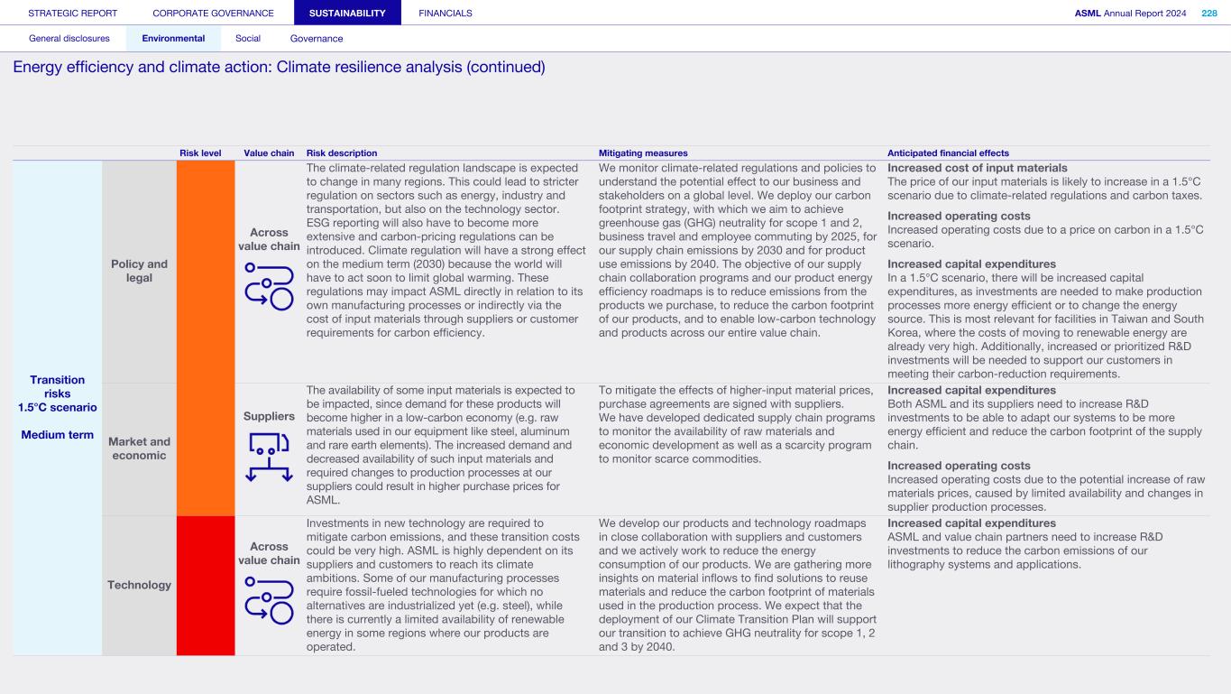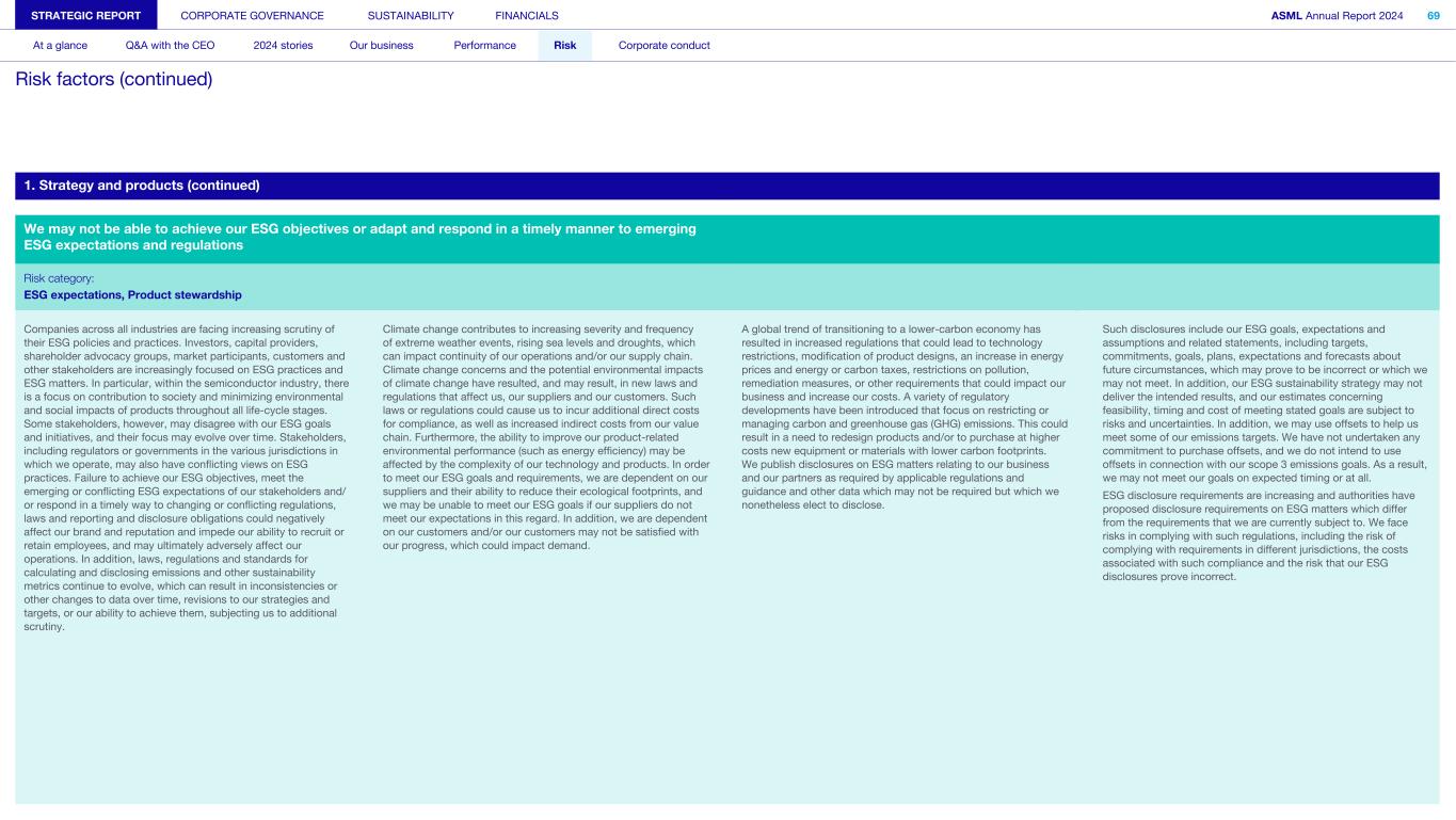 1. Strategy and products (continued) We may not be able to achieve our ESG objectives or adapt and respond in a timely manner to emerging ESG expectations and regulations Risk category: ESG expectations, Product stewardship Companies across all industries are facing increasing scrutiny of their ESG policies and practices. Investors, capital providers, shareholder advocacy groups, market participants, customers and other stakeholders are increasingly focused on ESG practices and ESG matters. In particular, within the semiconductor industry, there is a focus on contribution to society and minimizing environmental and social impacts of products throughout all life-cycle stages. Some stakeholders, however, may disagree with our ESG goals and initiatives, and their focus may evolve over time. Stakeholders, including regulators or governments in the various jurisdictions in which we operate, may also have conflicting views on ESG practices. Failure to achieve our ESG objectives, meet the emerging or conflicting ESG expectations of our stakeholders and/ or respond in a timely way to changing or conflicting regulations, laws and reporting and disclosure obligations could negatively affect our brand and reputation and impede our ability to recruit or retain employees, and may ultimately adversely affect our operations. In addition, laws, regulations and standards for calculating and disclosing emissions and other sustainability metrics continue to evolve, which can result in inconsistencies or other changes to data over time, revisions to our strategies and targets, or our ability to achieve them, subjecting us to additional scrutiny. Climate change contributes to increasing severity and frequency of extreme weather events, rising sea levels and droughts, which can impact continuity of our operations and/or our supply chain. Climate change concerns and the potential environmental impacts of climate change have resulted, and may result, in new laws and regulations that affect us, our suppliers and our customers. Such laws or regulations could cause us to incur additional direct costs for compliance, as well as increased indirect costs from our value chain. Furthermore, the ability to improve our product-related environmental performance (such as energy efficiency) may be affected by the complexity of our technology and products. In order to meet our ESG goals and requirements, we are dependent on our suppliers and their ability to reduce their ecological footprints, and we may be unable to meet our ESG goals if our suppliers do not meet our expectations in this regard. In addition, we are dependent on our customers and/or our customers may not be satisfied with our progress, which could impact demand. A global trend of transitioning to a lower-carbon economy has resulted in increased regulations that could lead to technology restrictions, modification of product designs, an increase in energy prices and energy or carbon taxes, restrictions on pollution, remediation measures, or other requirements that could impact our business and increase our costs. A variety of regulatory developments have been introduced that focus on restricting or managing carbon and greenhouse gas (GHG) emissions. This could result in a need to redesign products and/or to purchase at higher costs new equipment or materials with lower carbon footprints. We publish disclosures on ESG matters relating to our business and our partners as required by applicable regulations and guidance and other data which may not be required but which we nonetheless elect to disclose. Such disclosures include our ESG goals, expectations and assumptions and related statements, including targets, commitments, goals, plans, expectations and forecasts about future circumstances, which may prove to be incorrect or which we may not meet. In addition, our ESG sustainability strategy may not deliver the intended results, and our estimates concerning feasibility, timing and cost of meeting stated goals are subject to risks and uncertainties. In addition, we may use offsets to help us meet some of our emissions targets. We have not undertaken any commitment to purchase offsets, and we do not intend to use offsets in connection with our scope 3 emissions goals. As a result, we may not meet our goals on expected timing or at all. ESG disclosure requirements are increasing and authorities have proposed disclosure requirements on ESG matters which differ from the requirements that we are currently subject to. We face risks in complying with such regulations, including the risk of complying with requirements in different jurisdictions, the costs associated with such compliance and the risk that our ESG disclosures prove incorrect. STRATEGIC REPORT CORPORATE GOVERNANCE SUSTAINABILITY FINANCIALS ASML Annual Report 2024 69 At a glance Q&A with the CEO 2024 stories Our business Performance Risk Corporate conduct Risk factors (continued)