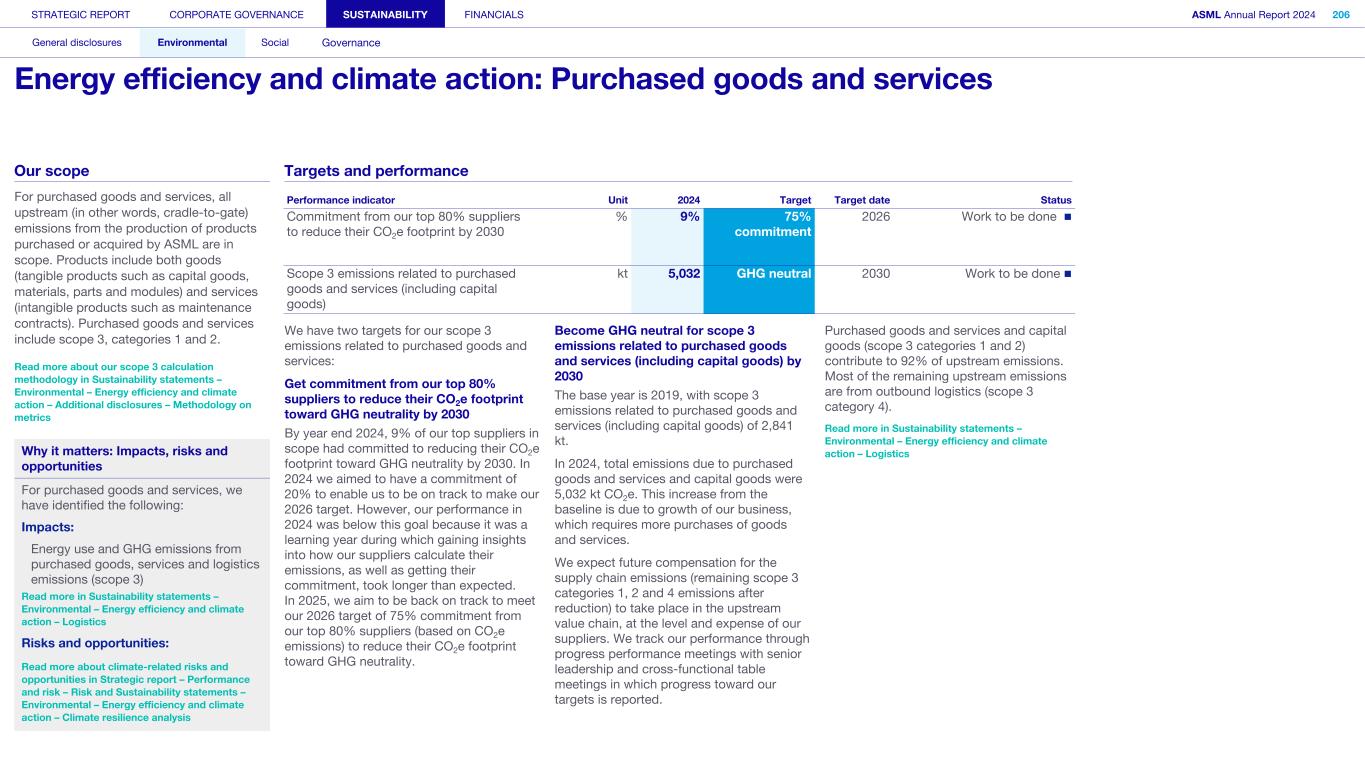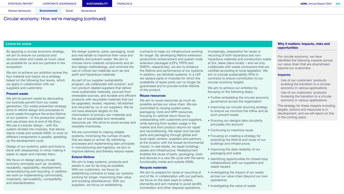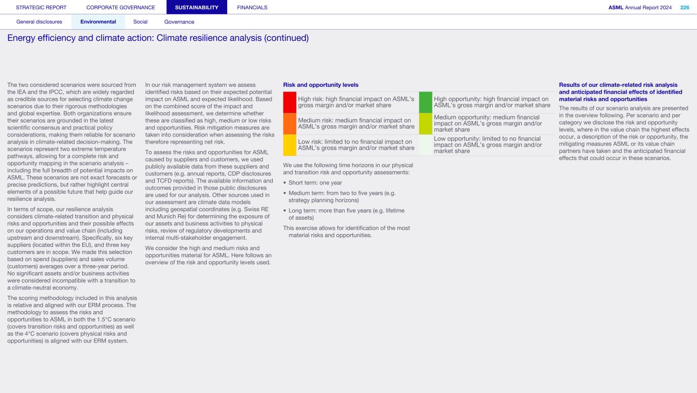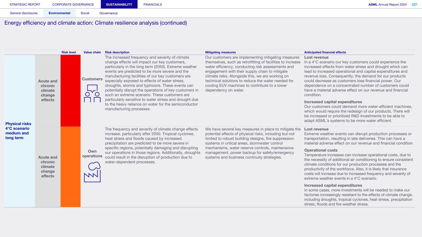 1. Strategy and products (continued) We may not be able to achieve our ESG objectives or adapt and respond in a timely manner to emerging ESG expectations and regulations Risk category: ESG expectations, Product stewardship Companies across all industries are facing increasing scrutiny of their ESG policies and practices. Investors, capital providers, shareholder advocacy groups, market participants, customers and other stakeholders are increasingly focused on ESG practices and ESG matters. In particular, within the semiconductor industry, there is a focus on contribution to society and minimizing environmental and social impacts of products throughout all life-cycle stages. Some stakeholders, however, may disagree with our ESG goals and initiatives, and their focus may evolve over time. Stakeholders, including regulators or governments in the various jurisdictions in which we operate, may also have conflicting views on ESG practices. Failure to achieve our ESG objectives, meet the emerging or conflicting ESG expectations of our stakeholders and/ or respond in a timely way to changing or conflicting regulations, laws and reporting and disclosure obligations could negatively affect our brand and reputation and impede our ability to recruit or retain employees, and may ultimately adversely affect our operations. In addition, laws, regulations and standards for calculating and disclosing emissions and other sustainability metrics continue to evolve, which can result in inconsistencies or other changes to data over time, revisions to our strategies and targets, or our ability to achieve them, subjecting us to additional scrutiny. Climate change contributes to increasing severity and frequency of extreme weather events, rising sea levels and droughts, which can impact continuity of our operations and/or our supply chain. Climate change concerns and the potential environmental impacts of climate change have resulted, and may result, in new laws and regulations that affect us, our suppliers and our customers. Such laws or regulations could cause us to incur additional direct costs for compliance, as well as increased indirect costs from our value chain. Furthermore, the ability to improve our product-related environmental performance (such as energy efficiency) may be affected by the complexity of our technology and products. In order to meet our ESG goals and requirements, we are dependent on our suppliers and their ability to reduce their ecological footprints, and we may be unable to meet our ESG goals if our suppliers do not meet our expectations in this regard. In addition, we are dependent on our customers and/or our customers may not be satisfied with our progress, which could impact demand. A global trend of transitioning to a lower-carbon economy has resulted in increased regulations that could lead to technology restrictions, modification of product designs, an increase in energy prices and energy or carbon taxes, restrictions on pollution, remediation measures, or other requirements that could impact our business and increase our costs. A variety of regulatory developments have been introduced that focus on restricting or managing carbon and greenhouse gas (GHG) emissions. This could result in a need to redesign products and/or to purchase at higher costs new equipment or materials with lower carbon footprints. We publish disclosures on ESG matters relating to our business and our partners as required by applicable regulations and guidance and other data which may not be required but which we nonetheless elect to disclose. Such disclosures include our ESG goals, expectations and assumptions and related statements, including targets, commitments, goals, plans, expectations and forecasts about future circumstances, which may prove to be incorrect or which we may not meet. In addition, our ESG sustainability strategy may not deliver the intended results, and our estimates concerning feasibility, timing and cost of meeting stated goals are subject to risks and uncertainties. In addition, we may use offsets to help us meet some of our emissions targets. We have not undertaken any commitment to purchase offsets, and we do not intend to use offsets in connection with our scope 3 emissions goals. As a result, we may not meet our goals on expected timing or at all. ESG disclosure requirements are increasing and authorities have proposed disclosure requirements on ESG matters which differ from the requirements that we are currently subject to. We face risks in complying with such regulations, including the risk of complying with requirements in different jurisdictions, the costs associated with such compliance and the risk that our ESG disclosures prove incorrect. STRATEGIC REPORT CORPORATE GOVERNANCE SUSTAINABILITY FINANCIALS ASML Annual Report 2024 69 At a glance Q&A with the CEO 2024 stories Our business Performance Risk Corporate conduct Risk factors (continued)