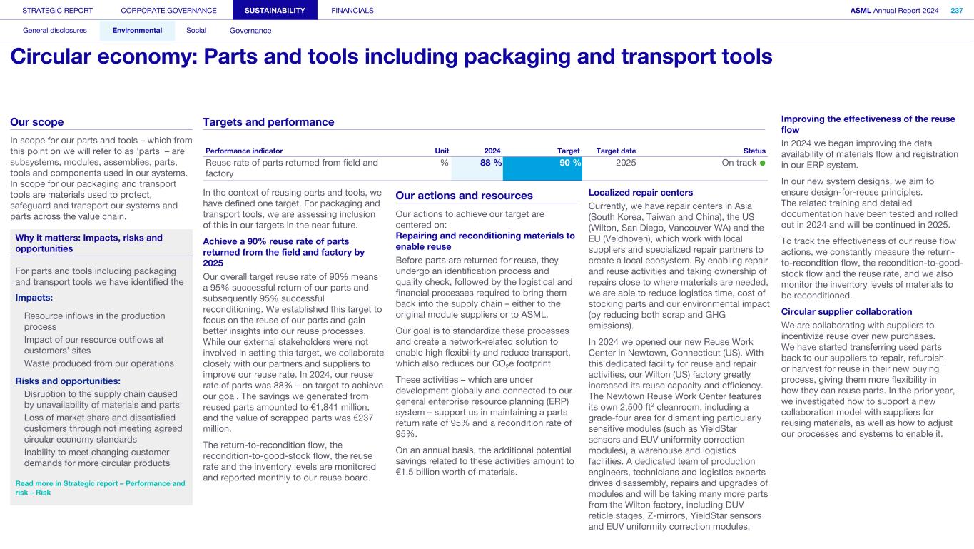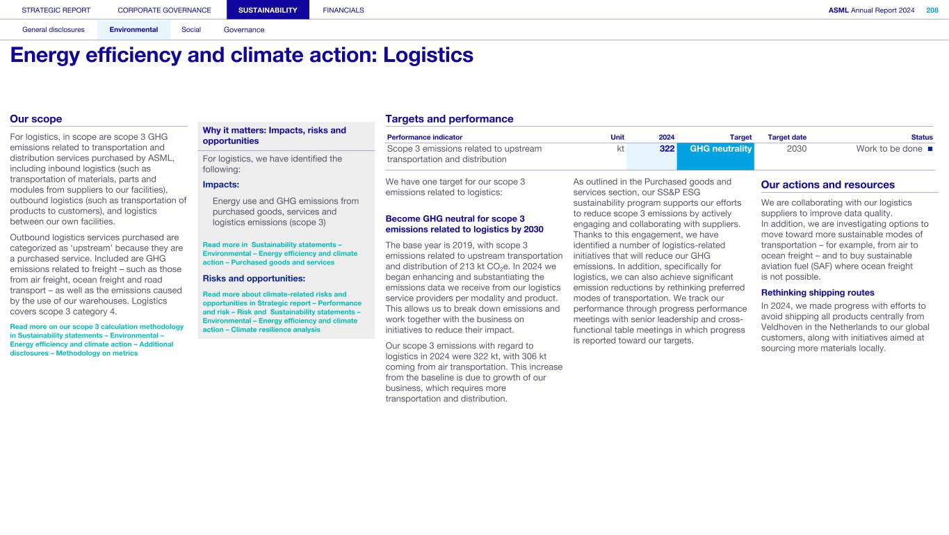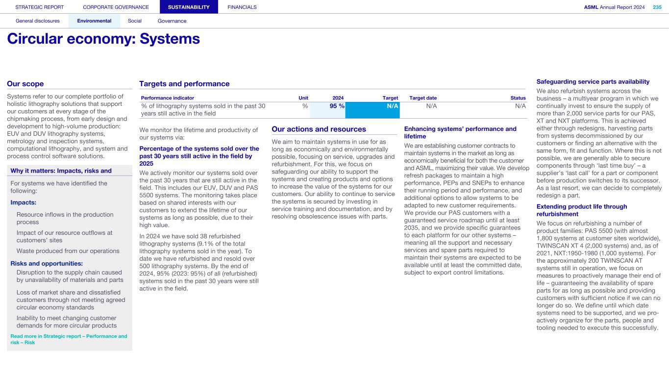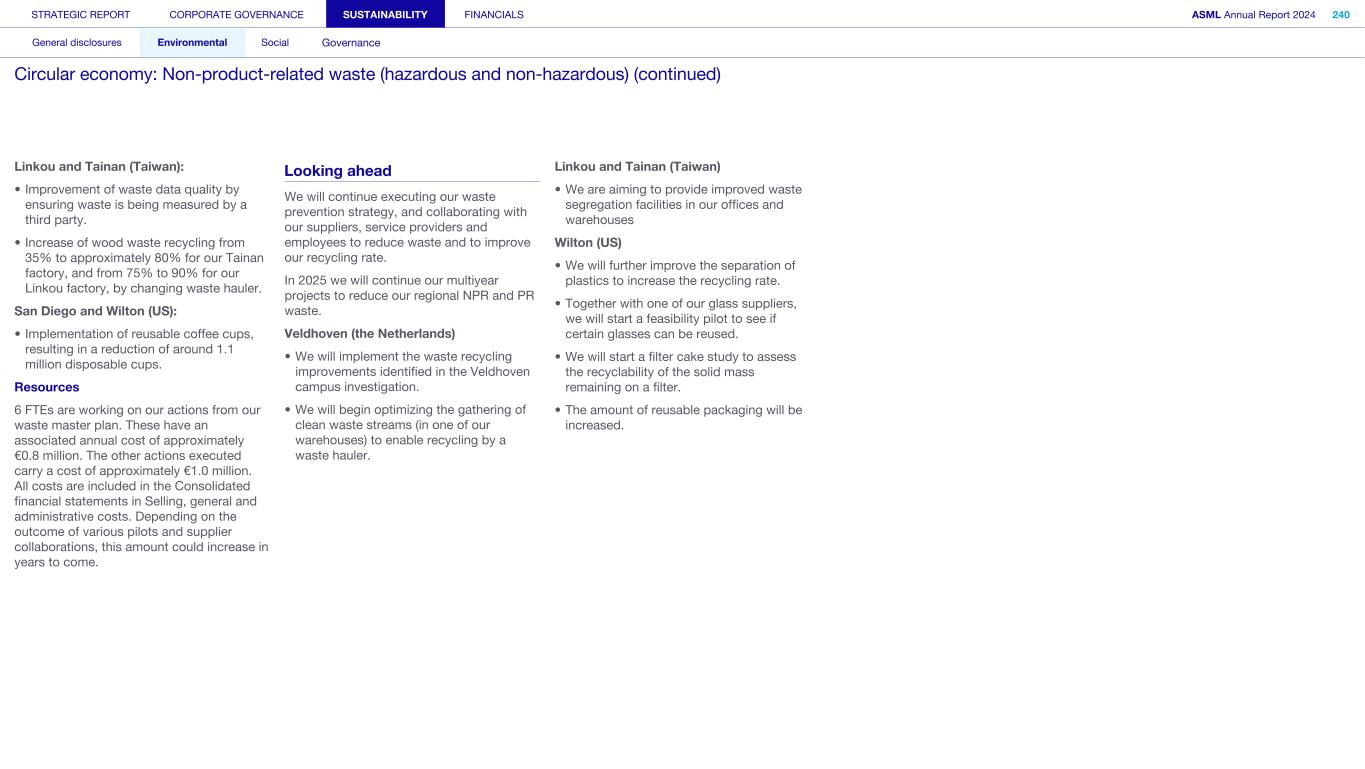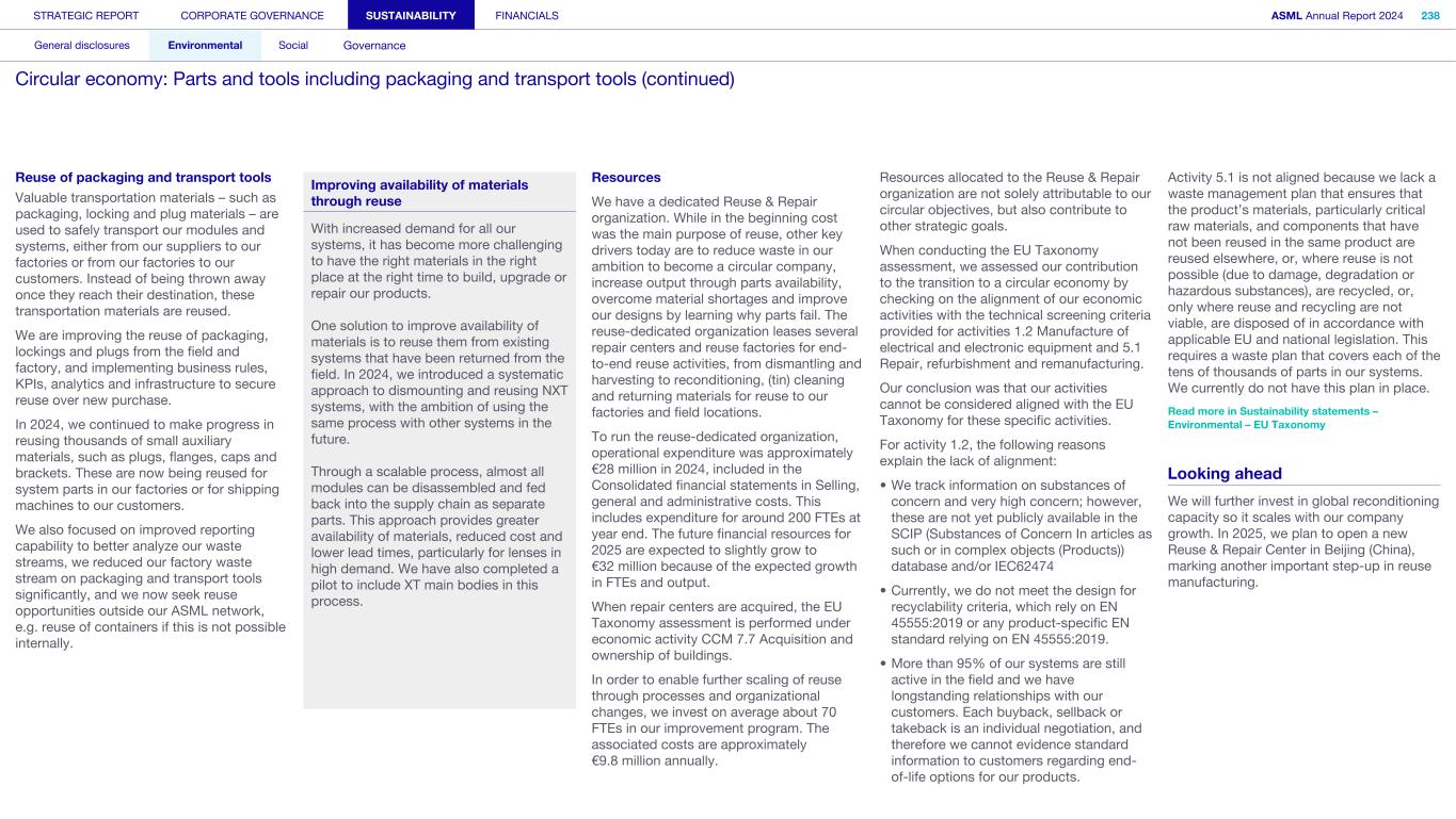1. Strategy and products (continued) We may not be able to achieve our ESG objectives or adapt and respond in a timely manner to emerging ESG expectations and regulations Risk category: ESG expectations, Product stewardship Companies across all industries are facing increasing scrutiny of their ESG policies and practices. Investors, capital providers, shareholder advocacy groups, market participants, customers and other stakeholders are increasingly focused on ESG practices and ESG matters. In particular, within the semiconductor industry, there is a focus on contribution to society and minimizing environmental and social impacts of products throughout all life-cycle stages. Some stakeholders, however, may disagree with our ESG goals and initiatives, and their focus may evolve over time. Stakeholders, including regulators or governments in the various jurisdictions in which we operate, may also have conflicting views on ESG practices. Failure to achieve our ESG objectives, meet the emerging or conflicting ESG expectations of our stakeholders and/ or respond in a timely way to changing or conflicting regulations, laws and reporting and disclosure obligations could negatively affect our brand and reputation and impede our ability to recruit or retain employees, and may ultimately adversely affect our operations. In addition, laws, regulations and standards for calculating and disclosing emissions and other sustainability metrics continue to evolve, which can result in inconsistencies or other changes to data over time, revisions to our strategies and targets, or our ability to achieve them, subjecting us to additional scrutiny. Climate change contributes to increasing severity and frequency of extreme weather events, rising sea levels and droughts, which can impact continuity of our operations and/or our supply chain. Climate change concerns and the potential environmental impacts of climate change have resulted, and may result, in new laws and regulations that affect us, our suppliers and our customers. Such laws or regulations could cause us to incur additional direct costs for compliance, as well as increased indirect costs from our value chain. Furthermore, the ability to improve our product-related environmental performance (such as energy efficiency) may be affected by the complexity of our technology and products. In order to meet our ESG goals and requirements, we are dependent on our suppliers and their ability to reduce their ecological footprints, and we may be unable to meet our ESG goals if our suppliers do not meet our expectations in this regard. In addition, we are dependent on our customers and/or our customers may not be satisfied with our progress, which could impact demand. A global trend of transitioning to a lower-carbon economy has resulted in increased regulations that could lead to technology restrictions, modification of product designs, an increase in energy prices and energy or carbon taxes, restrictions on pollution, remediation measures, or other requirements that could impact our business and increase our costs. A variety of regulatory developments have been introduced that focus on restricting or managing carbon and greenhouse gas (GHG) emissions. This could result in a need to redesign products and/or to purchase at higher costs new equipment or materials with lower carbon footprints. We publish disclosures on ESG matters relating to our business and our partners as required by applicable regulations and guidance and other data which may not be required but which we nonetheless elect to disclose. Such disclosures include our ESG goals, expectations and assumptions and related statements, including targets, commitments, goals, plans, expectations and forecasts about future circumstances, which may prove to be incorrect or which we may not meet. In addition, our ESG sustainability strategy may not deliver the intended results, and our estimates concerning feasibility, timing and cost of meeting stated goals are subject to risks and uncertainties. In addition, we may use offsets to help us meet some of our emissions targets. We have not undertaken any commitment to purchase offsets, and we do not intend to use offsets in connection with our scope 3 emissions goals. As a result, we may not meet our goals on expected timing or at all. ESG disclosure requirements are increasing and authorities have proposed disclosure requirements on ESG matters which differ from the requirements that we are currently subject to. We face risks in complying with such regulations, including the risk of complying with requirements in different jurisdictions, the costs associated with such compliance and the risk that our ESG disclosures prove incorrect. STRATEGIC REPORT CORPORATE GOVERNANCE SUSTAINABILITY FINANCIALS ASML Annual Report 2024 69 At a glance Q&A with the CEO 2024 stories Our business Performance Risk Corporate conduct Risk factors (continued)