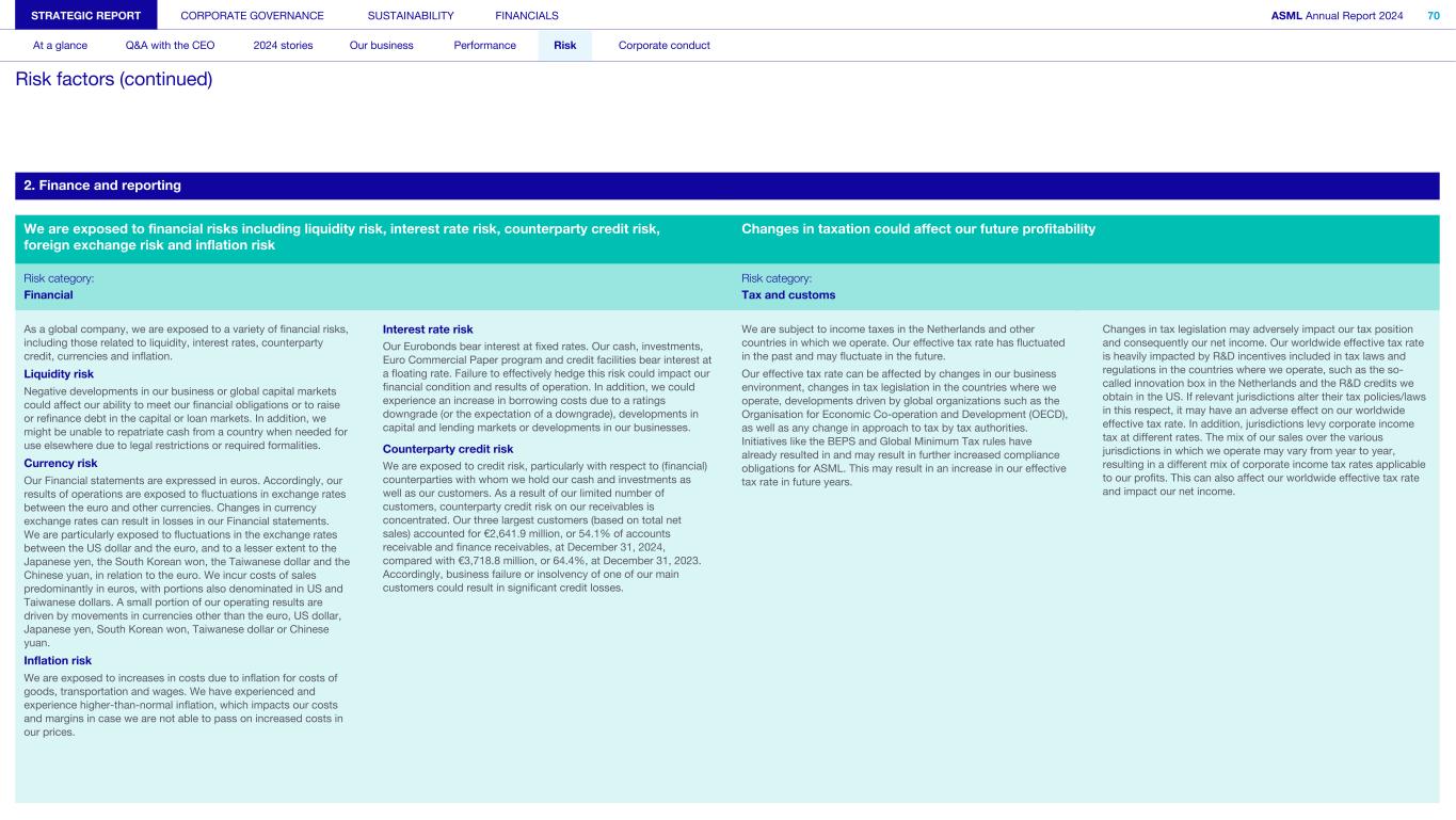 2. Finance and reporting We are exposed to financial risks including liquidity risk, interest rate risk, counterparty credit risk, foreign exchange risk and inflation risk Changes in taxation could affect our future profitability Risk category: Risk category: Financial Tax and customs As a global company, we are exposed to a variety of financial risks, including those related to liquidity, interest rates, counterparty credit, currencies and inflation. Liquidity risk Negative developments in our business or global capital markets could affect our ability to meet our financial obligations or to raise or refinance debt in the capital or loan markets. In addition, we might be unable to repatriate cash from a country when needed for use elsewhere due to legal restrictions or required formalities. Currency risk Our Financial statements are expressed in euros. Accordingly, our results of operations are exposed to fluctuations in exchange rates between the euro and other currencies. Changes in currency exchange rates can result in losses in our Financial statements. We are particularly exposed to fluctuations in the exchange rates between the US dollar and the euro, and to a lesser extent to the Japanese yen, the South Korean won, the Taiwanese dollar and the Chinese yuan, in relation to the euro. We incur costs of sales predominantly in euros, with portions also denominated in US and Taiwanese dollars. A small portion of our operating results are driven by movements in currencies other than the euro, US dollar, Japanese yen, South Korean won, Taiwanese dollar or Chinese yuan. Inflation risk We are exposed to increases in costs due to inflation for costs of goods, transportation and wages. We have experienced and experience higher-than-normal inflation, which impacts our costs and margins in case we are not able to pass on increased costs in our prices. Interest rate risk We are subject to income taxes in the Netherlands and other countries in which we operate. Our effective tax rate has fluctuated in the past and may fluctuate in the future. Our effective tax rate can be affected by changes in our business environment, changes in tax legislation in the countries where we operate, developments driven by global organizations such as the Organisation for Economic Co-operation and Development (OECD), as well as any change in approach to tax by tax authorities. Initiatives like the BEPS and Global Minimum Tax rules have already resulted in and may result in further increased compliance obligations for ASML. This may result in an increase in our effective tax rate in future years. Changes in tax legislation may adversely impact our tax position and consequently our net income. Our worldwide effective tax rate is heavily impacted by R&D incentives included in tax laws and regulations in the countries where we operate, such as the so- called innovation box in the Netherlands and the R&D credits we obtain in the US. If relevant jurisdictions alter their tax policies/laws in this respect, it may have an adverse effect on our worldwide effective tax rate. In addition, jurisdictions levy corporate income tax at different rates. The mix of our sales over the various jurisdictions in which we operate may vary from year to year, resulting in a different mix of corporate income tax rates applicable to our profits. This can also affect our worldwide effective tax rate and impact our net income. Our Eurobonds bear interest at fixed rates. Our cash, investments, Euro Commercial Paper program and credit facilities bear interest at a floating rate. Failure to effectively hedge this risk could impact our financial condition and results of operation. In addition, we could experience an increase in borrowing costs due to a ratings downgrade (or the expectation of a downgrade), developments in capital and lending markets or developments in our businesses. Counterparty credit risk We are exposed to credit risk, particularly with respect to (financial) counterparties with whom we hold our cash and investments as well as our customers. As a result of our limited number of customers, counterparty credit risk on our receivables is concentrated. Our three largest customers (based on total net sales) accounted for €2,641.9 million, or 54.1% of accounts receivable and finance receivables, at December 31, 2024, compared with €3,718.8 million, or 64.4%, at December 31, 2023. Accordingly, business failure or insolvency of one of our main customers could result in significant credit losses. STRATEGIC REPORT CORPORATE GOVERNANCE SUSTAINABILITY FINANCIALS ASML Annual Report 2024 70 At a glance Q&A with the CEO 2024 stories Our business Performance Risk Corporate conduct Risk factors (continued)