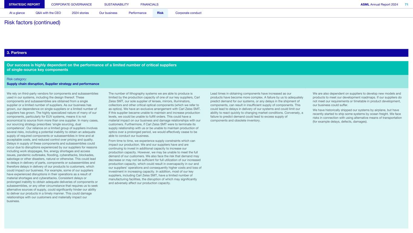 3. Partners Our success is highly dependent on the performance of a limited number of critical suppliers of single-source key components Risk category: Supply chain disruption, Supplier strategy and performance We rely on third-party vendors for components and subassemblies used in our systems, including the design thereof. These components and subassemblies are obtained from a single supplier or a limited number of suppliers. As our business has grown, our dependence on single suppliers or a limited number of suppliers has grown. The highly specialized nature of many of our components, particularly for EUV systems, means it is not economical to source from more than one supplier. In many cases, our sourcing strategy prescribes ‘single sourcing, dual competence’. Our reliance on a limited group of suppliers involves several risks, including a potential inability to obtain an adequate supply of required components or subassemblies in time and at acceptable costs, and reduced control over pricing and quality. Delays in supply of these components and subassemblies could occur due to disruptions experienced by our suppliers for reasons including work stoppages, fire, energy shortages and access issues, pandemic outbreaks, flooding, cyberattacks, blockades, sabotage or other disasters, natural or otherwise. This could lead to delays in delivery of parts, components or subassemblies and therefore delays in delivery of our products to customers, which could impact our business. For example, some of our suppliers have experienced disruptions in their operations as a result of material shortages and cyberattacks. Consistent delays or prolonged inability to obtain adequate deliveries of components or subassemblies, or any other circumstance that requires us to seek alternative sources of supply, could significantly hinder our ability to deliver our products in a timely manner. This could damage relationships with our customers and materially impact our business. The number of lithography systems we are able to produce is limited by the production capacity of one of our key suppliers, Carl Zeiss SMT, our sole supplier of lenses, mirrors, illuminators, collectors and other critical optical components (which we refer to as optics). We have an exclusive arrangement with Carl Zeiss SMT. If this supplier became unable to maintain and increase production levels, we could be unable to fulfill orders. This could have a material impact on our business and damage relationships with our customers. Furthermore, if Carl Zeiss SMT were to terminate its supply relationship with us or be unable to maintain production of optics over a prolonged period, we would effectively cease to be able to conduct our business. From time to time, we experience supply constraints which can impact our production. We and our suppliers have and are continuing to invest in additional capacity to increase our production capacity. However, we may be unable to meet the full demand of our customers. We also face the risk that demand may decrease or may not be sufficient for full utilization of our increased production capacity, which could result in overcapacity in our and our suppliers’ operations and consequently higher costs and loss of investment in increasing capacity. In addition, most of our key suppliers, including Carl Zeiss SMT, have a limited number of manufacturing facilities, the disruption of which may significantly and adversely affect our production capacity. Lead times in obtaining components have increased as our products have become more complex. A failure by us to adequately predict demand for our systems, or any delays in the shipment of components, can result in insufficient supply of components. This could lead to delays in delivery of our systems and could limit our ability to react quickly to changing market conditions. Conversely, a failure to predict demand could lead to excess supply of components and obsolete inventory. We are also dependent on suppliers to develop new models and products to meet our development roadmaps. If our suppliers do not meet our requirements or timetable in product development, our business could suffer. We have historically shipped our systems by airplane, but have recently started to ship some systems by ocean freight. We face risks in connection with using alternative means of transportation (for example delays, defects, damages). STRATEGIC REPORT CORPORATE GOVERNANCE SUSTAINABILITY FINANCIALS ASML Annual Report 2024 71 At a glance Q&A with the CEO 2024 stories Our business Performance Risk Corporate conduct Risk factors (continued)