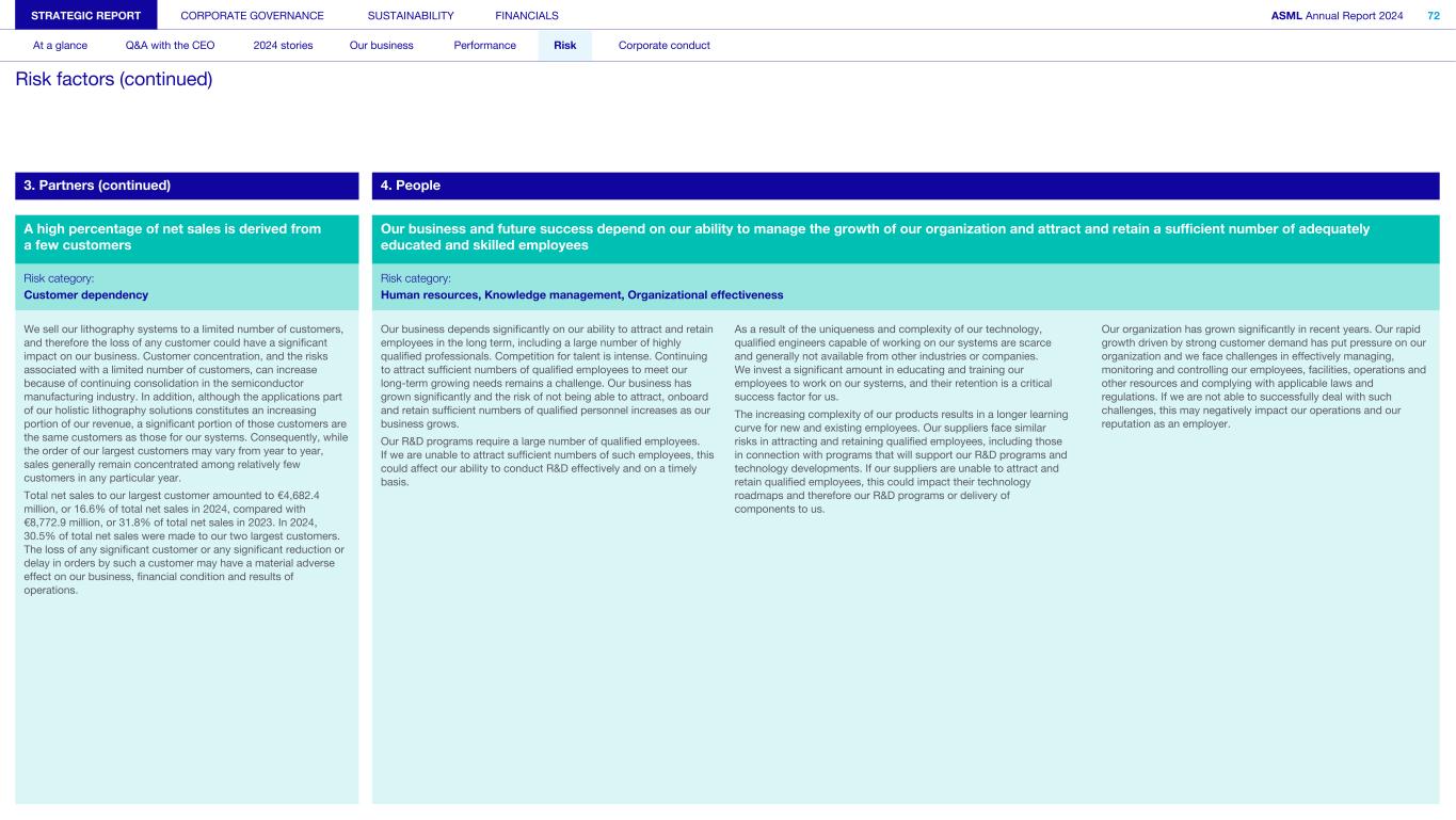 3. Partners (continued) 4. People A high percentage of net sales is derived from a few customers Our business and future success depend on our ability to manage the growth of our organization and attract and retain a sufficient number of adequately educated and skilled employees Risk category: Risk category: Customer dependency Human resources, Knowledge management, Organizational effectiveness We sell our lithography systems to a limited number of customers, and therefore the loss of any customer could have a significant impact on our business. Customer concentration, and the risks associated with a limited number of customers, can increase because of continuing consolidation in the semiconductor manufacturing industry. In addition, although the applications part of our holistic lithography solutions constitutes an increasing portion of our revenue, a significant portion of those customers are the same customers as those for our systems. Consequently, while the order of our largest customers may vary from year to year, sales generally remain concentrated among relatively few customers in any particular year. Total net sales to our largest customer amounted to €4,682.4 million, or 16.6% of total net sales in 2024, compared with €8,772.9 million, or 31.8% of total net sales in 2023. In 2024, 30.5% of total net sales were made to our two largest customers. The loss of any significant customer or any significant reduction or delay in orders by such a customer may have a material adverse effect on our business, financial condition and results of operations. Our business depends significantly on our ability to attract and retain employees in the long term, including a large number of highly qualified professionals. Competition for talent is intense. Continuing to attract sufficient numbers of qualified employees to meet our long-term growing needs remains a challenge. Our business has grown significantly and the risk of not being able to attract, onboard and retain sufficient numbers of qualified personnel increases as our business grows. Our R&D programs require a large number of qualified employees. If we are unable to attract sufficient numbers of such employees, this could affect our ability to conduct R&D effectively and on a timely basis. As a result of the uniqueness and complexity of our technology, qualified engineers capable of working on our systems are scarce and generally not available from other industries or companies. We invest a significant amount in educating and training our employees to work on our systems, and their retention is a critical success factor for us. The increasing complexity of our products results in a longer learning curve for new and existing employees. Our suppliers face similar risks in attracting and retaining qualified employees, including those in connection with programs that will support our R&D programs and technology developments. If our suppliers are unable to attract and retain qualified employees, this could impact their technology roadmaps and therefore our R&D programs or delivery of components to us. Our organization has grown significantly in recent years. Our rapid growth driven by strong customer demand has put pressure on our organization and we face challenges in effectively managing, monitoring and controlling our employees, facilities, operations and other resources and complying with applicable laws and regulations. If we are not able to successfully deal with such challenges, this may negatively impact our operations and our reputation as an employer. STRATEGIC REPORT CORPORATE GOVERNANCE SUSTAINABILITY FINANCIALS ASML Annual Report 2024 72 At a glance Q&A with the CEO 2024 stories Our business Performance Risk Corporate conduct Risk factors (continued)
