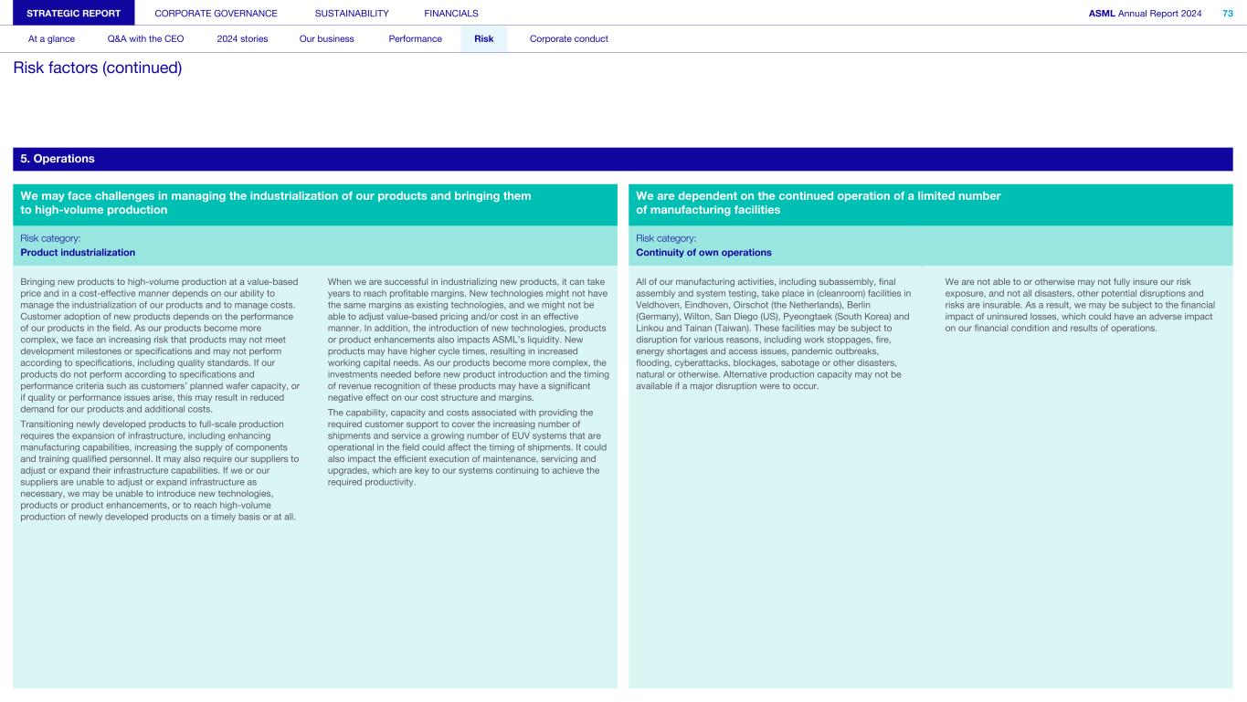 5. Operations We may face challenges in managing the industrialization of our products and bringing them to high-volume production We are dependent on the continued operation of a limited number of manufacturing facilities Risk category: Risk category: Product industrialization Continuity of own operations Bringing new products to high-volume production at a value-based price and in a cost-effective manner depends on our ability to manage the industrialization of our products and to manage costs. Customer adoption of new products depends on the performance of our products in the field. As our products become more complex, we face an increasing risk that products may not meet development milestones or specifications and may not perform according to specifications, including quality standards. If our products do not perform according to specifications and performance criteria such as customers’ planned wafer capacity, or if quality or performance issues arise, this may result in reduced demand for our products and additional costs. Transitioning newly developed products to full-scale production requires the expansion of infrastructure, including enhancing manufacturing capabilities, increasing the supply of components and training qualified personnel. It may also require our suppliers to adjust or expand their infrastructure capabilities. If we or our suppliers are unable to adjust or expand infrastructure as necessary, we may be unable to introduce new technologies, products or product enhancements, or to reach high-volume production of newly developed products on a timely basis or at all. When we are successful in industrializing new products, it can take years to reach profitable margins. New technologies might not have the same margins as existing technologies, and we might not be able to adjust value-based pricing and/or cost in an effective manner. In addition, the introduction of new technologies, products or product enhancements also impacts ASML’s liquidity. New products may have higher cycle times, resulting in increased working capital needs. As our products become more complex, the investments needed before new product introduction and the timing of revenue recognition of these products may have a significant negative effect on our cost structure and margins. The capability, capacity and costs associated with providing the required customer support to cover the increasing number of shipments and service a growing number of EUV systems that are operational in the field could affect the timing of shipments. It could also impact the efficient execution of maintenance, servicing and upgrades, which are key to our systems continuing to achieve the required productivity. All of our manufacturing activities, including subassembly, final assembly and system testing, take place in (cleanroom) facilities in Veldhoven, Eindhoven, Oirschot (the Netherlands), Berlin (Germany), Wilton, San Diego (US), Pyeongtaek (South Korea) and Linkou and Tainan (Taiwan). These facilities may be subject to disruption for various reasons, including work stoppages, fire, energy shortages and access issues, pandemic outbreaks, flooding, cyberattacks, blockages, sabotage or other disasters, natural or otherwise. Alternative production capacity may not be available if a major disruption were to occur. We are not able to or otherwise may not fully insure our risk exposure, and not all disasters, other potential disruptions and risks are insurable. As a result, we may be subject to the financial impact of uninsured losses, which could have an adverse impact on our financial condition and results of operations. STRATEGIC REPORT CORPORATE GOVERNANCE SUSTAINABILITY FINANCIALS ASML Annual Report 2024 73 At a glance Q&A with the CEO 2024 stories Our business Performance Risk Corporate conduct Risk factors (continued)