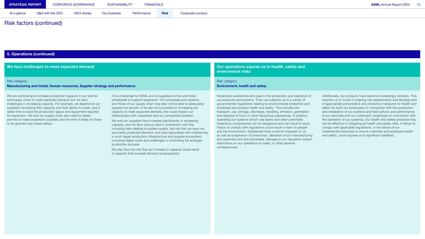 5. Operations (continued) We face challenges to meet expected demand Our operations expose us to health, safety and environment risks Risk category: Risk category: Manufacturing and install, Human resources, Supplier strategy and performance Environment, health and safety We are continuing to increase production capacity in our end-to- end supply chain to meet expected demand, but we face challenges in increasing capacity. For example, we depend on our suppliers increasing their capacity and their ability to invest, and it takes time to build the production space and equipment required for expansion. We and our supply chain also need to obtain permits to make expansion possible, and the time it takes for these to be granted may cause delays. It is a challenge for ASML and its suppliers to hire and retain employees to support expansion. Our processes and systems and those of our supply chain may also not be able to adequately support our growth. If we are not successful in increasing our capacity to meet expected demand, this could impact our relationships with customers and our competitive position. We and our suppliers have invested significantly in increasing capacity, and we face various risks in connection with this, including risks relating to system quality, the risk that we have not accurately predicted demand, and risks associated with maintaining a much larger production infrastructure and supplier ecosystem, including higher costs and challenges in controlling the enlarged production process. We also face the risk that our increase in capacity could result in capacity that exceeds demand (overcapacity). Hazardous substances are used in the production and operation of our products and systems. Their use subjects us to a variety of governmental regulations relating to environmental protection and employee and product health and safety. This includes the transport, use, storage, discharge, handling, emission, generation and disposal of toxic or other hazardous substances. In addition, operating our systems (which use lasers and other potentially hazardous components) can be dangerous and can result in injury. Failure to comply with regulations could result in harm to people and the environment. Substantial fines could be imposed on us, as well as suspension of production, alteration of our manufacturing and assembly and test processes, damage to our reputation and/or restrictions on our operations or sales, or other adverse consequences. Additionally, our products have become increasingly complex. This requires us to invest in ongoing risk assessments and development of appropriate preventative and protective measures for health and safety for both our employees (in connection with the production and installation of our systems and field options and performance of our services) and our customers’ employees (in connection with the operation of our systems). Our health and safety practices may not be effective in mitigating all health and safety risks. A failure to comply with applicable regulations, or the failure of our implemented practices to ensure customer and employee health and safety, could expose us to significant liabilities. STRATEGIC REPORT CORPORATE GOVERNANCE SUSTAINABILITY FINANCIALS ASML Annual Report 2024 74 At a glance Q&A with the CEO 2024 stories Our business Performance Risk Corporate conduct Risk factors (continued)