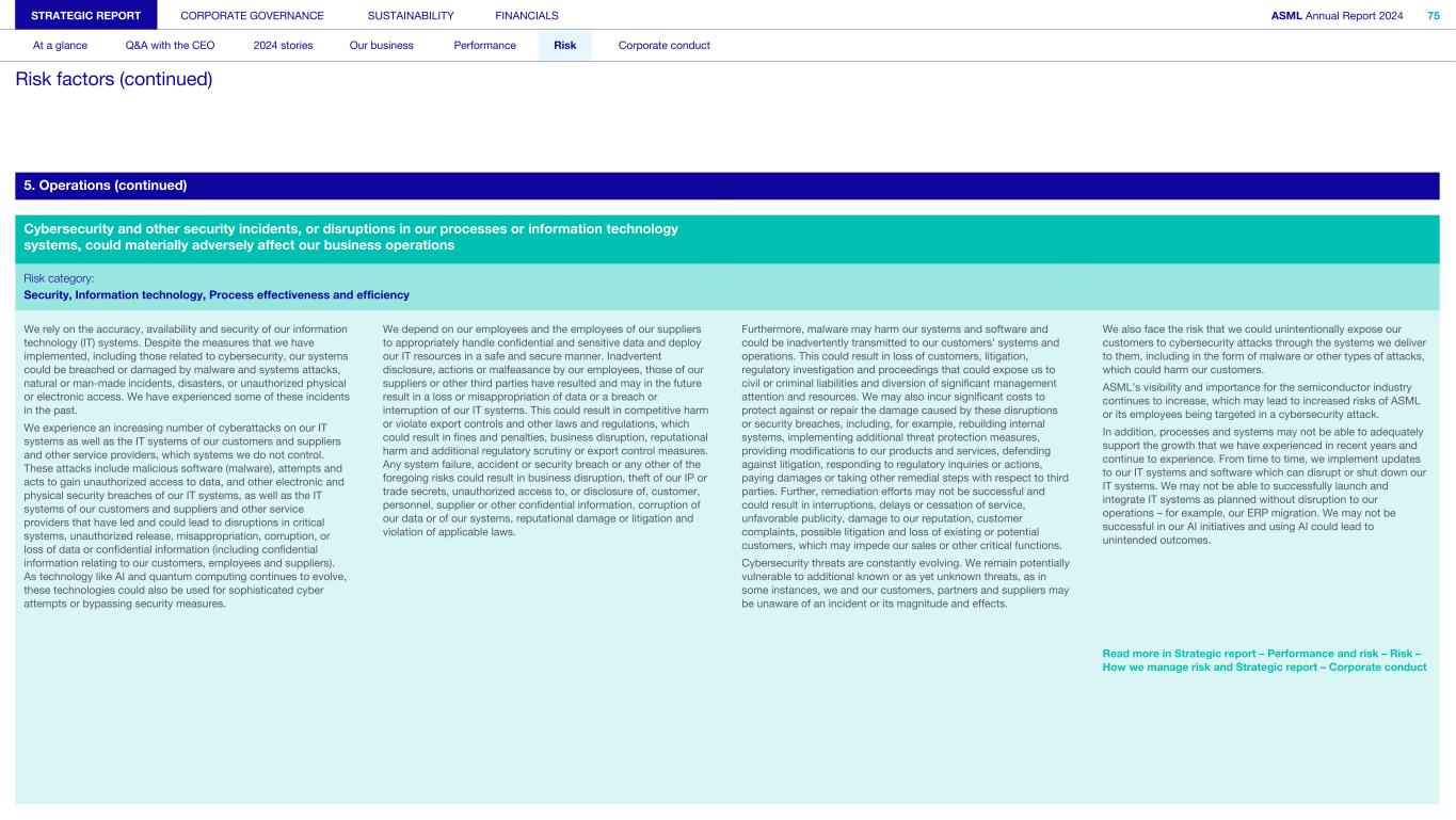 5. Operations (continued) Cybersecurity and other security incidents, or disruptions in our processes or information technology systems, could materially adversely affect our business operations Risk category: Security, Information technology, Process effectiveness and efficiency We rely on the accuracy, availability and security of our information technology (IT) systems. Despite the measures that we have implemented, including those related to cybersecurity, our systems could be breached or damaged by malware and systems attacks, natural or man-made incidents, disasters, or unauthorized physical or electronic access. We have experienced some of these incidents in the past. We experience an increasing number of cyberattacks on our IT systems as well as the IT systems of our customers and suppliers and other service providers, which systems we do not control. These attacks include malicious software (malware), attempts and acts to gain unauthorized access to data, and other electronic and physical security breaches of our IT systems, as well as the IT systems of our customers and suppliers and other service providers that have led and could lead to disruptions in critical systems, unauthorized release, misappropriation, corruption, or loss of data or confidential information (including confidential information relating to our customers, employees and suppliers). As technology like AI and quantum computing continues to evolve, these technologies could also be used for sophisticated cyber attempts or bypassing security measures. We depend on our employees and the employees of our suppliers to appropriately handle confidential and sensitive data and deploy our IT resources in a safe and secure manner. Inadvertent disclosure, actions or malfeasance by our employees, those of our suppliers or other third parties have resulted and may in the future result in a loss or misappropriation of data or a breach or interruption of our IT systems. This could result in competitive harm or violate export controls and other laws and regulations, which could result in fines and penalties, business disruption, reputational harm and additional regulatory scrutiny or export control measures. Any system failure, accident or security breach or any other of the foregoing risks could result in business disruption, theft of our IP or trade secrets, unauthorized access to, or disclosure of, customer, personnel, supplier or other confidential information, corruption of our data or of our systems, reputational damage or litigation and violation of applicable laws. Furthermore, malware may harm our systems and software and could be inadvertently transmitted to our customers’ systems and operations. This could result in loss of customers, litigation, regulatory investigation and proceedings that could expose us to civil or criminal liabilities and diversion of significant management attention and resources. We may also incur significant costs to protect against or repair the damage caused by these disruptions or security breaches, including, for example, rebuilding internal systems, implementing additional threat protection measures, providing modifications to our products and services, defending against litigation, responding to regulatory inquiries or actions, paying damages or taking other remedial steps with respect to third parties. Further, remediation efforts may not be successful and could result in interruptions, delays or cessation of service, unfavorable publicity, damage to our reputation, customer complaints, possible litigation and loss of existing or potential customers, which may impede our sales or other critical functions. Cybersecurity threats are constantly evolving. We remain potentially vulnerable to additional known or as yet unknown threats, as in some instances, we and our customers, partners and suppliers may be unaware of an incident or its magnitude and effects. We also face the risk that we could unintentionally expose our customers to cybersecurity attacks through the systems we deliver to them, including in the form of malware or other types of attacks, which could harm our customers. ASML’s visibility and importance for the semiconductor industry continues to increase, which may lead to increased risks of ASML or its employees being targeted in a cybersecurity attack. In addition, processes and systems may not be able to adequately support the growth that we have experienced in recent years and continue to experience. From time to time, we implement updates to our IT systems and software which can disrupt or shut down our IT systems. We may not be able to successfully launch and integrate IT systems as planned without disruption to our operations – for example, our ERP migration. We may not be successful in our AI initiatives and using AI could lead to unintended outcomes. Read more in Strategic report – Performance and risk – Risk – How we manage risk and Strategic report – Corporate conduct STRATEGIC REPORT CORPORATE GOVERNANCE SUSTAINABILITY FINANCIALS ASML Annual Report 2024 75 At a glance Q&A with the CEO 2024 stories Our business Performance Risk Corporate conduct Risk factors (continued)