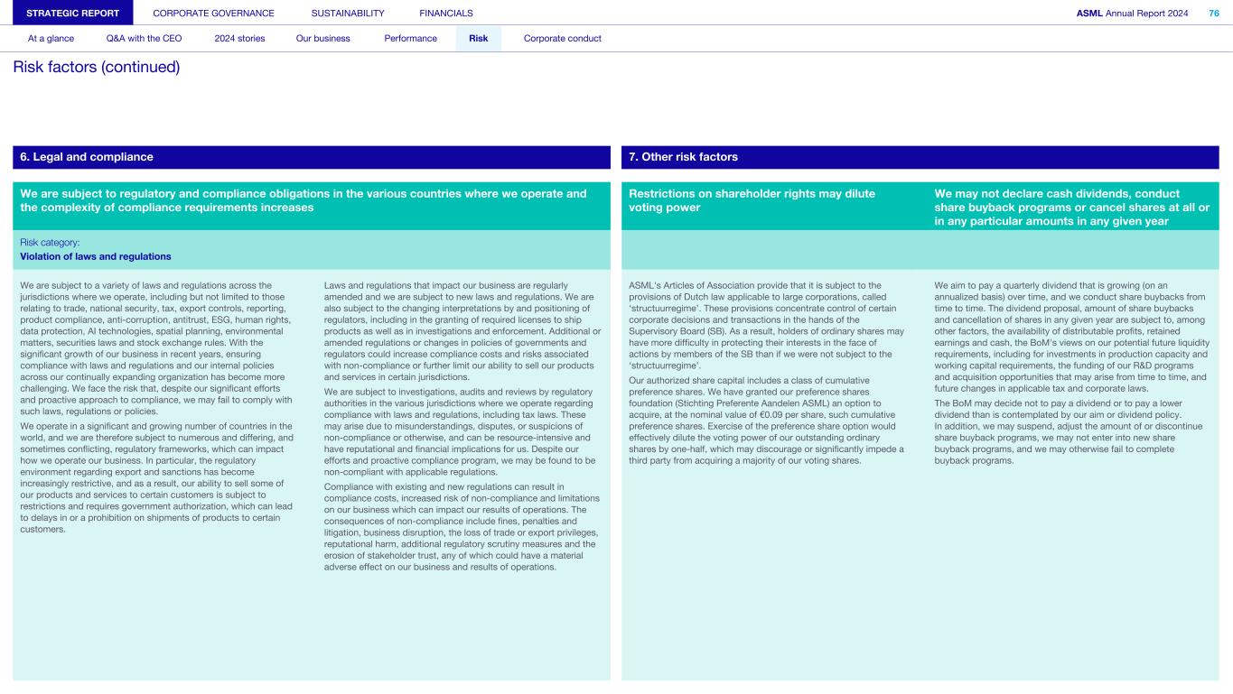 6. Legal and compliance 7. Other risk factors We are subject to regulatory and compliance obligations in the various countries where we operate and the complexity of compliance requirements increases Restrictions on shareholder rights may dilute voting power We may not declare cash dividends, conduct share buyback programs or cancel shares at all or in any particular amounts in any given year Risk category: Violation of laws and regulations We are subject to a variety of laws and regulations across the jurisdictions where we operate, including but not limited to those relating to trade, national security, tax, export controls, reporting, product compliance, anti-corruption, antitrust, ESG, human rights, data protection, AI technologies, spatial planning, environmental matters, securities laws and stock exchange rules. With the significant growth of our business in recent years, ensuring compliance with laws and regulations and our internal policies across our continually expanding organization has become more challenging. We face the risk that, despite our significant efforts and proactive approach to compliance, we may fail to comply with such laws, regulations or policies. We operate in a significant and growing number of countries in the world, and we are therefore subject to numerous and differing, and sometimes conflicting, regulatory frameworks, which can impact how we operate our business. In particular, the regulatory environment regarding export and sanctions has become increasingly restrictive, and as a result, our ability to sell some of our products and services to certain customers is subject to restrictions and requires government authorization, which can lead to delays in or a prohibition on shipments of products to certain customers. Laws and regulations that impact our business are regularly amended and we are subject to new laws and regulations. We are also subject to the changing interpretations by and positioning of regulators, including in the granting of required licenses to ship products as well as in investigations and enforcement. Additional or amended regulations or changes in policies of governments and regulators could increase compliance costs and risks associated with non-compliance or further limit our ability to sell our products and services in certain jurisdictions. We are subject to investigations, audits and reviews by regulatory authorities in the various jurisdictions where we operate regarding compliance with laws and regulations, including tax laws. These may arise due to misunderstandings, disputes, or suspicions of non-compliance or otherwise, and can be resource-intensive and have reputational and financial implications for us. Despite our efforts and proactive compliance program, we may be found to be non-compliant with applicable regulations. Compliance with existing and new regulations can result in compliance costs, increased risk of non-compliance and limitations on our business which can impact our results of operations. The consequences of non-compliance include fines, penalties and litigation, business disruption, the loss of trade or export privileges, reputational harm, additional regulatory scrutiny measures and the erosion of stakeholder trust, any of which could have a material adverse effect on our business and results of operations. ASML's Articles of Association provide that it is subject to the provisions of Dutch law applicable to large corporations, called ‘structuurregime’. These provisions concentrate control of certain corporate decisions and transactions in the hands of the Supervisory Board (SB). As a result, holders of ordinary shares may have more difficulty in protecting their interests in the face of actions by members of the SB than if we were not subject to the ‘structuurregime’. Our authorized share capital includes a class of cumulative preference shares. We have granted our preference shares foundation (Stichting Preferente Aandelen ASML) an option to acquire, at the nominal value of €0.09 per share, such cumulative preference shares. Exercise of the preference share option would effectively dilute the voting power of our outstanding ordinary shares by one-half, which may discourage or significantly impede a third party from acquiring a majority of our voting shares. We aim to pay a quarterly dividend that is growing (on an annualized basis) over time, and we conduct share buybacks from time to time. The dividend proposal, amount of share buybacks and cancellation of shares in any given year are subject to, among other factors, the availability of distributable profits, retained earnings and cash, the BoM's views on our potential future liquidity requirements, including for investments in production capacity and working capital requirements, the funding of our R&D programs and acquisition opportunities that may arise from time to time, and future changes in applicable tax and corporate laws. The BoM may decide not to pay a dividend or to pay a lower dividend than is contemplated by our aim or dividend policy. In addition, we may suspend, adjust the amount of or discontinue share buyback programs, we may not enter into new share buyback programs, and we may otherwise fail to complete buyback programs. STRATEGIC REPORT CORPORATE GOVERNANCE SUSTAINABILITY FINANCIALS ASML Annual Report 2024 76 At a glance Q&A with the CEO 2024 stories Our business Performance Risk Corporate conduct Risk factors (continued)