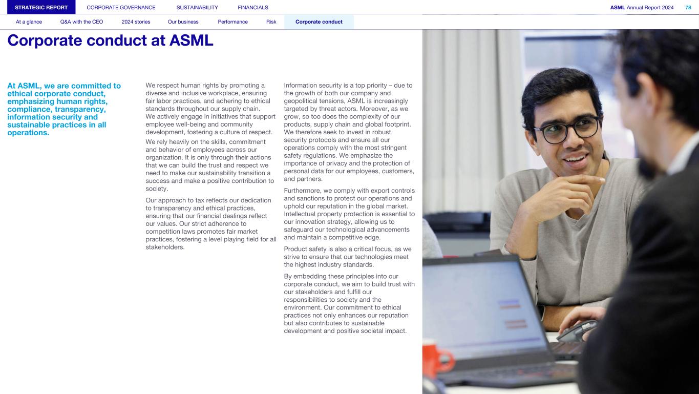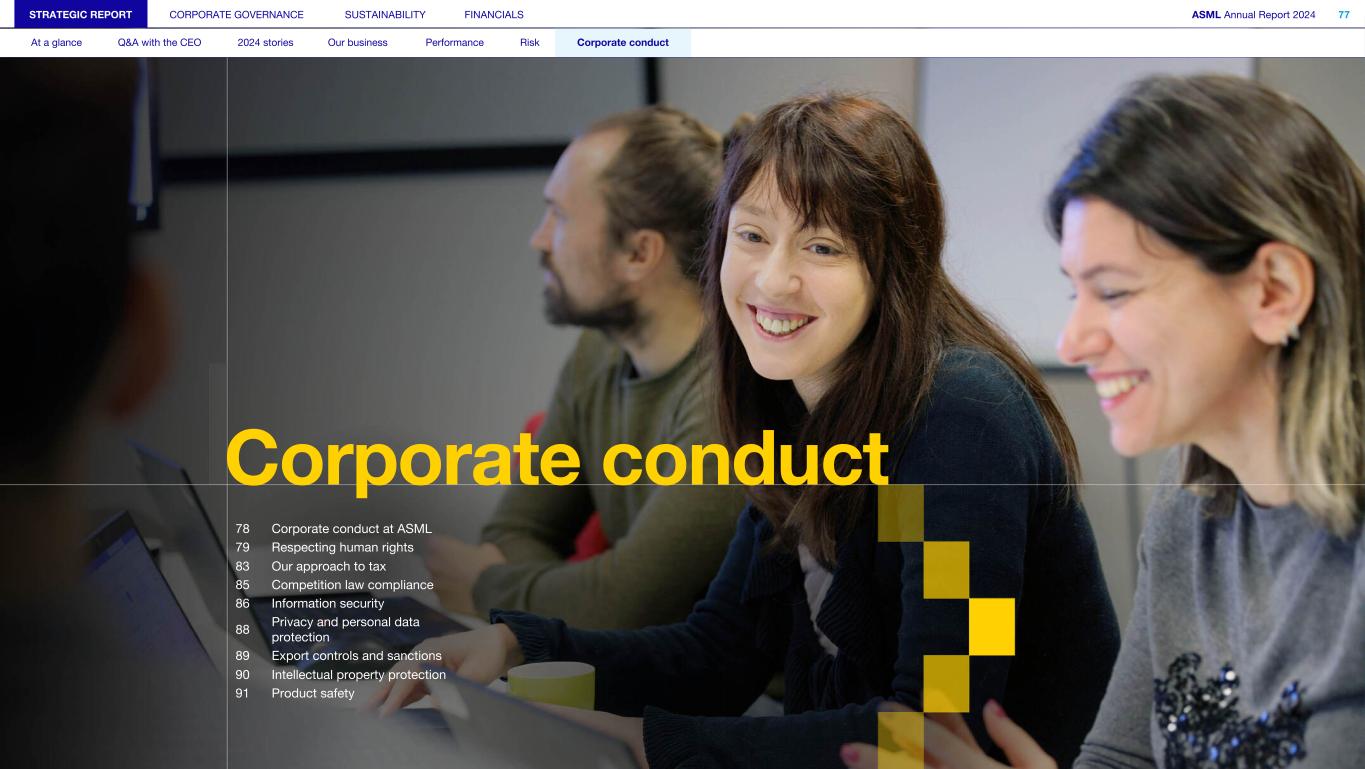 STRATEGIC REPORT CORPORATE GOVERNANCE SUSTAINABILITY FINANCIALS ASML Annual Report 2024 77 At a glance Q&A with the CEO 2024 stories Our business Performance Risk Corporate conduct Corporate conduct 78 Corporate conduct at ASML 79 Respecting human rights 83 Our approach to tax 85 Competition law compliance 86 Information security 88 Privacy and personal data protection 89 Export controls and sanctions 90 Intellectual property protection 91 Product safety