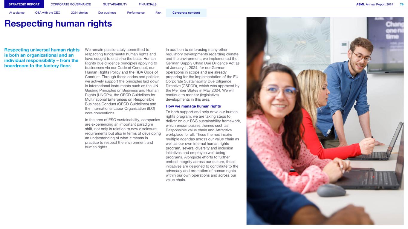 Respecting universal human rights is both an organizational and an individual responsibility – from the boardroom to the factory floor. We remain passionately committed to respecting fundamental human rights and have sought to enshrine the basic Human Rights due diligence principles applying to businesses via our Code of Conduct, our Human Rights Policy and the RBA Code of Conduct. Through these codes and policies, we actively support the principles laid down in international instruments such as the UN Guiding Principles on Business and Human Rights (UNGPs), the OECD Guidelines for Multinational Enterprises on Responsible Business Conduct (OECD Guidelines) and the International Labor Organization (ILO) core conventions. In the area of ESG sustainability, companies are experiencing an important paradigm shift, not only in relation to new disclosure requirements but also in terms of developing an understanding of what it means in practice to respect the environment and human rights. In addition to embracing many other regulatory developments regarding climate and the environment, we implemented the German Supply Chain Due Diligence Act as of January 1, 2024, for our German operations in scope and are already preparing for the implementation of the EU Corporate Sustainability Due Diligence Directive (CSDDD), which was approved by the Member States in May 2024. We will continue to monitor (legislative) developments in this area. How we manage human rights To both support and help drive our human rights program, we are taking steps to deliver on our ESG sustainability framework, which encompasses themes such as Responsible value chain and Attractive workplace for all. These themes inspire multiple agendas across our value chain as well as our own internal human rights program, several diversity and inclusion initiatives and employee well-being programs. Alongside efforts to further embed integrity across our culture, these initiatives are designed to contribute to the advocacy and promotion of human rights within our own operations and across our value chain. STRATEGIC REPORT CORPORATE GOVERNANCE SUSTAINABILITY FINANCIALS ASML Annual Report 2024 79 At a glance Q&A with the CEO 2024 stories Our business Performance Risk Corporate conduct Respecting human rights