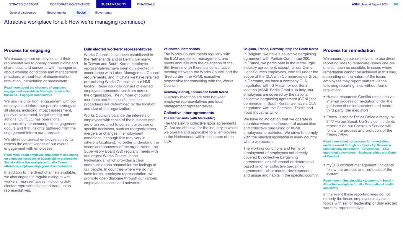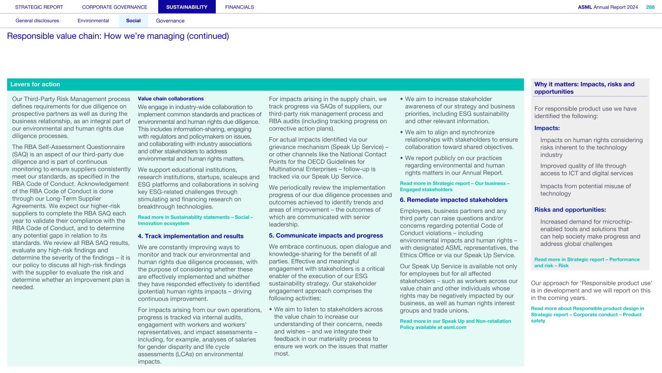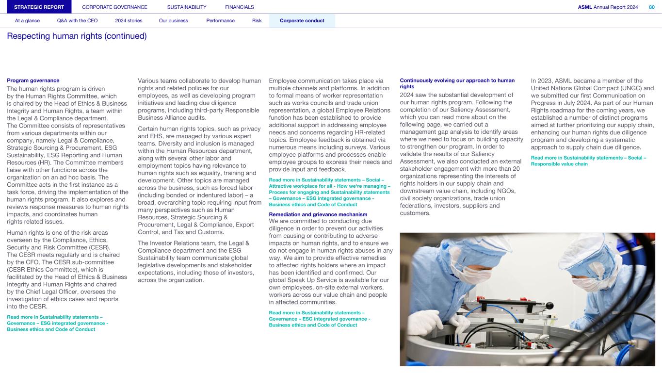 Program governance The human rights program is driven by the Human Rights Committee, which is chaired by the Head of Ethics & Business Integrity and Human Rights, a team within the Legal & Compliance department. The Committee consists of representatives from various departments within our company, namely Legal & Compliance, Strategic Sourcing & Procurement, ESG Sustainability, ESG Reporting and Human Resources (HR). The Committee members liaise with other functions across the organization on an ad hoc basis. The Committee acts in the first instance as a task force, driving the implementation of the human rights program. It also explores and reviews response measures to human rights impacts, and coordinates human rights related issues. Human rights is one of the risk areas overseen by the Compliance, Ethics, Security and Risk Committee (CESR). The CESR meets regularly and is chaired by the CFO. The CESR sub-committee (CESR Ethics Committee), which is facilitated by the Head of Ethics & Business Integrity and Human Rights and chaired by the Chief Legal Officer, oversees the investigation of ethics cases and reports into the CESR. Read more in Sustainability statements – Governance – ESG integrated governance - Business ethics and Code of Conduct Various teams collaborate to develop human rights and related policies for our employees, as well as developing program initiatives and leading due diligence programs, including third-party Responsible Business Alliance audits. Certain human rights topics, such as privacy and EHS, are managed by various expert teams. Diversity and inclusion is managed within the Human Resources department, along with several other labor and employment topics having relevance to human rights such as equality, training and development. Other topics are managed across the business, such as forced labor (including bonded or indentured labor) – a broad, overarching topic requiring input from many perspectives such as Human Resources, Strategic Sourcing & Procurement, Legal & Compliance, Export Control, and Tax and Customs. The Investor Relations team, the Legal & Compliance department and the ESG Sustainability team communicate global legislative developments and stakeholder expectations, including those of investors, across the organization. Employee communication takes place via multiple channels and platforms. In addition to formal means of worker representation such as works councils and trade union representation, a global Employee Relations function has been established to provide additional support in addressing employee needs and concerns regarding HR-related topics. Employee feedback is obtained via numerous means including surveys. Various employee platforms and processes enable employee groups to express their needs and provide input and feedback. Read more in Sustainability statements – Social – Attractive workplace for all - How we're managing – Process for engaging and Sustainability statements – Governance – ESG integrated governance - Business ethics and Code of Conduct Remediation and grievance mechanism We are committed to conducting due diligence in order to prevent our activities from causing or contributing to adverse impacts on human rights, and to ensure we do not engage in human rights abuses in any way. We aim to provide effective remedies to affected rights holders where an impact has been identified and confirmed. Our global Speak Up Service is available for our own employees, on-site external workers, workers across our value chain and people in affected communities. Read more in Sustainability statements – Governance – ESG integrated governance - Business ethics and Code of Conduct Continuously evolving our approach to human rights 2024 saw the substantial development of our human rights program. Following the completion of our Saliency Assessment, which you can read more about on the following page, we carried out a management gap analysis to identify areas where we need to focus on building capacity to strengthen our program. In order to validate the results of our Saliency Assessment, we also conducted an external stakeholder engagement with more than 20 organizations representing the interests of rights holders in our supply chain and downstream value chain, including NGOs, civil society organizations, trade union federations, investors, suppliers and customers. In 2023, ASML became a member of the United Nations Global Compact (UNGC) and we submitted our first Communication on Progress in July 2024. As part of our Human Rights roadmap for the coming years, we established a number of distinct programs aimed at further prioritizing our supply chain, enhancing our human rights due diligence program and developing a systematic approach to supply chain due diligence. Read more in Sustainability statements – Social – Responsible value chain STRATEGIC REPORT CORPORATE GOVERNANCE SUSTAINABILITY FINANCIALS ASML Annual Report 2024 80 At a glance Q&A with the CEO 2024 stories Our business Performance Risk Corporate conduct Respecting human rights (continued)