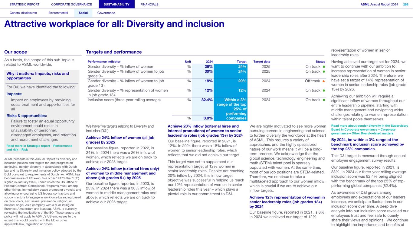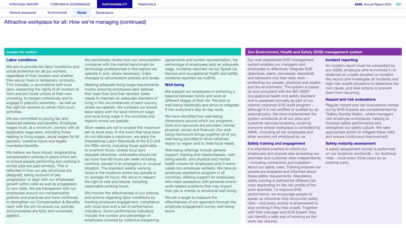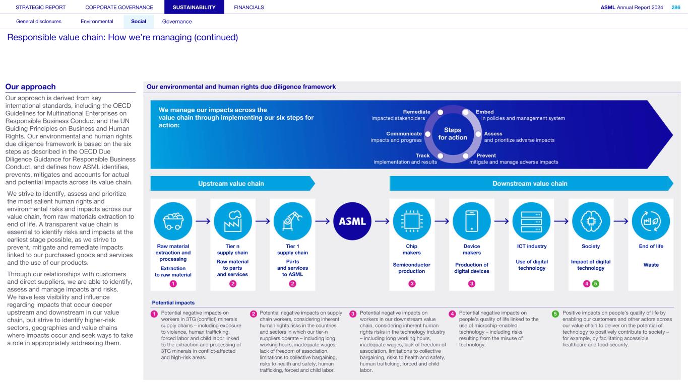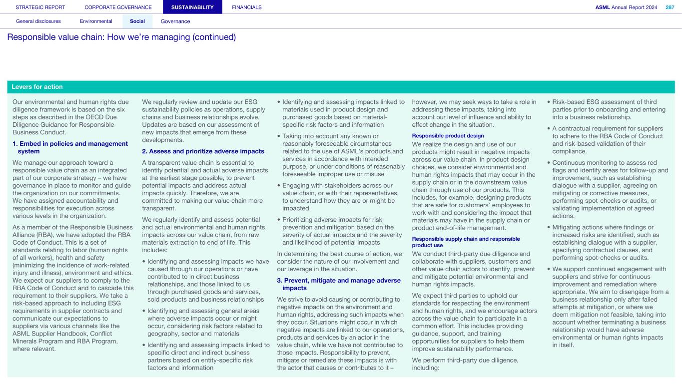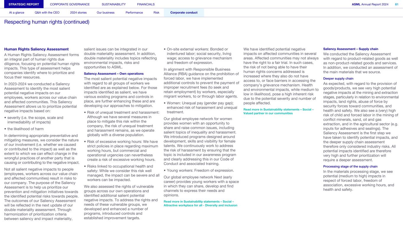 Human Rights Saliency Assessment A Human Rights Saliency Assessment forms an integral part of human rights due diligence, focusing on potential human rights impacts. This type of assessment helps companies identify where to prioritize and focus their resources. In 2023-2024 we conducted a Saliency Assessment to identify the most salient potential negative impacts on our employees, workers across our value chain and affected communities. This Saliency Assessment allows us to prioritize potential negative impacts based on: • severity (i.e. the scope, scale and irremediability of impacts) • the likelihood of harm In determining appropriate preventative and mitigating measures, we consider the nature of our involvement (i.e. whether we caused or contributed to the impact) as well as the extent to which we can effect change in the wrongful practices of another party that is causing or contributing to the negative impact. Not all salient negative impacts to people (employees, workers across our value chain and affected communities) result in risks to our company. The purpose of the Saliency Assessment is to help us prioritize our prevention and mitigation initiatives towards the identified potential risks towards people. The outcomes of our Saliency Assessment will be reflected in the next update of our double materiality assessment. Through harmonization of prioritization criteria between saliency and impact materiality, salient issues can be integrated in our double materiality assessment. In addition, double materiality includes topics reflecting environmental impacts, risks and opportunities to ASML. Saliency Assessment – Own operations The most salient potential negative impacts with regard to all groups of workers we identified are as explained below. For those impacts identified as salient, we have various existing programs and controls in place, are further enhancing these and are developing our approaches to mitigation. • Risk of unequal treatment and harassment: Although we have several measures in place to mitigate this risk within the company, the risk of unequal treatment and harassment remains, as we operate globally with a diverse population. • Risk of excessive working hours: We have strict policies in place regarding maximum working hours, but commercial and operational urgencies can nevertheless create a risk of excessive working hours. • Risks linked to occupational health and safety: While we consider this risk well managed, the impact can be severe and all workers can be impacted. We also assessed the rights of vulnerable groups across our own operations and identified additional salient potential negative impacts. To address the rights and needs of these vulnerable groups, we developed and enhanced a number of programs, introduced controls and established improvement targets. • On-site external workers: Bonded or indentured labor; social security, living wage; access to grievance mechanism and freedom of expression. In alignment with Responsible Business Alliance (RBA) guidance on the prohibition of forced labor, we have implemented additional controls to prevent the payment of improper recruitment fees (to seek and retain employment) by workers, especially migrant workers, to or through labor agents. • Women: Unequal pay (gender pay gap); enhanced risk of harassment and unequal treatment. Our global employee network for women provides women with an opportunity to share and raise common issues, including salient topics of inequality and harassment. We introduced programs designed around development, skills and visibility for female talents. We continuously work to address the risk of harassment by ensuring that the topic is included in our awareness program and clearly addressing this in our Code of Conduct and associated training. • Young workers: Freedom of expression. Our global employee network Next (early career) provides young workers with a space in which they can share, develop and find channels to express their needs and opinions. Read more in Sustainability statements – Social – Attractive workplace for all - Diversity and inclusion We have identified potential negative impacts on affected communities in several areas. Affected communities may not always have the right to a fair trial. In such cases, the risk of not being able to have their human rights concerns addressed is increased where they also do not have access to, or face barriers in accessing the company’s grievance mechanism. Health and environmental impacts, while medium to low in likelihood, pose a high inherent risk due to the potential severity and number of people affected. Read more in Sustainability statements – Social – Valued partner in our communities Saliency Assessment – Supply chain We conducted the Saliency Assessment with regard to product-related goods as well as non-product-related goods and services. In addition, we conducted an assessment of the main materials that we source. Deeper supply chain As expected, with regard to the provision of goods/products, we see very high potential negative impacts at the mining and extraction stages, particularly in relation to environmental impacts, land rights, abuse of force by security forces toward communities, and health and safety. We also see a (very) high risk of child and forced labor in the mining of conflict minerals, sand, oil and gas extraction, and in the agricultural sector (e.g. inputs for adhesives and sealings). The Saliency Assessment is the first step we have taken to identify potential impacts, and the deeper supply chain assessment therefore only considered industry risks. All potential impacts identified are therefore very high and further prioritization will require a deeper assessment. Processing stage of the supply chain In the materials processing stage, we see potential (medium to high) impacts in respect of forced labor, freedom of association, excessive working hours, and health and safet
