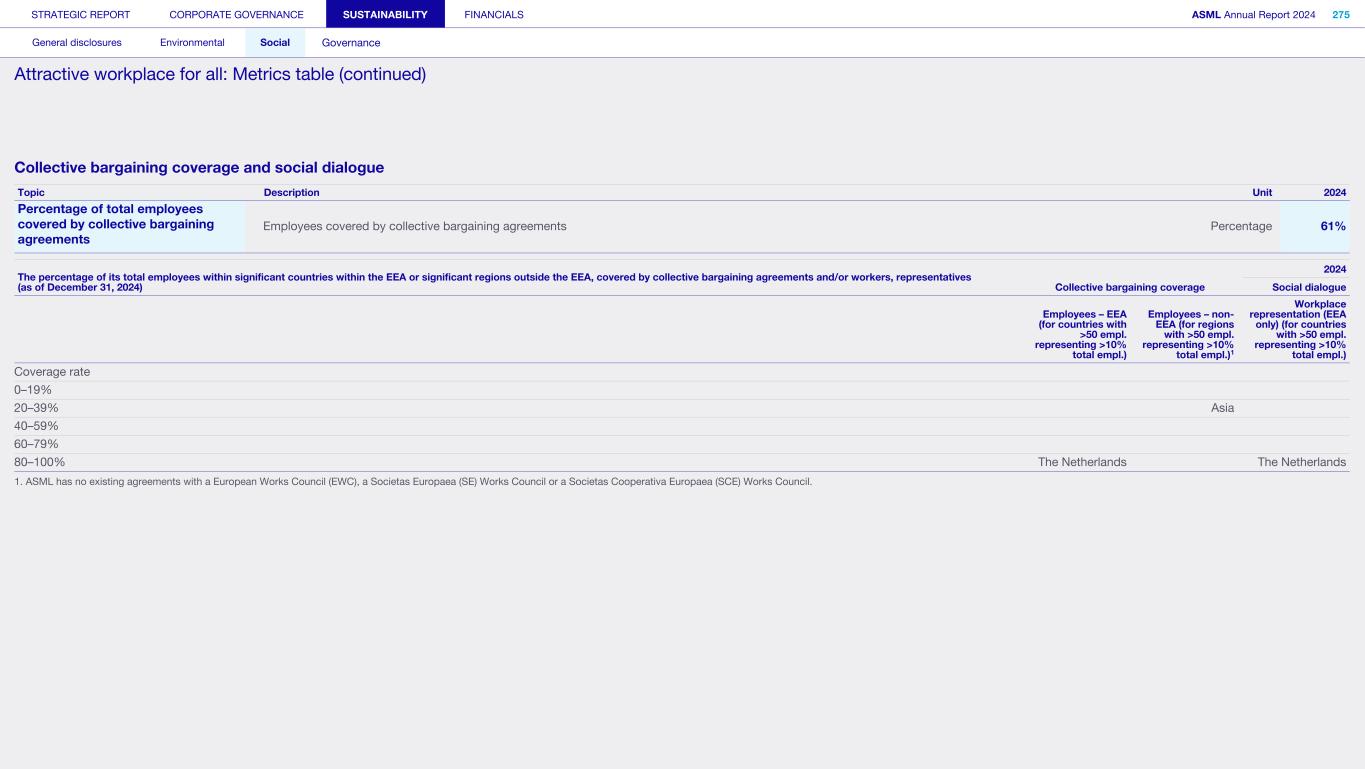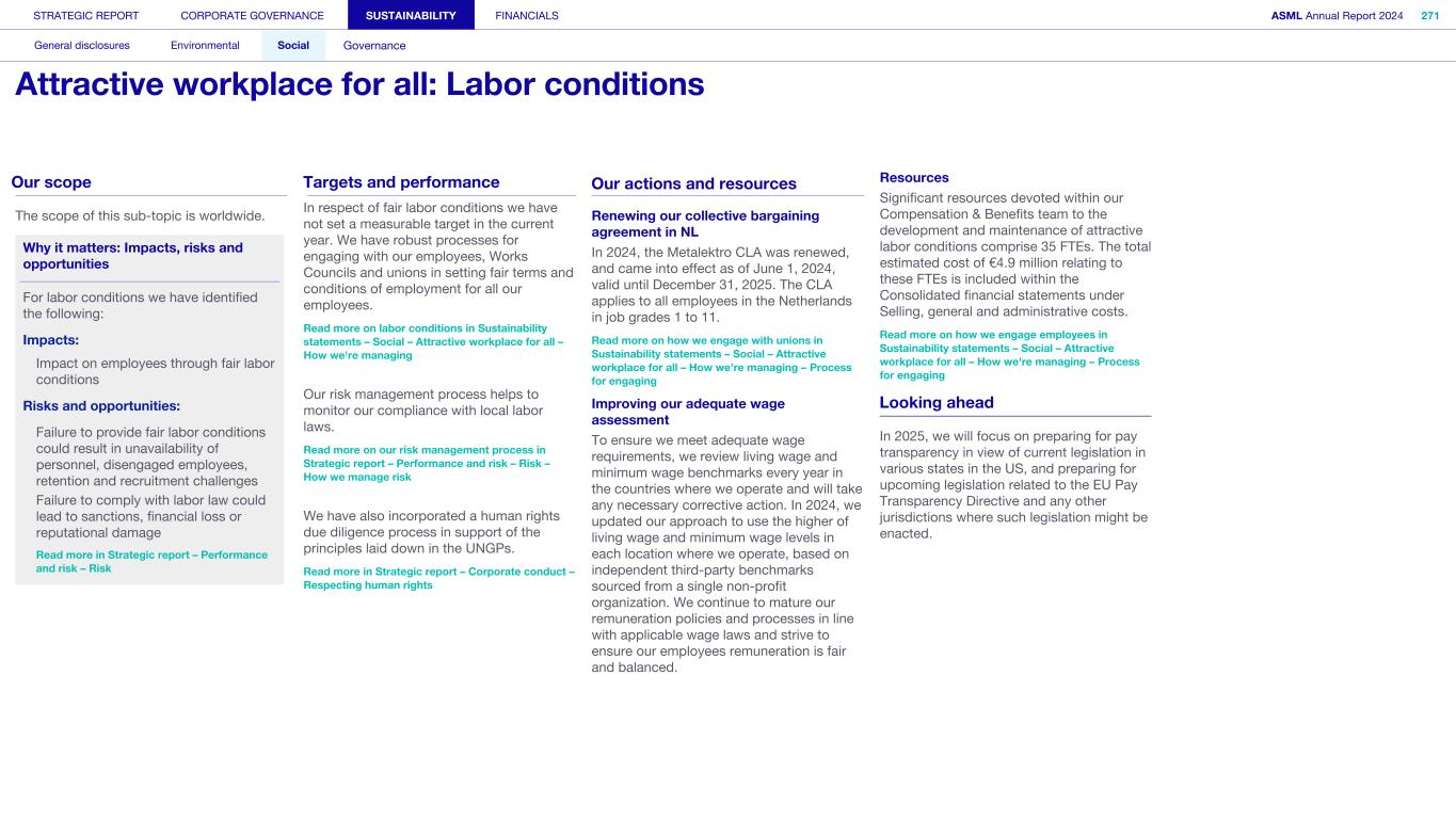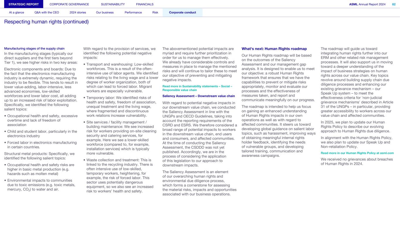Manufacturing stages of the supply chain In the manufacturing stages (typically our direct suppliers and the first tiers beyond Tier 1), we see higher risks in two key areas: Electronic components and boards: Due to the fact that the electronics manufacturing industry is extremely dynamic, requiring the industry to be flexible. This tends to result in lower value-adding, labor-intensive, less advanced economies, low-skilled workforces and lower labor cost, all adding up to an increased risk of labor exploitation. Specifically, we identified the following salient topics: • Occupational health and safety, excessive overtime and lack of freedom of association • Child and student labor, particularly in the electronics industry • Forced labor in electronics manufacturing in certain countries. Structural metal products: Specifically, we identified the following salient topics: • Occupational health and safety risks are higher in basic metal production (e.g. hazards such as molten metal) • Environmental impacts to communities due to toxic emissions (e.g. toxic metals, mercury, CO2) to water and air. With regard to the provision of services, we identified the following potential negative impacts: • Transport and warehousing: Low-skilled workforces. This is a result of the often- intensive use of labor agents. We identified risks relating to the living wage and a lower degree of worker organization, both of which can lead to forced labor. Migrant workers are especially vulnerable. • Temporary labor: We identified risks of health and safety, freedom of association, unequal treatment and the living wage, where fragmented and discontinuous work relations increase vulnerability. • Site services / facility management / building maintenance: We see increased risk for workers providing on-site cleaning security and catering services, for example. Here we see a lower-skilled workforce (compared to, for example, installation services) which is typically more vulnerable. • Waste collection and treatment: This is linked to the recycling industry. There is often intensive use of low-skilled, temporary workers, heightening, for example, the risk of forced labor. This sector uses potentially dangerous equipment, so we also see an increased risk to workers’ health and safety. The abovementioned potential impacts are myriad and require further prioritization in order for us to manage them effectively. We already have considerable controls and measures in place to manage the mentioned risks and will continue to tailor these to meet our objective of preventing and mitigating negative impacts. Read more in Sustainability statements – Social – Responsible value chain Saliency Assessment – Downstream value chain With regard to potential negative impacts in our downstream value chain, we conducted the Saliency Assessment in line with the UNGPs and OECD Guidelines, taking into account the reporting requirements of the CSRD and ESRS. We therefore considered a broad range of potential impacts to workers in the downstream value chain, end users and consumers, and affected communities. At the time of conducting the Saliency Assessment, the CSDDD was not yet published. Accordingly, we are in the process of considering the application of this legislation to our approach to downstream impacts. The Saliency Assessment is an element of our overarching human rights and environmental due diligence process, which forms a cornerstone for assessing the material risks, impacts and opportunities associated with our business operations. What's next: Human Rights roadmap Our Human Rights roadmap will be based on the outcomes of the Saliency Assessment and our management gap analysis. It is designed to enable us to meet our objective: a robust Human Rights framework that ensures that we have the capabilities to prevent or mitigate risks appropriately, monitor and evaluate our processes and the effectiveness of measures taken, and report and communicate meaningfully on our progress. The roadmap is intended to help us focus on gaining an enhanced understanding of Human Rights impacts in our own operations as well as with regard to affected communities. It steers us toward developing global guidance on salient labor topics, such as harassment, improving ways of obtaining meaningful internal rights holder feedback, identifying the needs of vulnerable groups, and developing tailored training, communication and awareness campaigns. The roadmap will guide us toward integrating human rights further into our ERM and other related risk management processes. It will also support us in moving toward a deeper understanding of the impact of business strategies on human rights across our value chain. Key topics revolve around building supply chain due diligence processes and enhancing our existing grievance mechanism – our Speak Up system – to meet the effectiveness criteria for 'non-judicial grievance mechanisms' described in Article 31 of the UNGPs – in particular, providing greater accessibility to workers across our value chain and affected communities. In 2025, we plan to update our Human Rights Policy to describe our evolving approach to Human Rights due diligence. In alignment with the Human Rights Policy, we also plan to update our Speak Up and Non-retaliation Policy. Read more in our Human Rights Policy at asml.com We received no grievances about breaches of Human Rights in 2024. STRATEGIC REPORT CORPORATE GOVERNANCE SUSTAINABILITY FINANCIALS ASML Annual Report 2024 82 At a glance Q&A with the CEO 2024 stories Our business Performance Risk Corporate conduct Respecting human rights (continued)