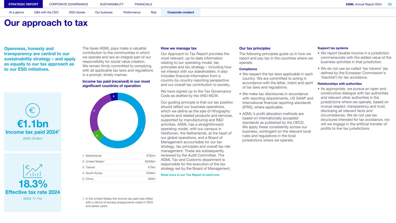 Openness, honesty and transparency are central to our sustainability strategy – and apply as equally to our tax approach as to our ESG initiatives. €1.1bn Income tax paid 20241 (2023: €2.6bn) 18.3% Effective tax rate 2024 (2023: 17.1%) The taxes ASML pays make a valuable contribution to the communities in which we operate and are an integral part of our responsibility for social value creation. We remain firmly committed to complying with all applicable tax laws and regulations in a prompt, timely manner. Income tax paid (received) in our most significant countries of operation 1 3 4 5 1. Netherlands €762m 2. United States1 €(209)m 3. Taiwan €78m 4. South Korea €336m 5. China €58m 1. In the United States the income tax paid was offset with a refund of excess prepayments made in 2023 and earlier years. How we manage tax Our Approach to Tax Report provides the most relevant, up-to-date information relating to our operating model, tax principles and tax strategy – including how we interact with our stakeholders. It also includes financial information from a country-by-country reporting perspective and our overall tax contribution to society. We have signed up to the Tax Governance Code as drafted by the VNO-NCW. Our guiding principle is that our tax position should reflect our business operations, which we define as the sale of lithography systems and related products and services, supported by manufacturing and R&D activities. ASML has a straightforward operating model, with our campus in Veldhoven, the Netherlands, at the heart of our global operations, and a Board of Management accountable for our tax strategy, tax principles and overall tax risk management. These are subsequently reviewed by the Audit Committee. The ASML Tax and Customs department is responsible for the execution of the tax strategy set by the Board of Management. Read more in our Tax Report at asml.com Our tax principles The following principles guide us in how we report and pay tax in the countries where we operate. Compliance • We respect the tax laws applicable in each country. We are committed to acting in accordance with the letter, intent and spirit of tax laws and regulations. • We make tax disclosures in accordance with reporting requirements, US GAAP and International financial reporting standards (IFRS), where applicable. • ASML’s profit allocation methods are based on internationally accepted standards as published by the OECD. We apply these consistently across our business, contingent on the relevant local rules and regulations in the local jurisdictions where we operate. Support tax systems • We report taxable income in a jurisdiction commensurate with the added value of the business activities in that jurisdiction. • We do not use so-called ‘tax havens’ (as defined by the European Commission’s ‘blacklist’) for tax avoidance. Relationships with authorities • As appropriate, we pursue an open and constructive dialogue with tax authorities and relevant other authorities in the jurisdictions where we operate, based on mutual respect, transparency and trust, disclosing all relevant facts and circumstances. We do not use tax structures intended for tax avoidance, nor will we engage in the artificial transfer of profits to low tax jurisdictions. STRATEGIC REPORT CORPORATE GOVERNANCE SUSTAINABILITY FINANCIALS ASML Annual Report 2024 83 At a glance Q&A with the CEO 2024 stories Our business Performance Risk Corporate conduct Our approach to tax