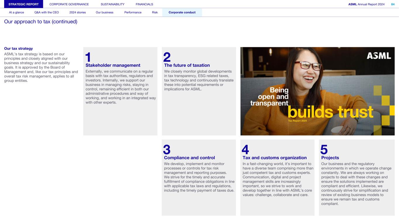 Our tax strategy ASML’s tax strategy is based on our principles and closely aligned with our business strategy and our sustainability goals. It is approved by the Board of Management and, like our tax principles and overall tax risk management, applies to all group entities. STRATEGIC REPORT CORPORATE GOVERNANCE SUSTAINABILITY FINANCIALS ASML Annual Report 2024 84 At a glance Q&A with the CEO 2024 stories Our business Performance Risk Corporate conduct Our approach to tax (continued) 1 2 Stakeholder management The future of taxation Externally, we communicate on a regular basis with tax authorities, regulators and investors. Internally, we support our business in managing risks, staying in control, remaining efficient in both our administrative procedures and way of working, and working in an integrated way with other experts. We closely monitor global developments in tax transparency, ESG related taxes, tax technology and continuously translate these into potential requirements or implications for ASML. 3 4 5 Compliance and control Tax and customs organization Projects We develop, implement and monitor processes or controls for tax risk management and reporting purposes. We strive for the timely and accurate fulfillment of compliance obligations in line with applicable tax laws and regulations, including the timely payment of taxes due. In a fast-changing world, it’s important to have a diverse team comprising more than just competent tax and customs experts. Communication, digital and project management skills are increasingly important, so we strive to work and develop together in line with ASML’s core values: challenge, collaborate and care. Our business and the regulatory environments in which we operate change constantly. We are always working on projects to deal with these changes and ensure the solutions implemented are compliant and efficient. Likewise, we continuously strive for simplification and review of existing business models to ensure we remain tax and customs compliant.