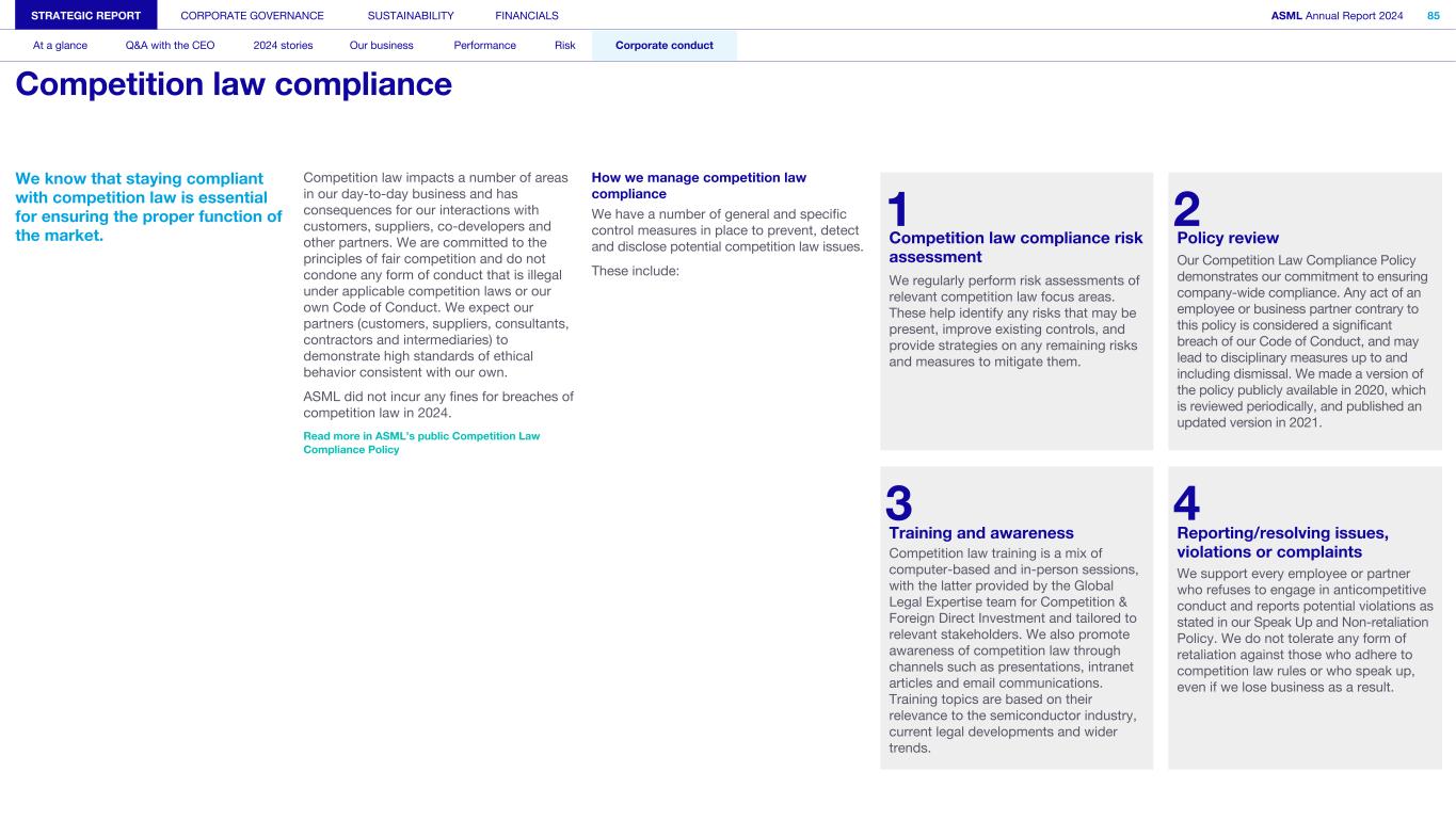 We know that staying compliant with competition law is essential for ensuring the proper function of the market. Competition law impacts a number of areas in our day-to-day business and has consequences for our interactions with customers, suppliers, co-developers and other partners. We are committed to the principles of fair competition and do not condone any form of conduct that is illegal under applicable competition laws or our own Code of Conduct. We expect our partners (customers, suppliers, consultants, contractors and intermediaries) to demonstrate high standards of ethical behavior consistent with our own. ASML did not incur any fines for breaches of competition law in 2024. Read more in ASML’s public Competition Law Compliance Policy How we manage competition law compliance We have a number of general and specific control measures in place to prevent, detect and disclose potential competition law issues. These include: STRATEGIC REPORT CORPORATE GOVERNANCE SUSTAINABILITY FINANCIALS ASML Annual Report 2024 85 At a glance Q&A with the CEO 2024 stories Our business Performance Risk Corporate conduct Competition law compliance 1 2 Competition law compliance risk assessment Policy review Our Competition Law Compliance Policy demonstrates our commitment to ensuring company-wide compliance. Any act of an employee or business partner contrary to this policy is considered a significant breach of our Code of Conduct, and may lead to disciplinary measures up to and including dismissal. We made a version of the policy publicly available in 2020, which is reviewed periodically, and published an updated version in 2021. We regularly perform risk assessments of relevant competition law focus areas. These help identify any risks that may be present, improve existing controls, and provide strategies on any remaining risks and measures to mitigate them. 3 4 Training and awareness Reporting/resolving issues, violations or complaintsCompetition law training is a mix of computer-based and in-person sessions, with the latter provided by the Global Legal Expertise team for Competition & Foreign Direct Investment and tailored to relevant stakeholders. We also promote awareness of competition law through channels such as presentations, intranet articles and email communications. Training topics are based on their relevance to the semiconductor industry, current legal developments and wider trends. We support every employee or partner who refuses to engage in anticompetitive conduct and reports potential violations as stated in our Speak Up and Non-retaliation Policy. We do not tolerate any form of retaliation against those who adhere to competition law rules or who speak up, even if we lose business as a result.
