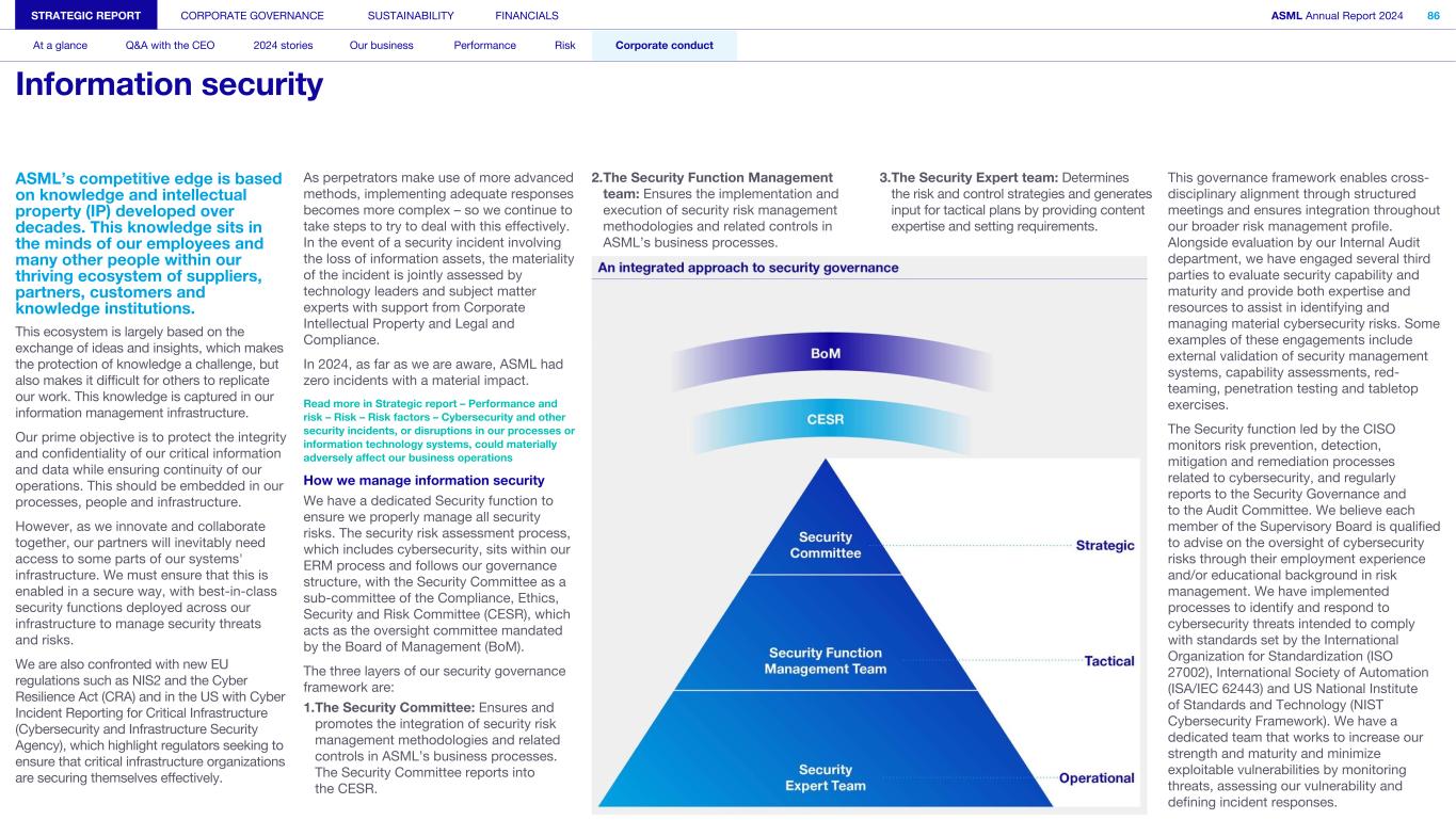 ASML’s competitive edge is based on knowledge and intellectual property (IP) developed over decades. This knowledge sits in the minds of our employees and many other people within our thriving ecosystem of suppliers, partners, customers and knowledge institutions. This ecosystem is largely based on the exchange of ideas and insights, which makes the protection of knowledge a challenge, but also makes it difficult for others to replicate our work. This knowledge is captured in our information management infrastructure. Our prime objective is to protect the integrity and confidentiality of our critical information and data while ensuring continuity of our operations. This should be embedded in our processes, people and infrastructure. However, as we innovate and collaborate together, our partners will inevitably need access to some parts of our systems' infrastructure. We must ensure that this is enabled in a secure way, with best-in-class security functions deployed across our infrastructure to manage security threats and risks. We are also confronted with new EU regulations such as NIS2 and the Cyber Resilience Act (CRA) and in the US with Cyber Incident Reporting for Critical Infrastructure (Cybersecurity and Infrastructure Security Agency), which highlight regulators seeking to ensure that critical infrastructure organizations are securing themselves effectively. As perpetrators make use of more advanced methods, implementing adequate responses becomes more complex – so we continue to take steps to try to deal with this effectively. In the event of a security incident involving the loss of information assets, the materiality of the incident is jointly assessed by technology leaders and subject matter experts with support from Corporate Intellectual Property and Legal and Compliance. In 2024, as far as we are aware, ASML had zero incidents with a material impact. Read more in Strategic report – Performance and risk – Risk – Risk factors – Cybersecurity and other security incidents, or disruptions in our processes or information technology systems, could materially adversely affect our business operations How we manage information security We have a dedicated Security function to ensure we properly manage all security risks. The security risk assessment process, which includes cybersecurity, sits within our ERM process and follows our governance structure, with the Security Committee as a sub-committee of the Compliance, Ethics, Security and Risk Committee (CESR), which acts as the oversight committee mandated by the Board of Management (BoM). The three layers of our security governance framework are: 1.The Security Committee: Ensures and promotes the integration of security risk management methodologies and related controls in ASML’s business processes. The Security Committee reports into the CESR. 2.The Security Function Management team: Ensures the implementation and execution of security risk management methodologies and related controls in ASML’s business processes. 3.The Security Expert team: Determines the risk and control strategies and generates input for tactical plans by providing content expertise and setting requirements. This governance framework enables cross- disciplinary alignment through structured meetings and ensures integration throughout our broader risk management profile. Alongside evaluation by our Internal Audit department, we have engaged several third parties to evaluate security capability and maturity and provide both expertise and resources to assist in identifying and managing material cybersecurity risks. Some examples of these engagements include external validation of security management systems, capability assessments, red- teaming, penetration testing and tabletop exercises. The Security function led by the CISO monitors risk prevention, detection, mitigation and remediation processes related to cybersecurity, and regularly reports to the Security Governance and to the Audit Committee. We believe each member of the Supervisory Board is qualified to advise on the oversight of cybersecurity risks through their employment experience and/or educational background in risk management. We have implemented processes to identify and respond to cybersecurity threats intended to comply with standards set by the International Organization for Standardization (ISO 27002), International Society of Automation (ISA/IEC 62443) and US National Institute of Standards and Technology (NIST Cybersecurity Framework). We have a dedicated team that works to increase our strength and maturity and minimize exploitable vulnerabilities by monitoring threats, assessing our vulnerability and defining incident responses. STRATEGIC REPORT CORPORATE GOVERNANCE SUSTAINABILITY FINANCIALS ASML Annual Report 2024 86 At a glance Q&A with the CEO 2024 stories Our business Performance Risk Corporate conduct Information security