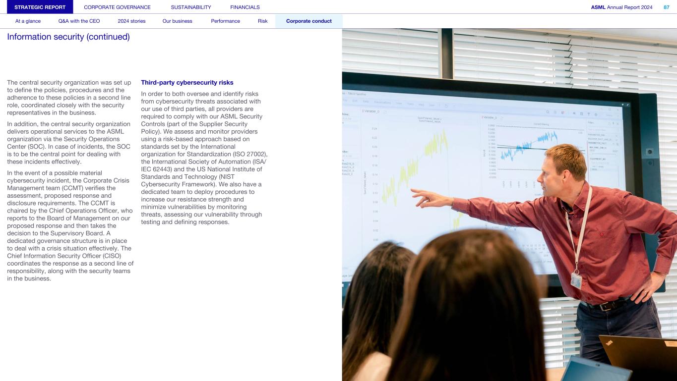 The central security organization was set up to define the policies, procedures and the adherence to these policies in a second line role, coordinated closely with the security representatives in the business. In addition, the central security organization delivers operational services to the ASML organization via the Security Operations Center (SOC). In case of incidents, the SOC is to be the central point for dealing with these incidents effectively. In the event of a possible material cybersecurity incident, the Corporate Crisis Management team (CCMT) verifies the assessment, proposed response and disclosure requirements. The CCMT is chaired by the Chief Operations Officer, who reports to the Board of Management on our proposed response and then takes the decision to the Supervisory Board. A dedicated governance structure is in place to deal with a crisis situation effectively. The Chief Information Security Officer (CISO) coordinates the response as a second line of responsibility, along with the security teams in the business. Third-party cybersecurity risks In order to both oversee and identify risks from cybersecurity threats associated with our use of third parties, all providers are required to comply with our ASML Security Controls (part of the Supplier Security Policy). We assess and monitor providers using a risk-based approach based on standards set by the International organization for Standardization (ISO 27002), the International Society of Automation (ISA/ IEC 62443) and the US National Institute of Standards and Technology (NIST Cybersecurity Framework). We also have a dedicated team to deploy procedures to increase our resistance strength and minimize vulnerabilities by monitoring threats, assessing our vulnerability through testing and defining responses. STRATEGIC REPORT CORPORATE GOVERNANCE SUSTAINABILITY FINANCIALS ASML Annual Report 2024 87 At a glance Q&A with the CEO 2024 stories Our business Performance Risk Corporate conduct Information security (continued)