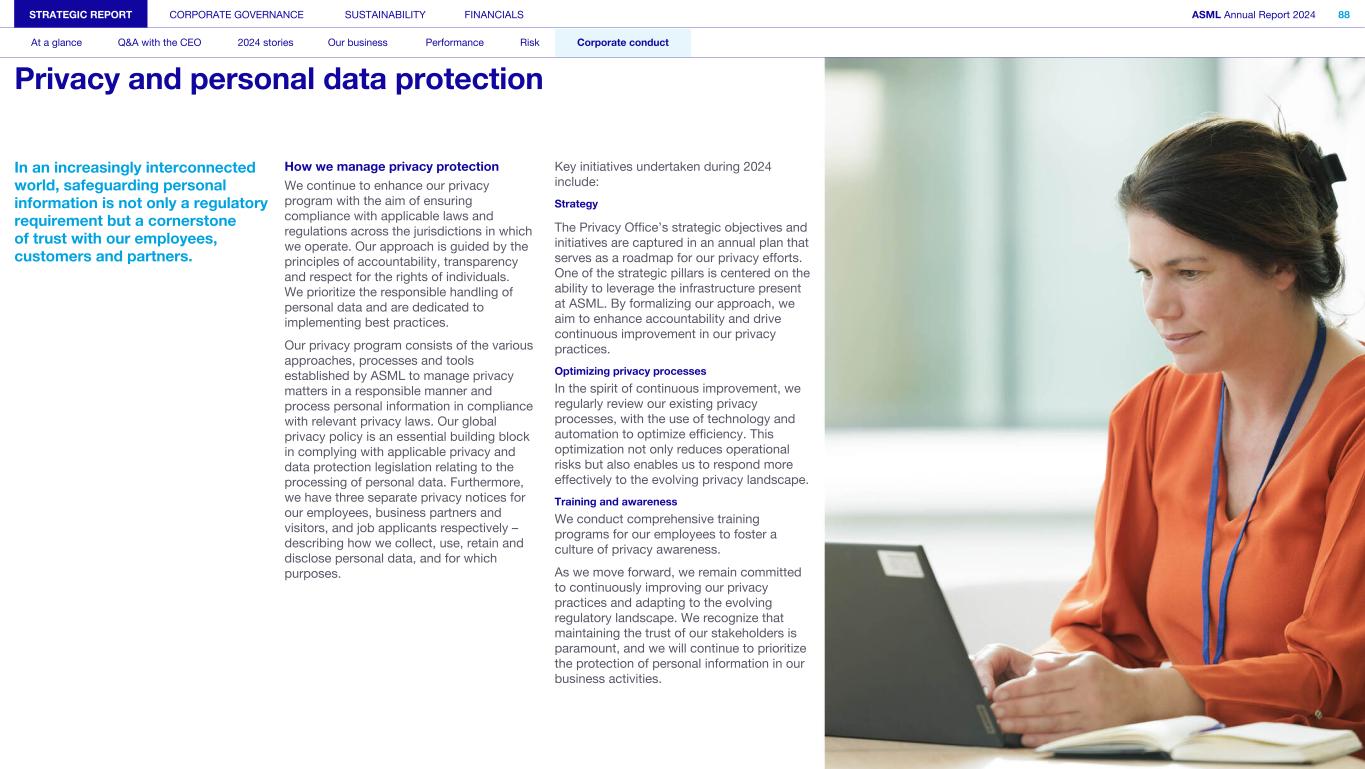 In an increasingly interconnected world, safeguarding personal information is not only a regulatory requirement but a cornerstone of trust with our employees, customers and partners. How we manage privacy protection We continue to enhance our privacy program with the aim of ensuring compliance with applicable laws and regulations across the jurisdictions in which we operate. Our approach is guided by the principles of accountability, transparency and respect for the rights of individuals. We prioritize the responsible handling of personal data and are dedicated to implementing best practices. Our privacy program consists of the various approaches, processes and tools established by ASML to manage privacy matters in a responsible manner and process personal information in compliance with relevant privacy laws. Our global privacy policy is an essential building block in complying with applicable privacy and data protection legislation relating to the processing of personal data. Furthermore, we have three separate privacy notices for our employees, business partners and visitors, and job applicants respectively – describing how we collect, use, retain and disclose personal data, and for which purposes. Key initiatives undertaken during 2024 include: Strategy The Privacy Office’s strategic objectives and initiatives are captured in an annual plan that serves as a roadmap for our privacy efforts. One of the strategic pillars is centered on the ability to leverage the infrastructure present at ASML. By formalizing our approach, we aim to enhance accountability and drive continuous improvement in our privacy practices. Optimizing privacy processes In the spirit of continuous improvement, we regularly review our existing privacy processes, with the use of technology and automation to optimize efficiency. This optimization not only reduces operational risks but also enables us to respond more effectively to the evolving privacy landscape. Training and awareness We conduct comprehensive training programs for our employees to foster a culture of privacy awareness. As we move forward, we remain committed to continuously improving our privacy practices and adapting to the evolving regulatory landscape. We recognize that maintaining the trust of our stakeholders is paramount, and we will continue to prioritize the protection of personal information in our business activities. STRATEGIC REPORT CORPORATE GOVERNANCE SUSTAINABILITY FINANCIALS ASML Annual Report 2024 88 At a glance Q&A with the CEO 2024 stories Our business Performance Risk Corporate conduct Privacy and personal data protection