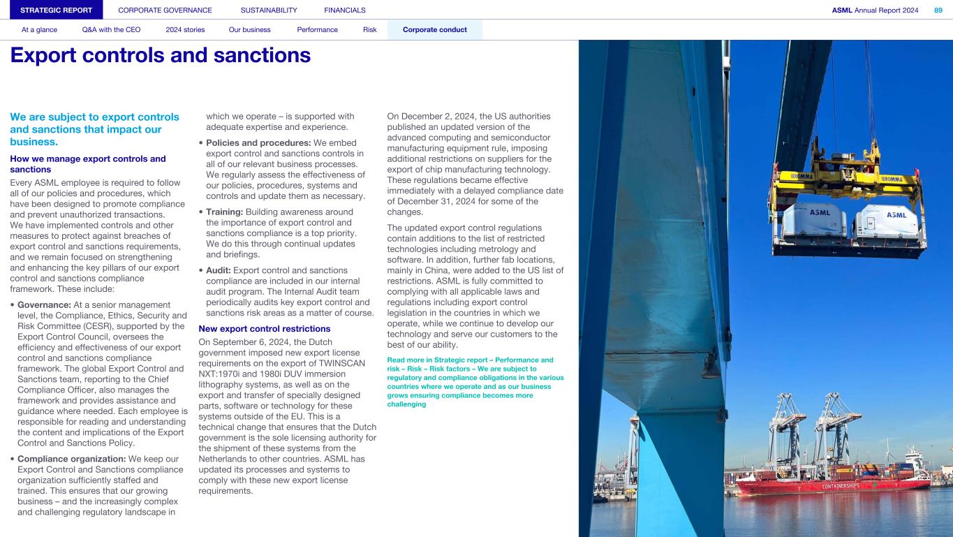 We are subject to export controls and sanctions that impact our business. How we manage export controls and sanctions Every ASML employee is required to follow all of our policies and procedures, which have been designed to promote compliance and prevent unauthorized transactions. We have implemented controls and other measures to protect against breaches of export control and sanctions requirements, and we remain focused on strengthening and enhancing the key pillars of our export control and sanctions compliance framework. These include: • Governance: At a senior management level, the Compliance, Ethics, Security and Risk Committee (CESR), supported by the Export Control Council, oversees the efficiency and effectiveness of our export control and sanctions compliance framework. The global Export Control and Sanctions team, reporting to the Chief Compliance Officer, also manages the framework and provides assistance and guidance where needed. Each employee is responsible for reading and understanding the content and implications of the Export Control and Sanctions Policy. • Compliance organization: We keep our Export Control and Sanctions compliance organization sufficiently staffed and trained. This ensures that our growing business – and the increasingly complex and challenging regulatory landscape in which we operate – is supported with adequate expertise and experience. • Policies and procedures: We embed export control and sanctions controls in all of our relevant business processes. We regularly assess the effectiveness of our policies, procedures, systems and controls and update them as necessary. • Training: Building awareness around the importance of export control and sanctions compliance is a top priority. We do this through continual updates and briefings. • Audit: Export control and sanctions compliance are included in our internal audit program. The Internal Audit team periodically audits key export control and sanctions risk areas as a matter of course. New export control restrictions On September 6, 2024, the Dutch government imposed new export license requirements on the export of TWINSCAN NXT:1970i and 1980i DUV immersion lithography systems, as well as on the export and transfer of specially designed parts, software or technology for these systems outside of the EU. This is a technical change that ensures that the Dutch government is the sole licensing authority for the shipment of these systems from the Netherlands to other countries. ASML has updated its processes and systems to comply with these new export license requirements. On December 2, 2024, the US authorities published an updated version of the advanced computing and semiconductor manufacturing equipment rule, imposing additional restrictions on suppliers for the export of chip manufacturing technology. These regulations became effective immediately with a delayed compliance date of December 31, 2024 for some of the changes. The updated export control regulations contain additions to the list of restricted technologies including metrology and software. In addition, further fab locations, mainly in China, were added to the US list of restrictions. ASML is fully committed to complying with all applicable laws and regulations including export control legislation in the countries in which we operate, while we continue to develop our technology and serve our customers to the best of our ability. Read more in Strategic report – Performance and risk – Risk – Risk factors – We are subject to regulatory and compliance obligations in the various countries where we operate and as our business grows ensuring compliance becomes more challenging STRATEGIC REPORT CORPORATE GOVERNANCE SUSTAINABILITY FINANCIALS ASML Annual Report 2024 89 At a glance Q&A with the CEO 2024 stories Our business Performance Risk Corporate conduct Export controls and sanctions