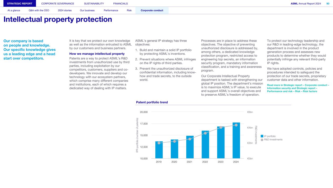Our company is based on people and knowledge. Our specific knowledge gives us a leading edge and a head start over competitors. It is key that we protect our own knowledge as well as the information entrusted to ASML by our customers and business partners. How we manage intellectual property Patents are a way to protect ASML’s R&D investments from unauthorized use by third parties, including exploitation by our competitors, customers, suppliers and co- developers. We innovate and develop our technology with our ecosystem partners, which comprise many different companies and institutions, each of which requires a dedicated way of dealing with IP matters. ASML’s general IP strategy has three objectives: 1. Build and maintain a solid IP portfolio by protecting ASML's inventions. 2. Prevent situations where ASML infringes on the IP rights of third parties. 3. Prevent the unauthorized disclosure of confidential information, including know- how and trade secrets, to the outside world. Patent portfolio trend IP R p or tfo lio (n um be r o f p at en ts ) R & D investm ents IP portfolio R&D investments 2019 2020 2021 2022 2023 2024 10,000 12,500 15,000 17,500 20,000 €0bn €2bn €4bn €6bn Processes are in place to address these objectives. The objective of preventing unauthorized disclosure is addressed by, among others, a dedicated knowledge protection program, restricted access to engineering top secrets, an information security program, mandatory information classification, and a training and awareness program. Our Corporate Intellectual Property department is tasked with strengthening our global IP position. The department’s mission is to maximize ASML’s IP value, to execute and support ASML’s overall objectives and to preserve ASML’s freedom of operation. To protect our technology leadership and our R&D in leading-edge technology, the department is involved in the product generation process and assesses new products to determine whether they would potentially infringe any relevant third-party IP rights. We have adopted controls, policies and procedures intended to safeguard the protection of our trade secrets, proprietary customer data and other information. Read more in Strategic report – Corporate conduct – Information security and Strategic report – Performance and risk – Risk – Risk factors STRATEGIC REPORT CORPORATE GOVERNANCE SUSTAINABILITY FINANCIALS ASML Annual Report 2024 90 At a glance Q&A with the CEO 2024 stories Our business Performance Risk Corporate conduct Intellectual property protection