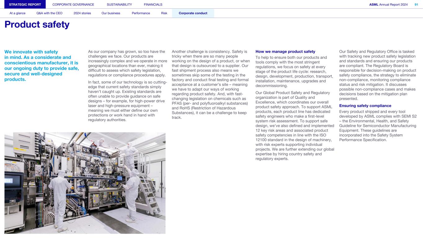We innovate with safety in mind. As a considerate and conscientious manufacturer, it is our ongoing duty to provide safe, secure and well-designed products. As our company has grown, so too have the challenges we face. Our products are increasingly complex and we operate in more geographical locations than ever, making it difficult to assess which safety legislation, regulations or compliance procedures apply. In fact, some of our technology is so cutting- edge that current safety standards simply haven’t caught up. Existing standards are often unable to provide guidance on safe designs – for example, for high-power drive laser and high-pressure equipment – meaning we must either define our own protections or work hand in hand with regulatory authorities. Another challenge is consistency. Safety is tricky when there are so many people working on the design of a product, or when that design is outsourced to a supplier. Our fast shipment process also means we sometimes skip some of the testing in the factory and conduct final testing and formal acceptance at a customer’s site – meaning we have to adapt our ways of working regarding product safety. And, with fast- changing legislation on chemicals such as PFAS (per- and polyfluoroalkyl substances) and RoHS (Restriction of Hazardous Substances), it can be a challenge to keep track. How we manage product safety To help to ensure both our products and tools comply with the most stringent regulations, we focus on safety at every stage of the product life cycle: research, design, development, production, transport, installation, maintenance, upgrades and decommissioning. Our Global Product Safety and Regulatory organization is part of Quality and Excellence, which coordinates our overall product safety approach. To support ASML products, each product line has dedicated safety engineers who make a first-level system risk assessment. To support safe design, we’ve also defined and implemented 12 key risk areas and associated product safety competencies in line with the ISO 12100 standard in the design of machinery, with risk experts supporting individual projects. We are further extending our global expertise by hiring country safety and regulatory experts. Our Safety and Regulatory Office is tasked with tracking new product safety legislation and standards and ensuring our products are compliant. The Regulatory Board is responsible for decision-making on product safety compliance, the strategy to eliminate non-compliance, monitoring compliance status and risk mitigation. It discusses possible non-compliance cases and makes decisions based on the mitigation plan presented. Ensuring safety compliance Every product shipped and every tool developed by ASML complies with SEMI S2 – the Environmental, Health, and Safety Guideline for Semiconductor Manufacturing Equipment. These guidelines are incorporated into the Safety System Performance Specification. STRATEGIC REPORT CORPORATE GOVERNANCE SUSTAINABILITY FINANCIALS ASML Annual Report 2024 91 At a glance Q&A with the CEO 2024 stories Our business Performance Risk Corporate conduct Product safety