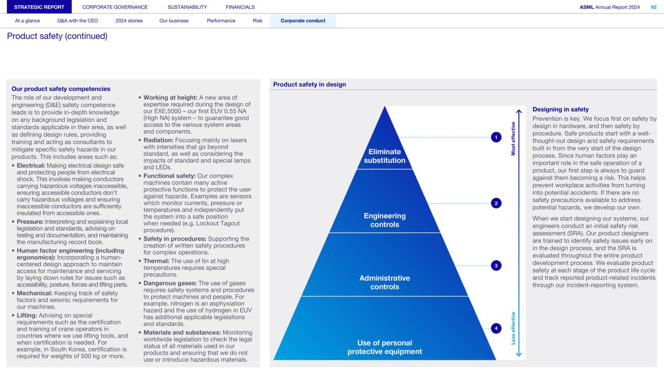 Designing in safety Prevention is key. We focus first on safety by design in hardware, and then safety by procedure. Safe products start with a well- thought-out design and safety requirements built in from the very start of the design process. Since human factors play an important role in the safe operation of a product, our first step is always to guard against them becoming a risk. This helps prevent workplace activities from turning into potential accidents. If there are no safety precautions available to address potential hazards, we develop our own. When we start designing our systems, our engineers conduct an initial safety risk assessment (SRA). Our product designers are trained to identify safety issues early on in the design process, and the SRA is evaluated throughout the entire product development process. We evaluate product safety at each stage of the product life cycle and track reported product-related incidents through our incident-reporting system. STRATEGIC REPORT CORPORATE GOVERNANCE SUSTAINABILITY FINANCIALS ASML Annual Report 2024 92 At a glance Q&A with the CEO 2024 stories Our business Performance Risk Corporate conduct Product safety (continued) Our product safety competencies The role of our development and engineering (D&E) safety competence leads is to provide in-depth knowledge on any background legislation and standards applicable in their area, as well as defining design rules, providing training and acting as consultants to mitigate specific safety hazards in our products. This includes areas such as: • Working at height: A new area of expertise required during the design of our EXE:5000 – our first EUV 0.55 NA (High NA) system – to guarantee good access to the various system areas and components. • Radiation: Focusing mainly on lasers with intensities that go beyond standard, as well as considering the impacts of standard and special lamps and LEDs. • Functional safety: Our complex machines contain many active protective functions to protect the user against hazards. Examples are sensors which monitor currents, pressure or temperatures and independently put the system into a safe position when needed (e.g. Lockout Tagout procedure). • Safety in procedures: Supporting the creation of written safety procedures for complex operations. • Thermal: The use of tin at high temperatures requires special precautions. • Dangerous gases: The use of gases requires safety systems and procedures to protect machines and people. For example, nitrogen is an asphyxiation hazard and the use of hydrogen in EUV has additional applicable legislations and standards. • Materials and substances: Monitoring worldwide legislation to check the legal status of all materials used in our products and ensuring that we do not use or introduce hazardous materials. • Electrical: Making electrical design safe and protecting people from electrical shock. This involves making conductors carrying hazardous voltages inaccessible, ensuring accessible conductors don’t carry hazardous voltages and ensuring inaccessible conductors are sufficiently insulated from accessible ones. • Pressure: Interpreting and explaining local legislation and standards, advising on testing and documentation, and maintaining the manufacturing record book. • Human factor engineering (including ergonomics): Incorporating a human- centered design approach to maintain access for maintenance and servicing by laying down rules for issues such as accessibility, posture, forces and lifting parts. • Mechanical: Keeping track of safety factors and seismic requirements for our machines. • Lifting: Advising on special requirements such as the certification and training of crane operators in countries where we use lifting tools, and when certification is needed. For example, in South Korea, certification is required for weights of 500 kg or more.