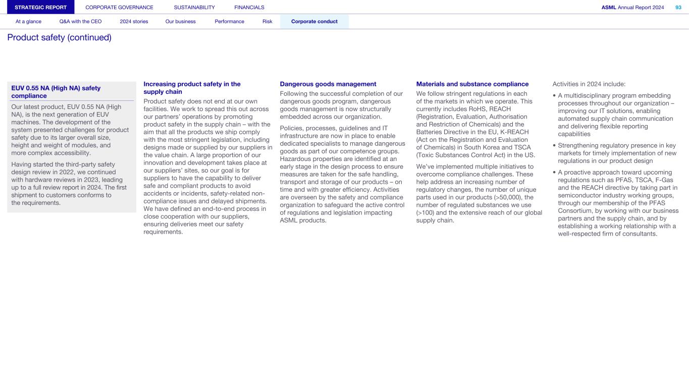 EUV 0.55 NA (High NA) safety compliance Our latest product, EUV 0.55 NA (High NA), is the next generation of EUV machines. The development of the system presented challenges for product safety due to its larger overall size, height and weight of modules, and more complex accessibility. Having started the third-party safety design review in 2022, we continued with hardware reviews in 2023, leading up to a full review report in 2024. The first shipment to customers conforms to the requirements. Increasing product safety in the supply chain Product safety does not end at our own facilities. We work to spread this out across our partners’ operations by promoting product safety in the supply chain – with the aim that all the products we ship comply with the most stringent legislation, including designs made or supplied by our suppliers in the value chain. A large proportion of our innovation and development takes place at our suppliers’ sites, so our goal is for suppliers to have the capability to deliver safe and compliant products to avoid accidents or incidents, safety-related non- compliance issues and delayed shipments. We have defined an end-to-end process in close cooperation with our suppliers, ensuring deliveries meet our safety requirements. Dangerous goods management Following the successful completion of our dangerous goods program, dangerous goods management is now structurally embedded across our organization. Policies, processes, guidelines and IT infrastructure are now in place to enable dedicated specialists to manage dangerous goods as part of our competence groups. Hazardous properties are identified at an early stage in the design process to ensure measures are taken for the safe handling, transport and storage of our products – on time and with greater efficiency. Activities are overseen by the safety and compliance organization to safeguard the active control of regulations and legislation impacting ASML products. Materials and substance compliance We follow stringent regulations in each of the markets in which we operate. This currently includes RoHS, REACH (Registration, Evaluation, Authorisation and Restriction of Chemicals) and the Batteries Directive in the EU, K-REACH (Act on the Registration and Evaluation of Chemicals) in South Korea and TSCA (Toxic Substances Control Act) in the US. We’ve implemented multiple initiatives to overcome compliance challenges. These help address an increasing number of regulatory changes, the number of unique parts used in our products (>50,000), the number of regulated substances we use (>100) and the extensive reach of our global supply chain. Activities in 2024 include: • A multidisciplinary program embedding processes throughout our organization – improving our IT solutions, enabling automated supply chain communication and delivering flexible reporting capabilities • Strengthening regulatory presence in key markets for timely implementation of new regulations in our product design • A proactive approach toward upcoming regulations such as PFAS, TSCA, F-Gas and the REACH directive by taking part in semiconductor industry working groups, through our membership of the PFAS Consortium, by working with our business partners and the supply chain, and by establishing a working relationship with a well-respected firm of consultants. STRATEGIC REPORT CORPORATE GOVERNANCE SUSTAINABILITY FINANCIALS ASML Annual Report 2024 93 At a glance Q&A with the CEO 2024 stories Our business Performance Risk Corporate conduct Product safety (continued)