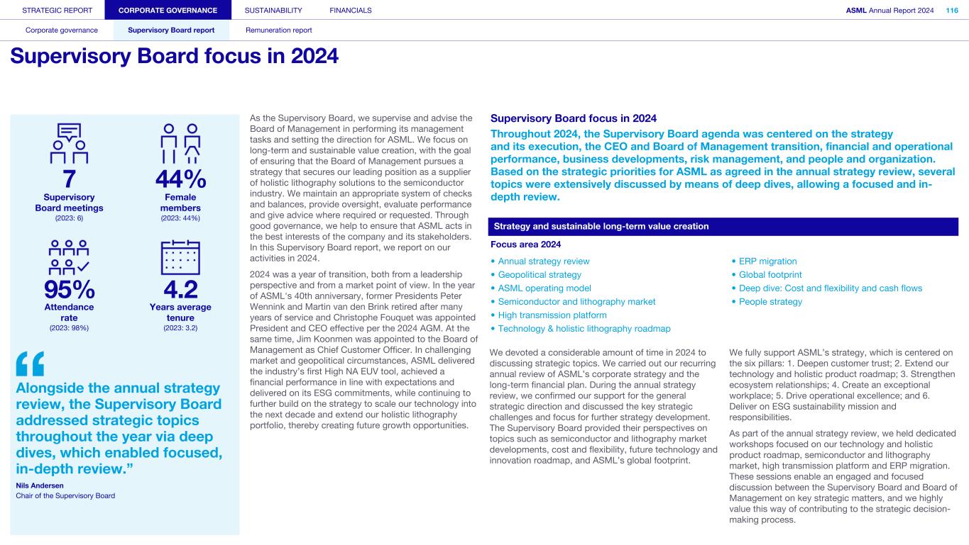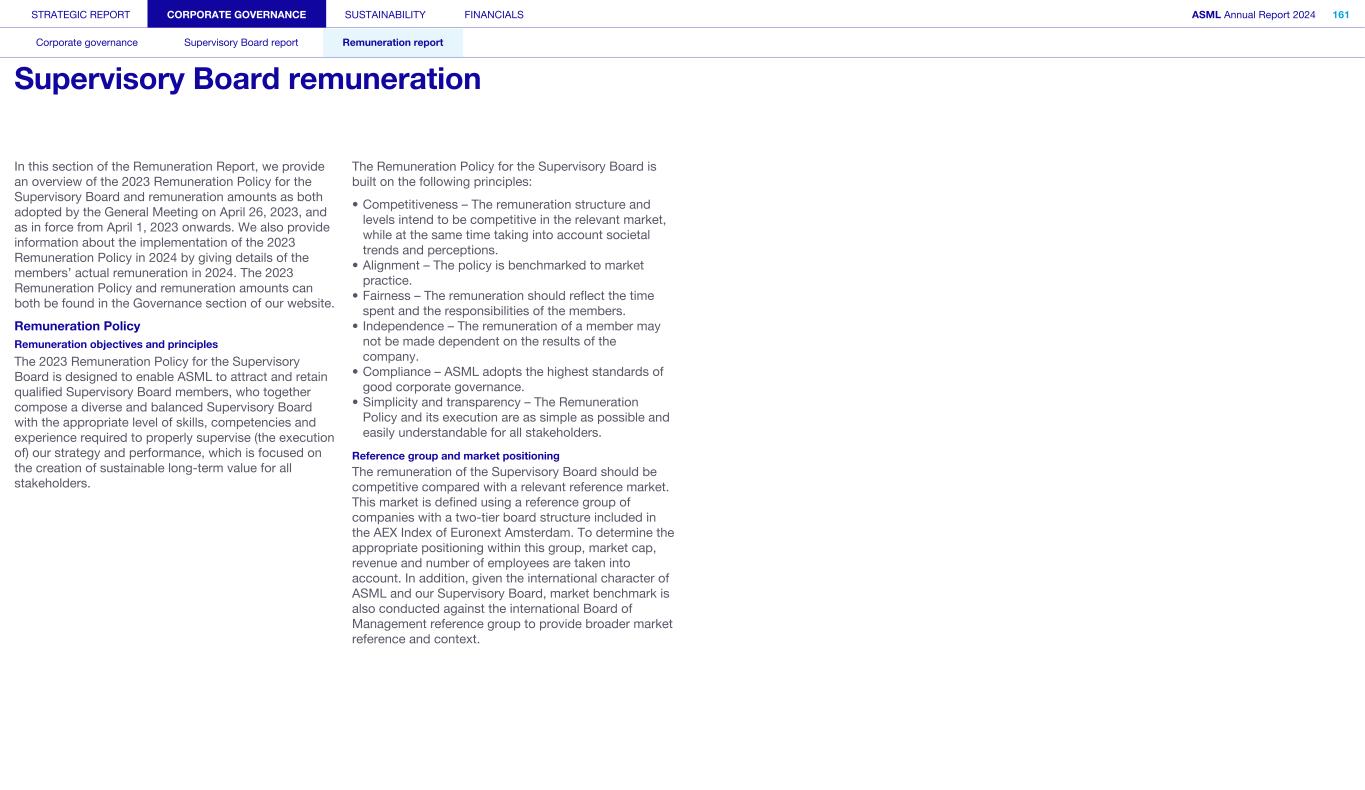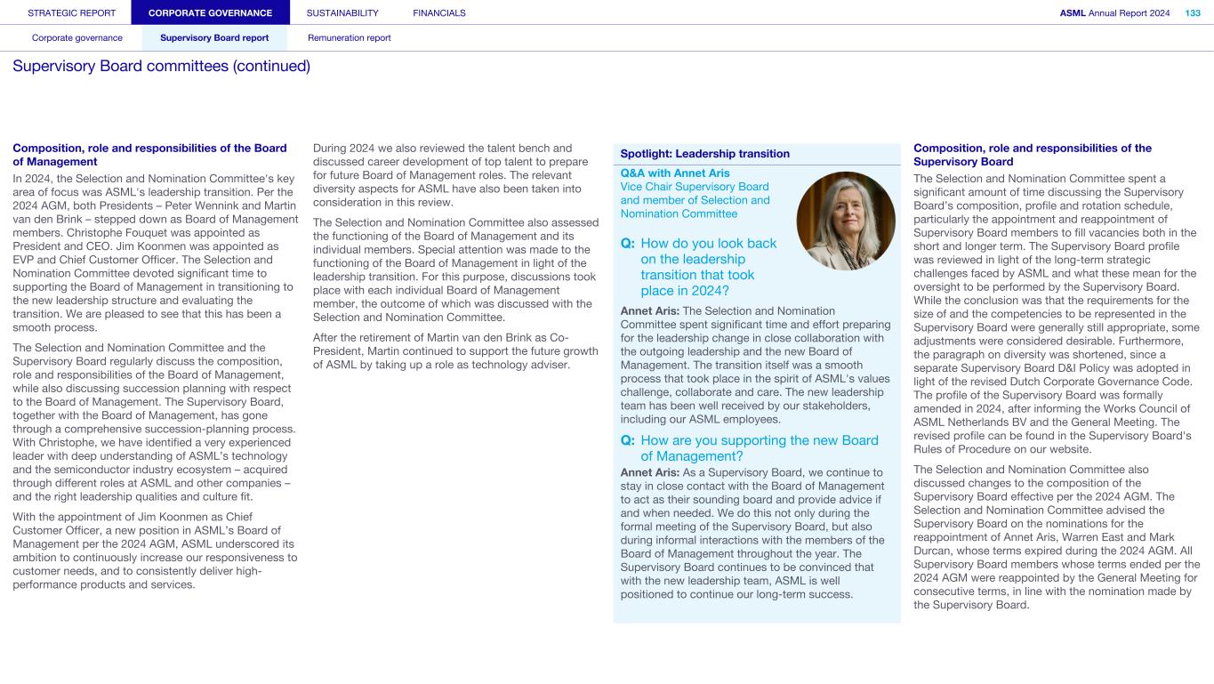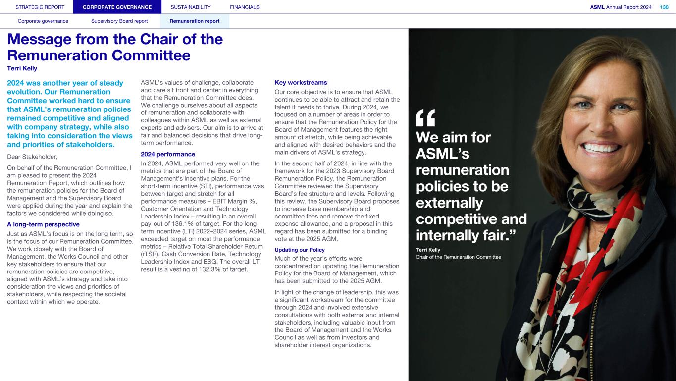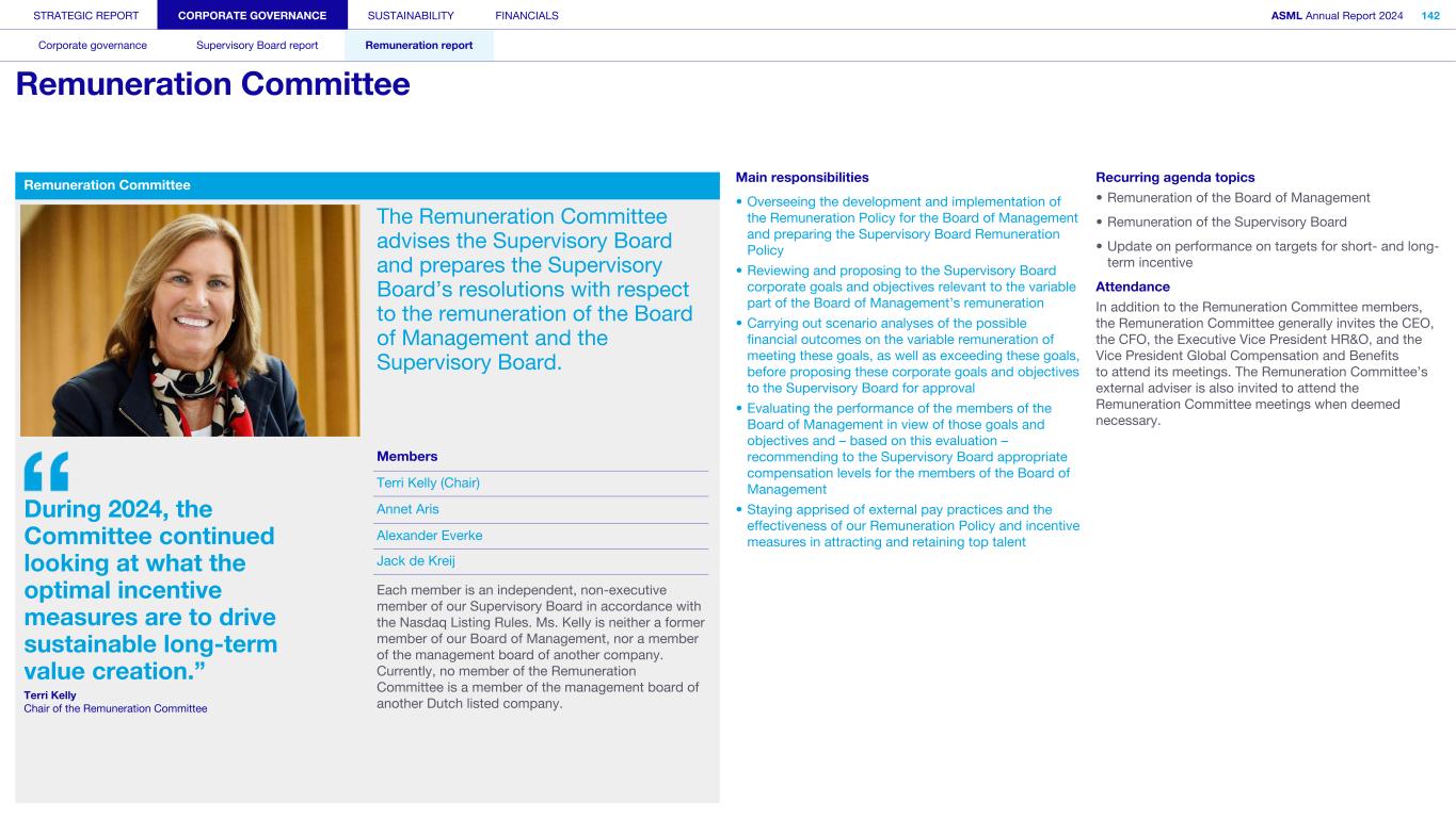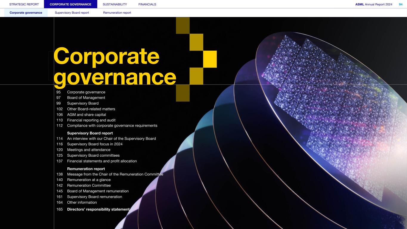STRATEGIC REPORT CORPORATE GOVERNANCE SUSTAINABILITY FINANCIALS ASML Annual Report 2024 94 Corporate governance Supervisory Board report Remuneration report Corporate governance 95 Corporate governance 97 Board of Management 99 Supervisory Board 102 Other Board-related matters 106 AGM and share capital 110 Financial reporting and audit 112 Compliance with corporate governance requirements Supervisory Board report 114 An interview with our Chair of the Supervisory Board 116 Supervisory Board focus in 2024 120 Meetings and attendance 125 Supervisory Board committees 137 Financial statements and profit allocation Remuneration report 138 Message from the Chair of the Remuneration Committee 140 Remuneration at a glance 142 Remuneration Committee 145 Board of Management remuneration 161 Supervisory Board remuneration 164 Other information 165 Directors’ responsibility statement