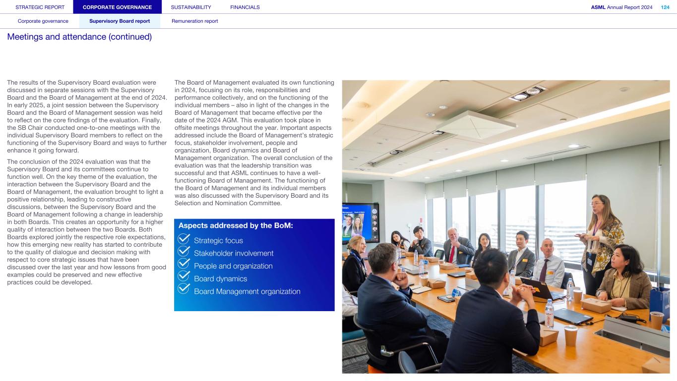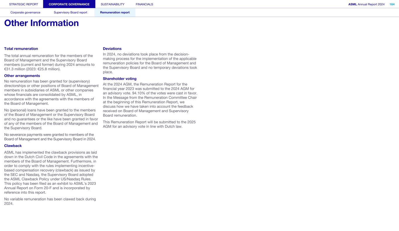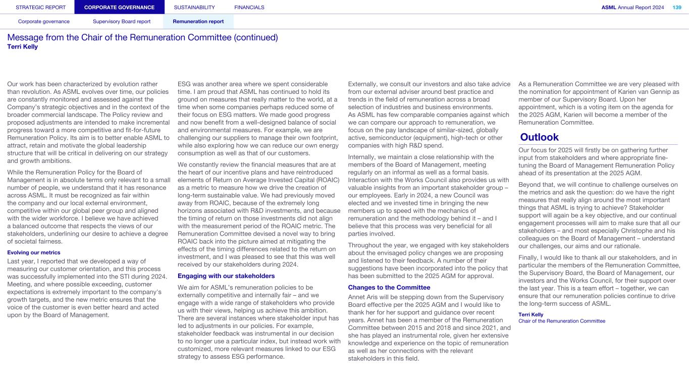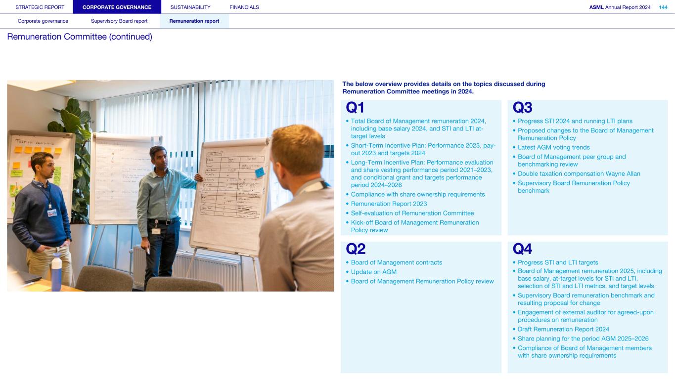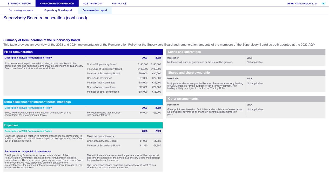 STRATEGIC REPORT CORPORATE GOVERNANCE SUSTAINABILITY FINANCIALS ASML Annual Report 2024 94 Corporate governance Supervisory Board report Remuneration report Corporate governance 95 Corporate governance 97 Board of Management 99 Supervisory Board 102 Other Board-related matters 106 AGM and share capital 110 Financial reporting and audit 112 Compliance with corporate governance requirements Supervisory Board report 114 An interview with our Chair of the Supervisory Board 116 Supervisory Board focus in 2024 120 Meetings and attendance 125 Supervisory Board committees 137 Financial statements and profit allocation Remuneration report 138 Message from the Chair of the Remuneration Committee 140 Remuneration at a glance 142 Remuneration Committee 145 Board of Management remuneration 161 Supervisory Board remuneration 164 Other information 165 Directors’ responsibility statement