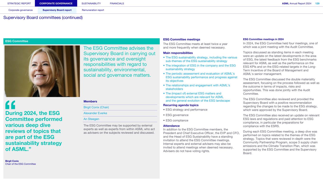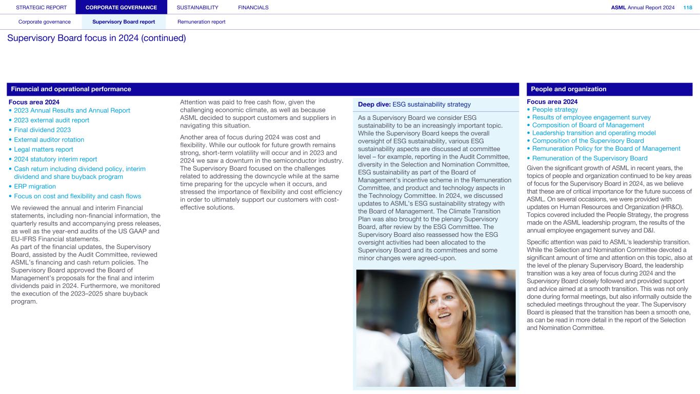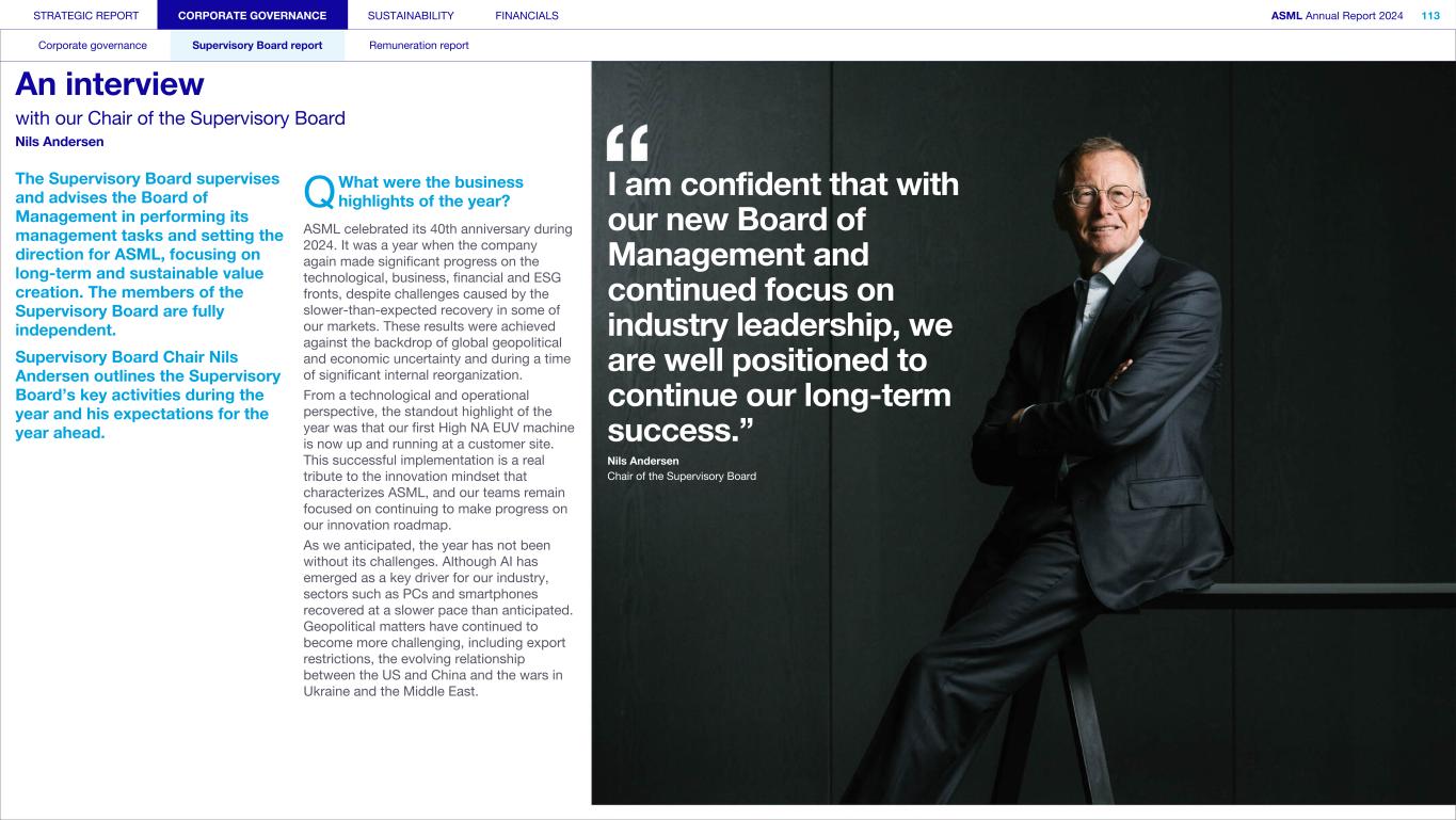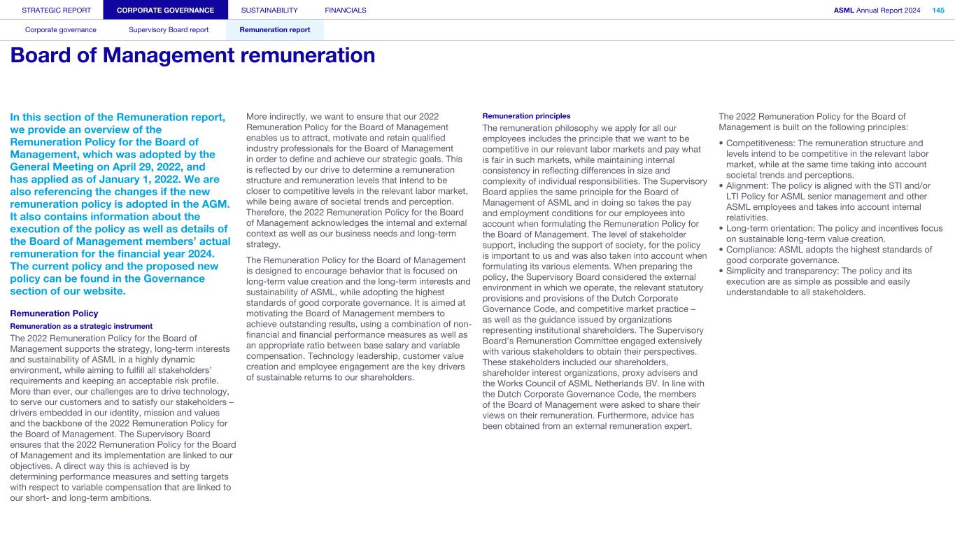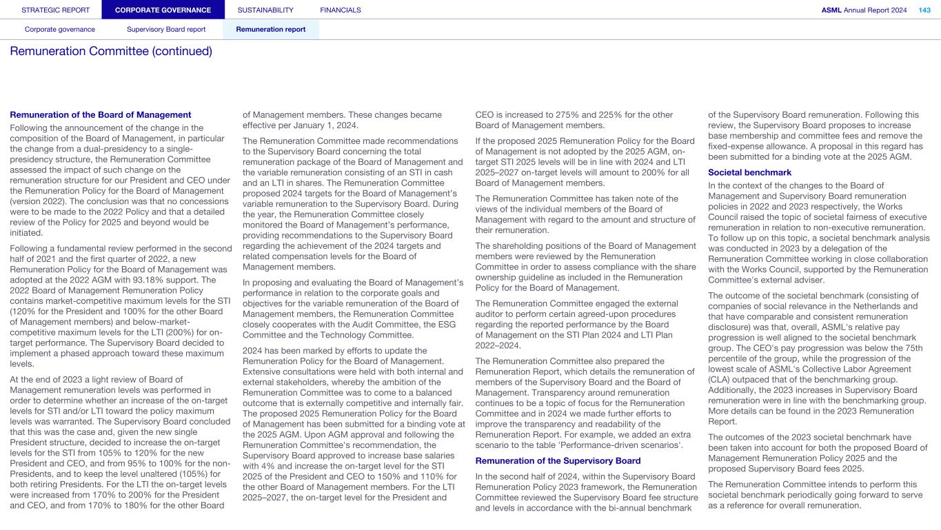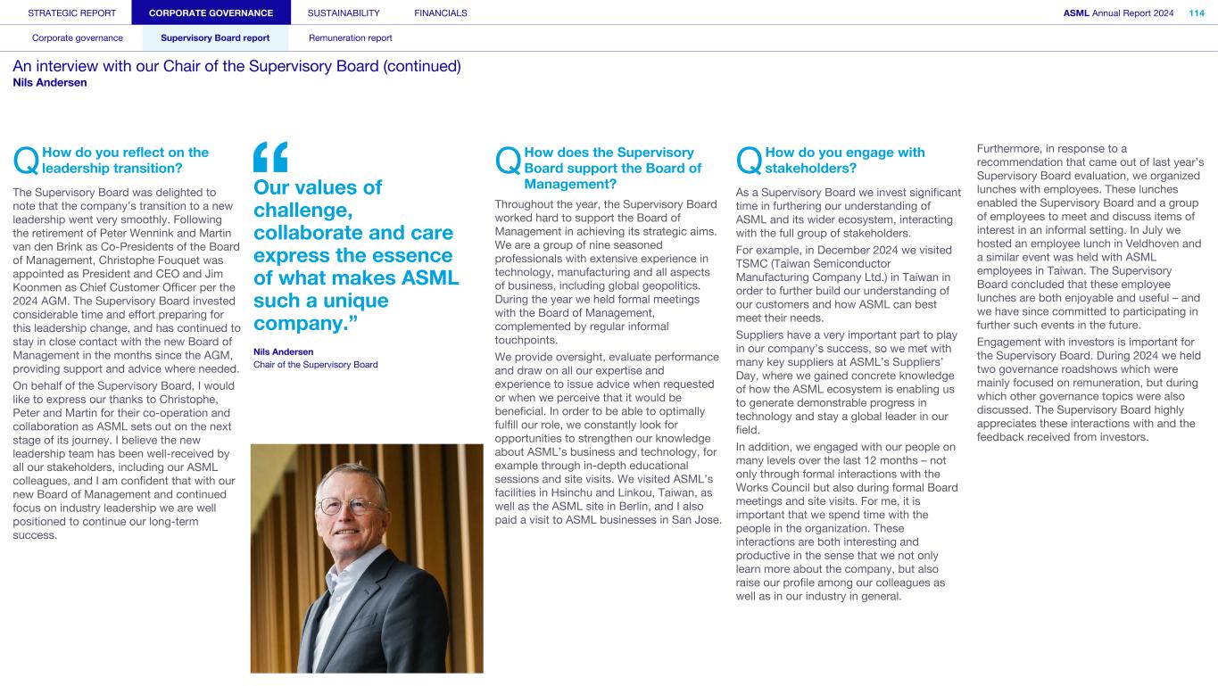 STRATEGIC REPORT CORPORATE GOVERNANCE SUSTAINABILITY FINANCIALS ASML Annual Report 2024 94 Corporate governance Supervisory Board report Remuneration report Corporate governance 95 Corporate governance 97 Board of Management 99 Supervisory Board 102 Other Board-related matters 106 AGM and share capital 110 Financial reporting and audit 112 Compliance with corporate governance requirements Supervisory Board report 114 An interview with our Chair of the Supervisory Board 116 Supervisory Board focus in 2024 120 Meetings and attendance 125 Supervisory Board committees 137 Financial statements and profit allocation Remuneration report 138 Message from the Chair of the Remuneration Committee 140 Remuneration at a glance 142 Remuneration Committee 145 Board of Management remuneration 161 Supervisory Board remuneration 164 Other information 165 Directors’ responsibility statement