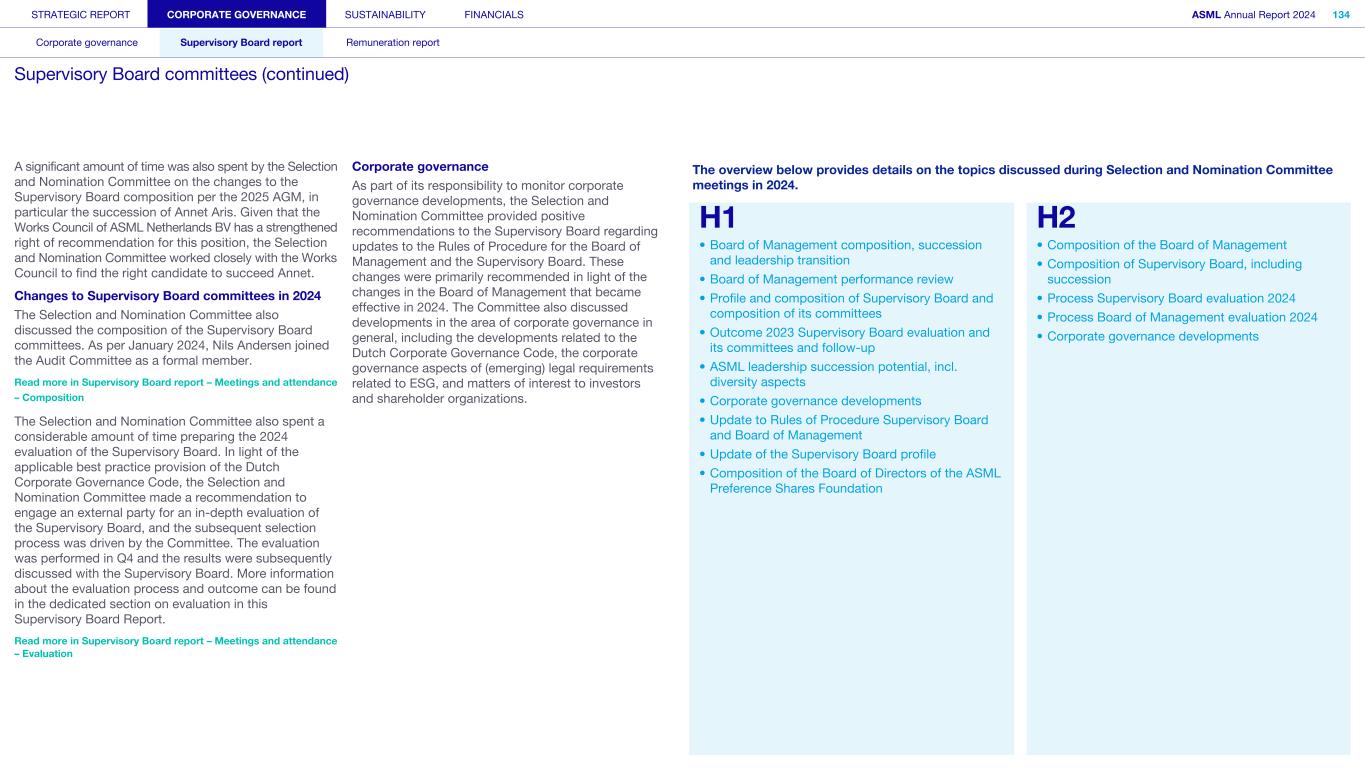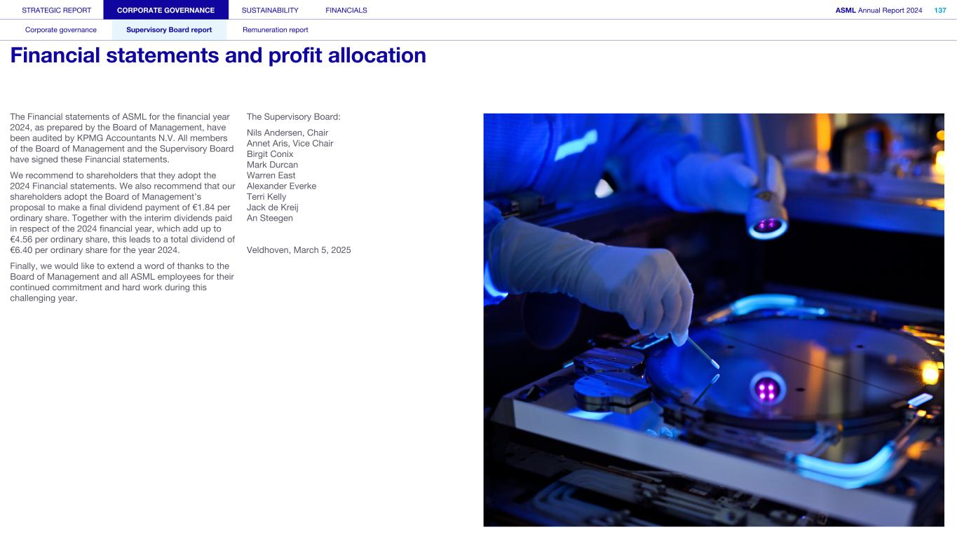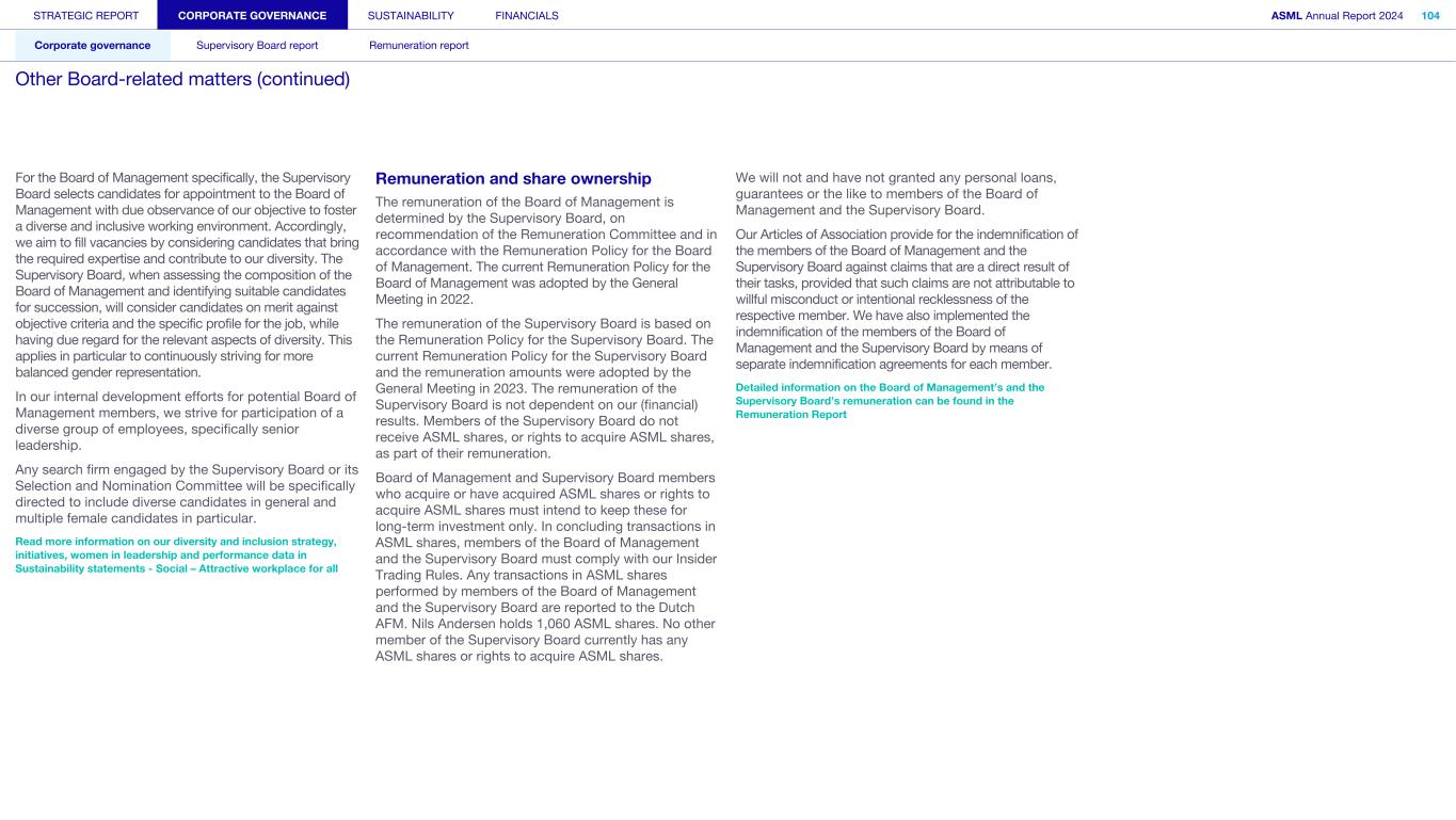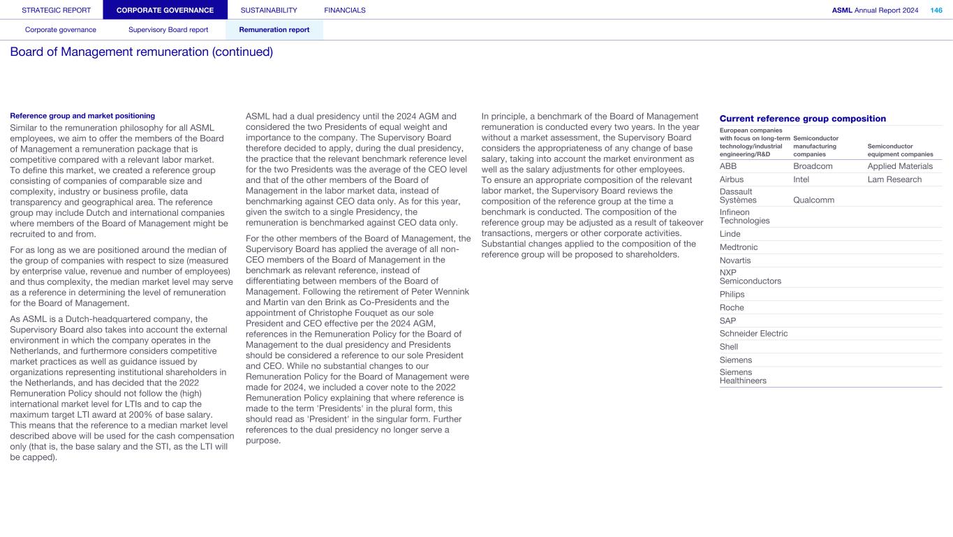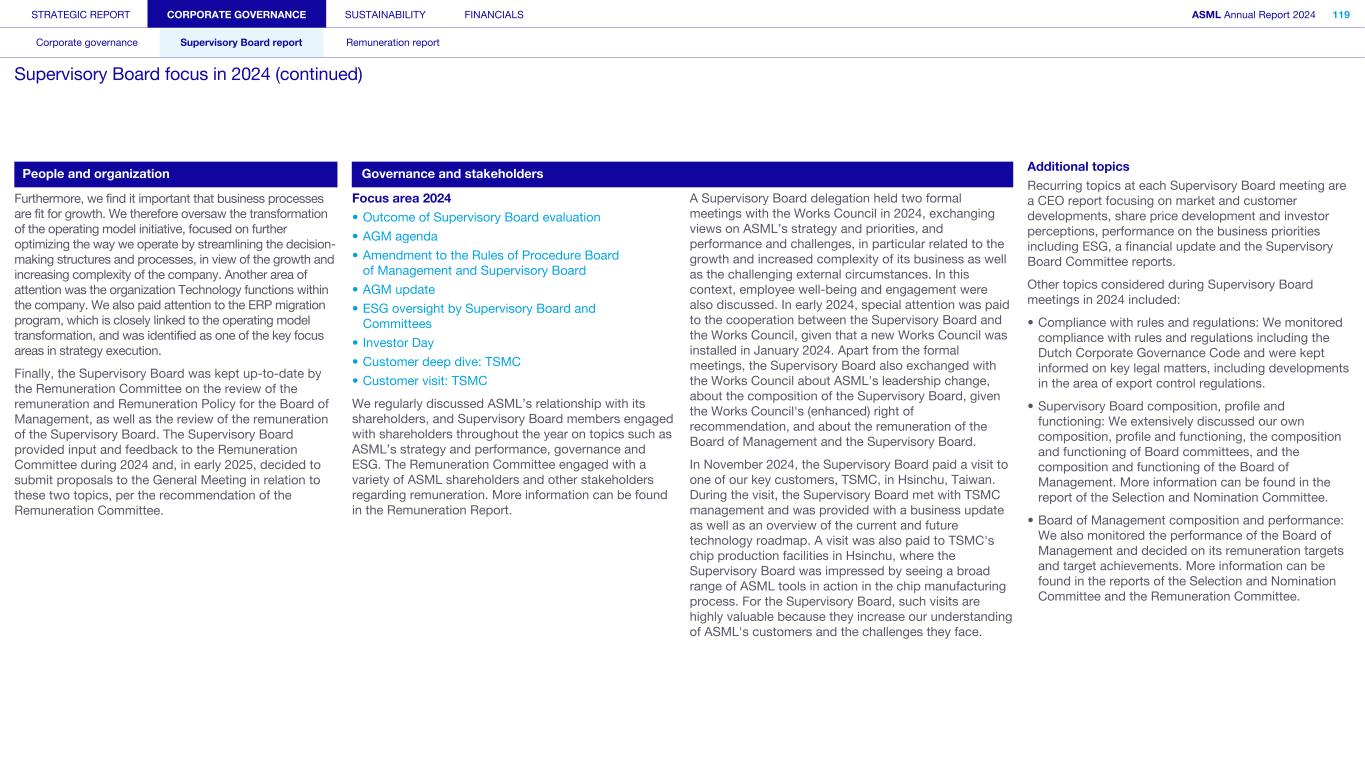 STRATEGIC REPORT CORPORATE GOVERNANCE SUSTAINABILITY FINANCIALS ASML Annual Report 2024 94 Corporate governance Supervisory Board report Remuneration report Corporate governance 95 Corporate governance 97 Board of Management 99 Supervisory Board 102 Other Board-related matters 106 AGM and share capital 110 Financial reporting and audit 112 Compliance with corporate governance requirements Supervisory Board report 114 An interview with our Chair of the Supervisory Board 116 Supervisory Board focus in 2024 120 Meetings and attendance 125 Supervisory Board committees 137 Financial statements and profit allocation Remuneration report 138 Message from the Chair of the Remuneration Committee 140 Remuneration at a glance 142 Remuneration Committee 145 Board of Management remuneration 161 Supervisory Board remuneration 164 Other information 165 Directors’ responsibility statement