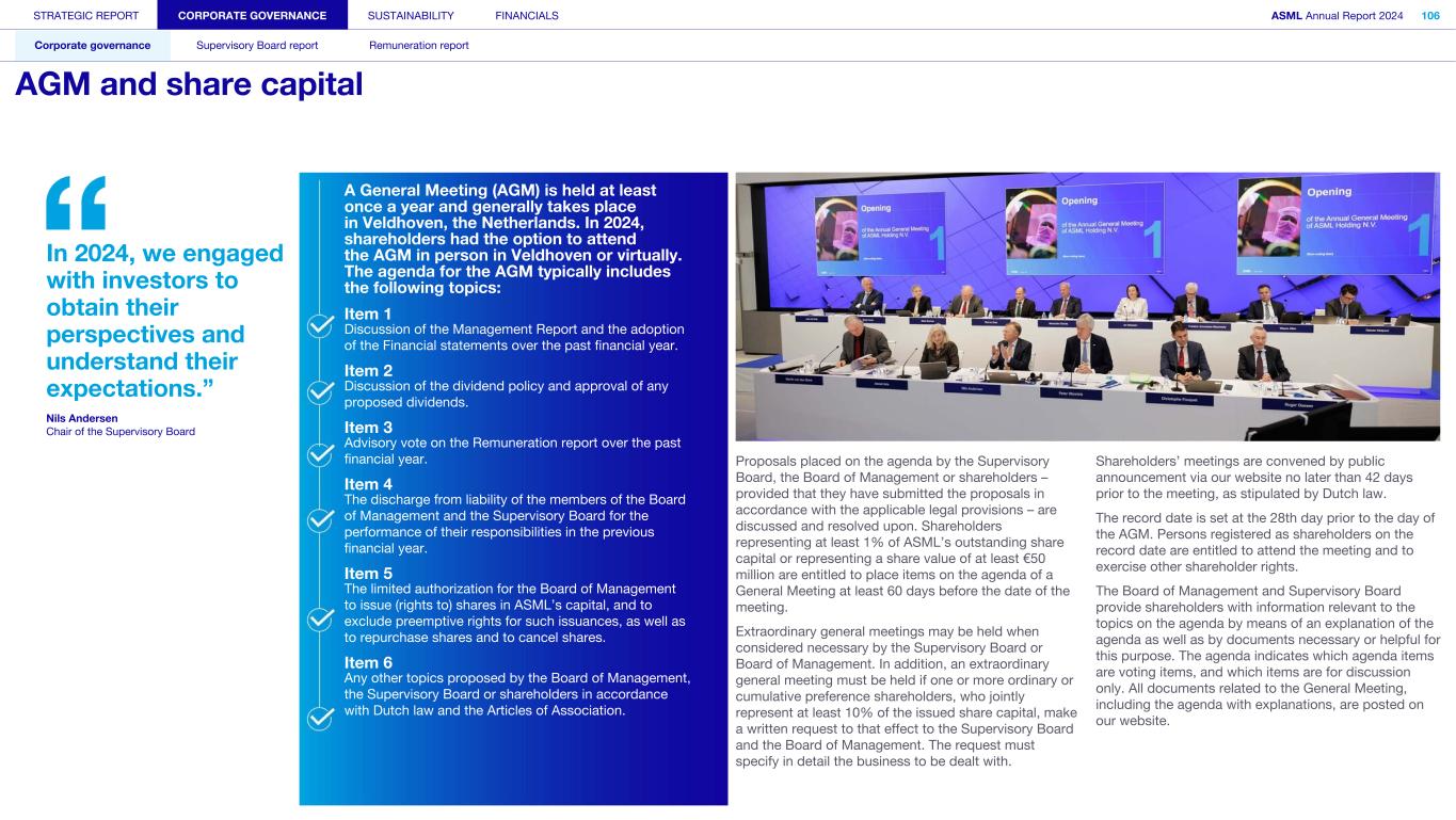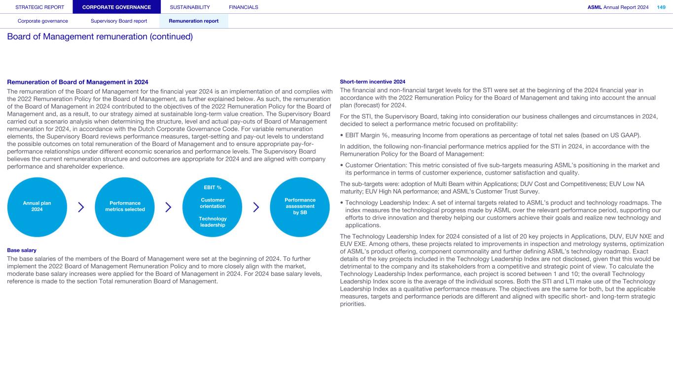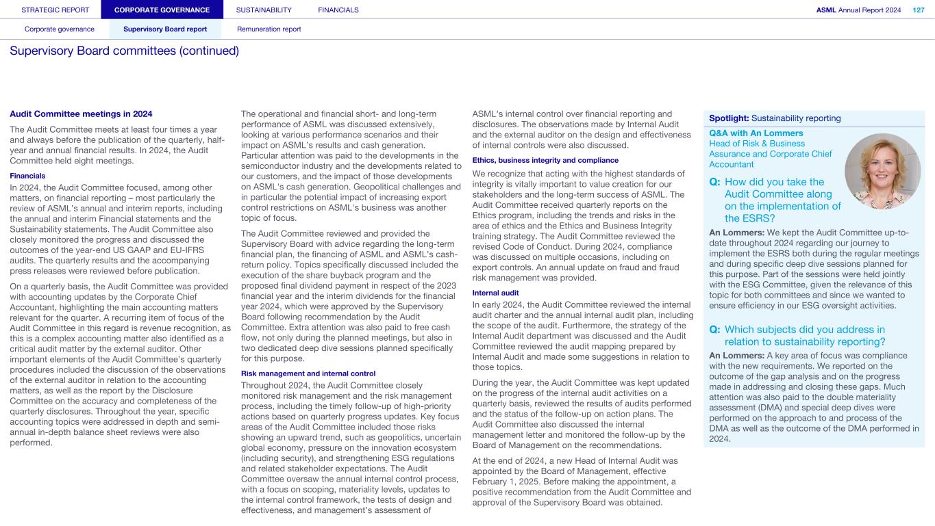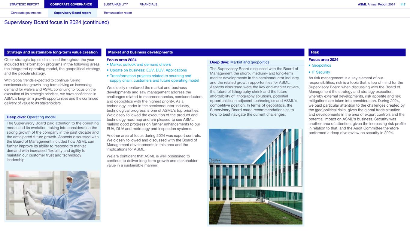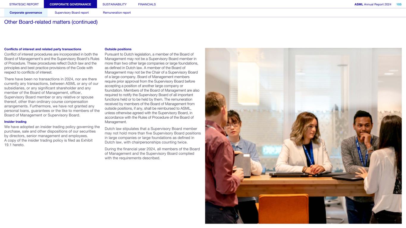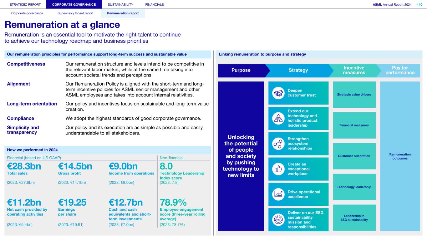 STRATEGIC REPORT CORPORATE GOVERNANCE SUSTAINABILITY FINANCIALS ASML Annual Report 2024 94 Corporate governance Supervisory Board report Remuneration report Corporate governance 95 Corporate governance 97 Board of Management 99 Supervisory Board 102 Other Board-related matters 106 AGM and share capital 110 Financial reporting and audit 112 Compliance with corporate governance requirements Supervisory Board report 114 An interview with our Chair of the Supervisory Board 116 Supervisory Board focus in 2024 120 Meetings and attendance 125 Supervisory Board committees 137 Financial statements and profit allocation Remuneration report 138 Message from the Chair of the Remuneration Committee 140 Remuneration at a glance 142 Remuneration Committee 145 Board of Management remuneration 161 Supervisory Board remuneration 164 Other information 165 Directors’ responsibility statement