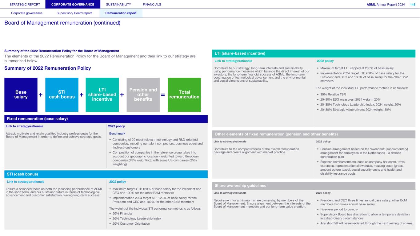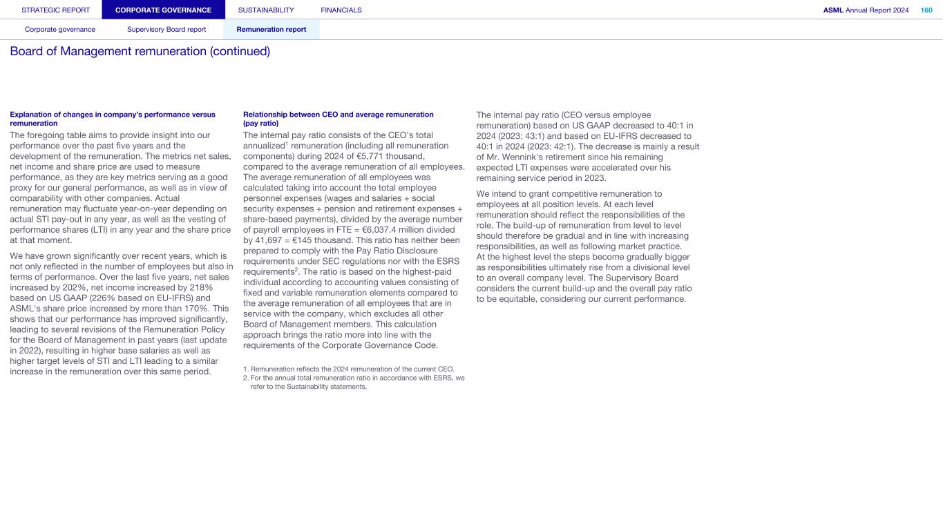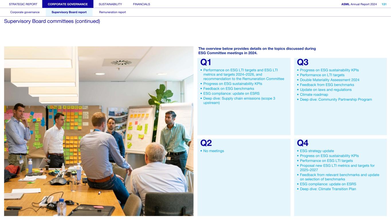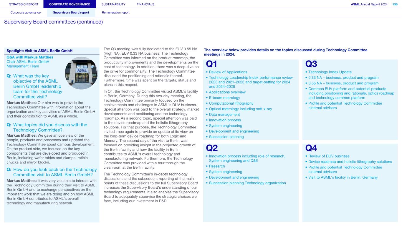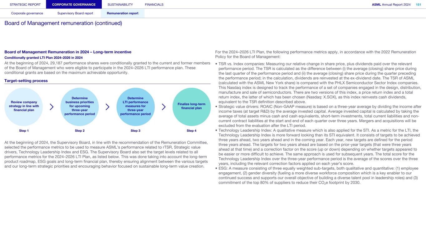 STRATEGIC REPORT CORPORATE GOVERNANCE SUSTAINABILITY FINANCIALS ASML Annual Report 2024 94 Corporate governance Supervisory Board report Remuneration report Corporate governance 95 Corporate governance 97 Board of Management 99 Supervisory Board 102 Other Board-related matters 106 AGM and share capital 110 Financial reporting and audit 112 Compliance with corporate governance requirements Supervisory Board report 114 An interview with our Chair of the Supervisory Board 116 Supervisory Board focus in 2024 120 Meetings and attendance 125 Supervisory Board committees 137 Financial statements and profit allocation Remuneration report 138 Message from the Chair of the Remuneration Committee 140 Remuneration at a glance 142 Remuneration Committee 145 Board of Management remuneration 161 Supervisory Board remuneration 164 Other information 165 Directors’ responsibility statement