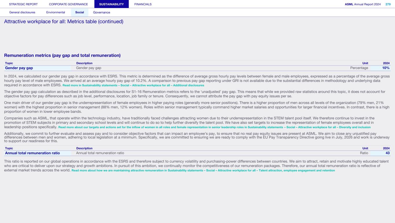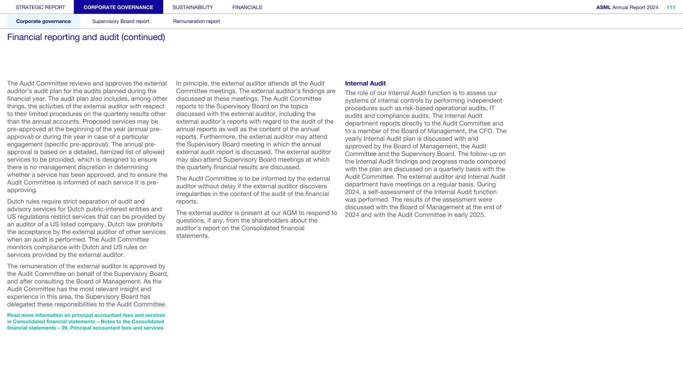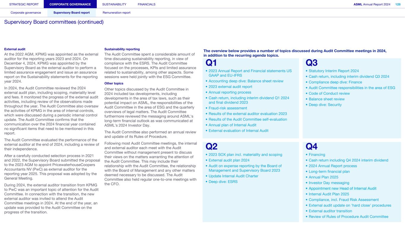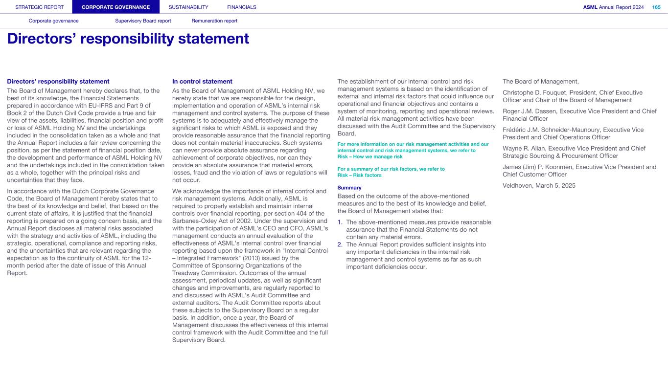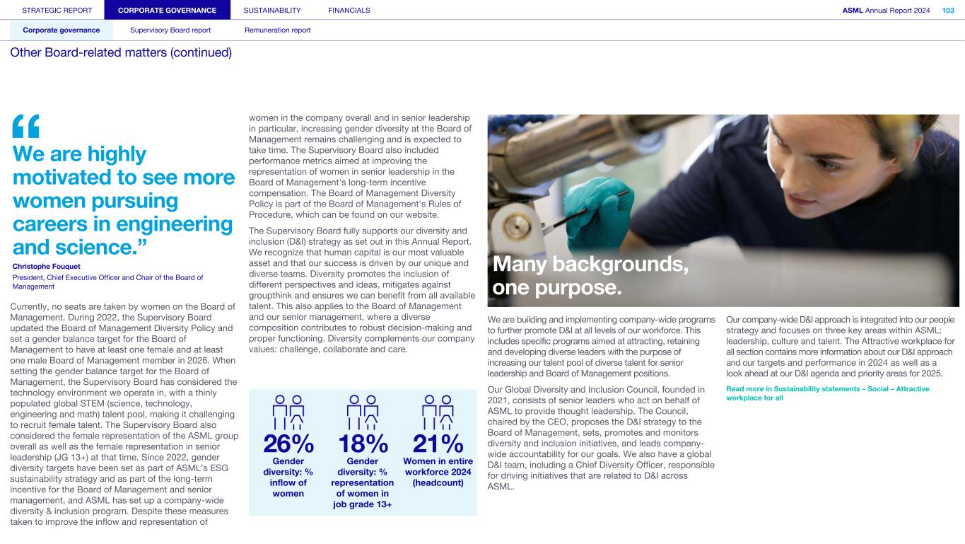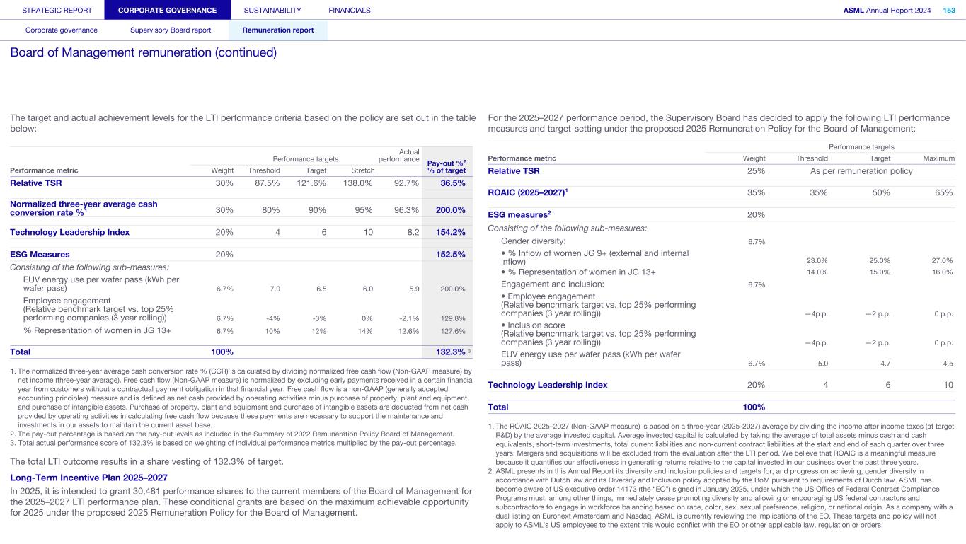 STRATEGIC REPORT CORPORATE GOVERNANCE SUSTAINABILITY FINANCIALS ASML Annual Report 2024 94 Corporate governance Supervisory Board report Remuneration report Corporate governance 95 Corporate governance 97 Board of Management 99 Supervisory Board 102 Other Board-related matters 106 AGM and share capital 110 Financial reporting and audit 112 Compliance with corporate governance requirements Supervisory Board report 114 An interview with our Chair of the Supervisory Board 116 Supervisory Board focus in 2024 120 Meetings and attendance 125 Supervisory Board committees 137 Financial statements and profit allocation Remuneration report 138 Message from the Chair of the Remuneration Committee 140 Remuneration at a glance 142 Remuneration Committee 145 Board of Management remuneration 161 Supervisory Board remuneration 164 Other information 165 Directors’ responsibility statement