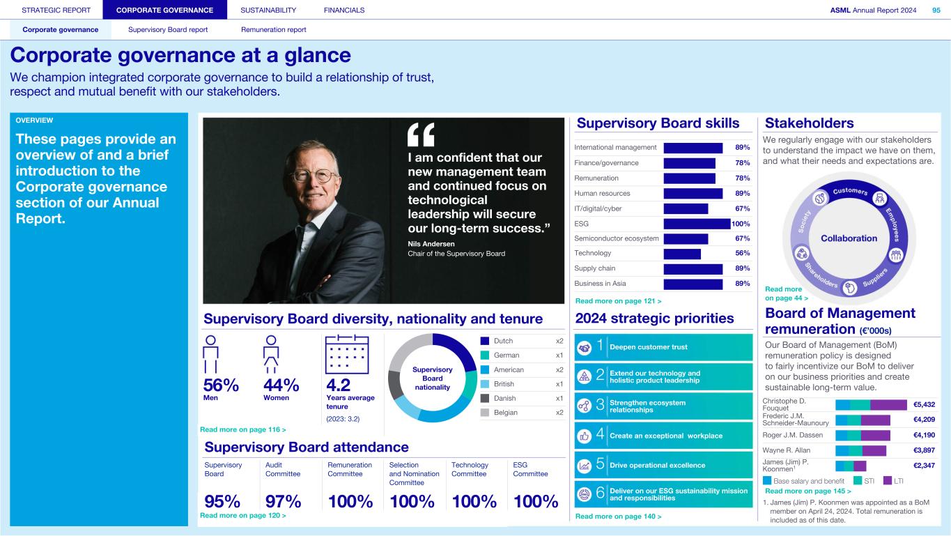 OVERVIEW These pages provide an overview of and a brief introduction to the Corporate governance section of our Annual Report. I am confident that our new management team and continued focus on technological leadership will secure our long-term success.” Nils Andersen Chair of the Supervisory Board Supervisory Board skills International management 89% Finance/governance 78% Remuneration 78% Human resources 89% IT/digital/cyber 67% ESG 100% Semiconductor ecosystem 67% Technology 56% Supply chain 89% Business in Asia 89% Stakeholders We regularly engage with our stakeholders to understand the impact we have on them, and what their needs and expectations are. Read more on page 44 > Board of Management remuneration (€’000s) Our Board of Management (BoM) remuneration policy is designed to fairly incentivize our BoM to deliver on our business priorities and create sustainable long-term value. Christophe D. Fouquet €5,432 Frederic J.M. Schneider-Maunoury €4,209 Roger J.M. Dassen €4,190 Wayne R. Allan €3,897 James (Jim) P. Koonmen1 €2,347 Base salary and benefit STI LTI Read more on page 145 > 1. James (Jim) P. Koonmen was appointed as a BoM member on April 24, 2024. Total remuneration is included as of this date. STRATEGIC REPORT CORPORATE GOVERNANCE SUSTAINABILITY FINANCIALS ASML Annual Report 2024 95 Corporate governance Supervisory Board report Remuneration report Corporate governance at a glance We champion integrated corporate governance to build a relationship of trust, respect and mutual benefit with our stakeholders. Supervisory Board diversity, nationality and tenure Supervisory Board attendance Supervisory Board Audit Committee Remuneration Committee Selection and Nomination Committee Technology Committee ESG Committee 95% 97% 100% 100% 100% 100% Read more on page 120 > 56% 44% 4.2 Men Women Years average tenure (2023: 3.2) Read more on page 116 > Dutch x2 German x1 American x2 British x1 Danish x1 Belgian x2 Supervisory Board nationality Read more on page 121 > 2024 strategic priorities 1 Deepen customer trust 2 Extend our technology and holistic product leadership 3 Strengthen ecosystem relationships 4 Create an exceptional workplace 5 Drive operational excellence 6 Deliver on our ESG sustainability mission and responsibilities Read more on page 140 >