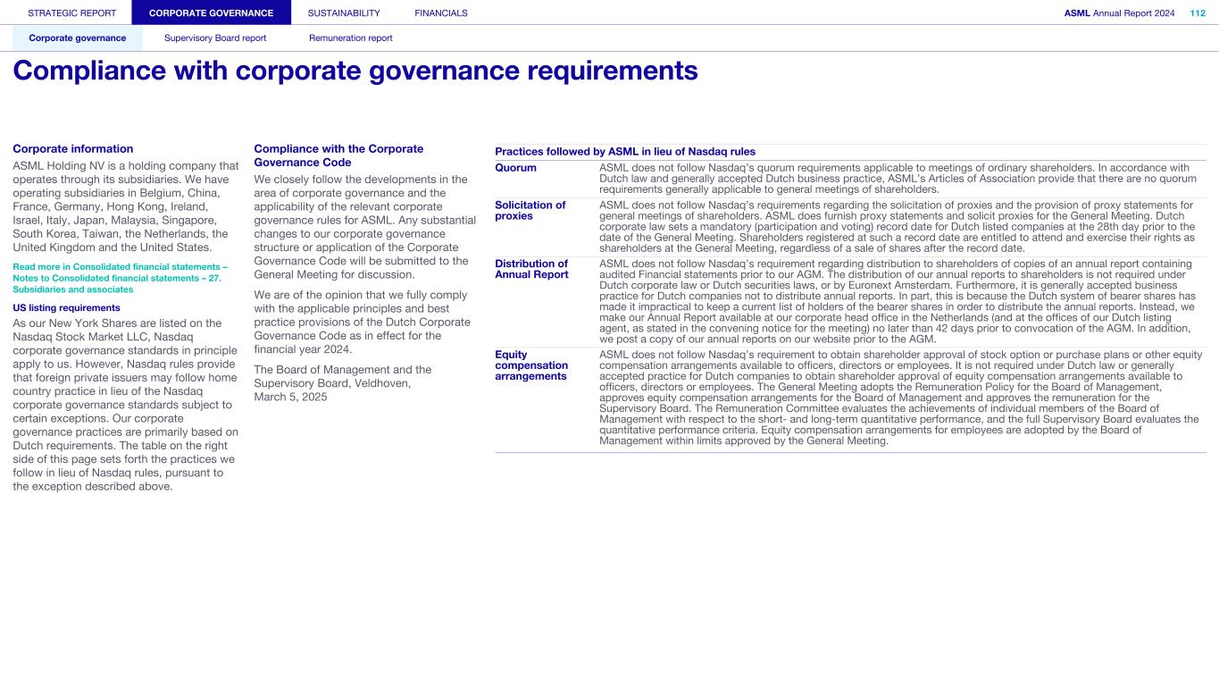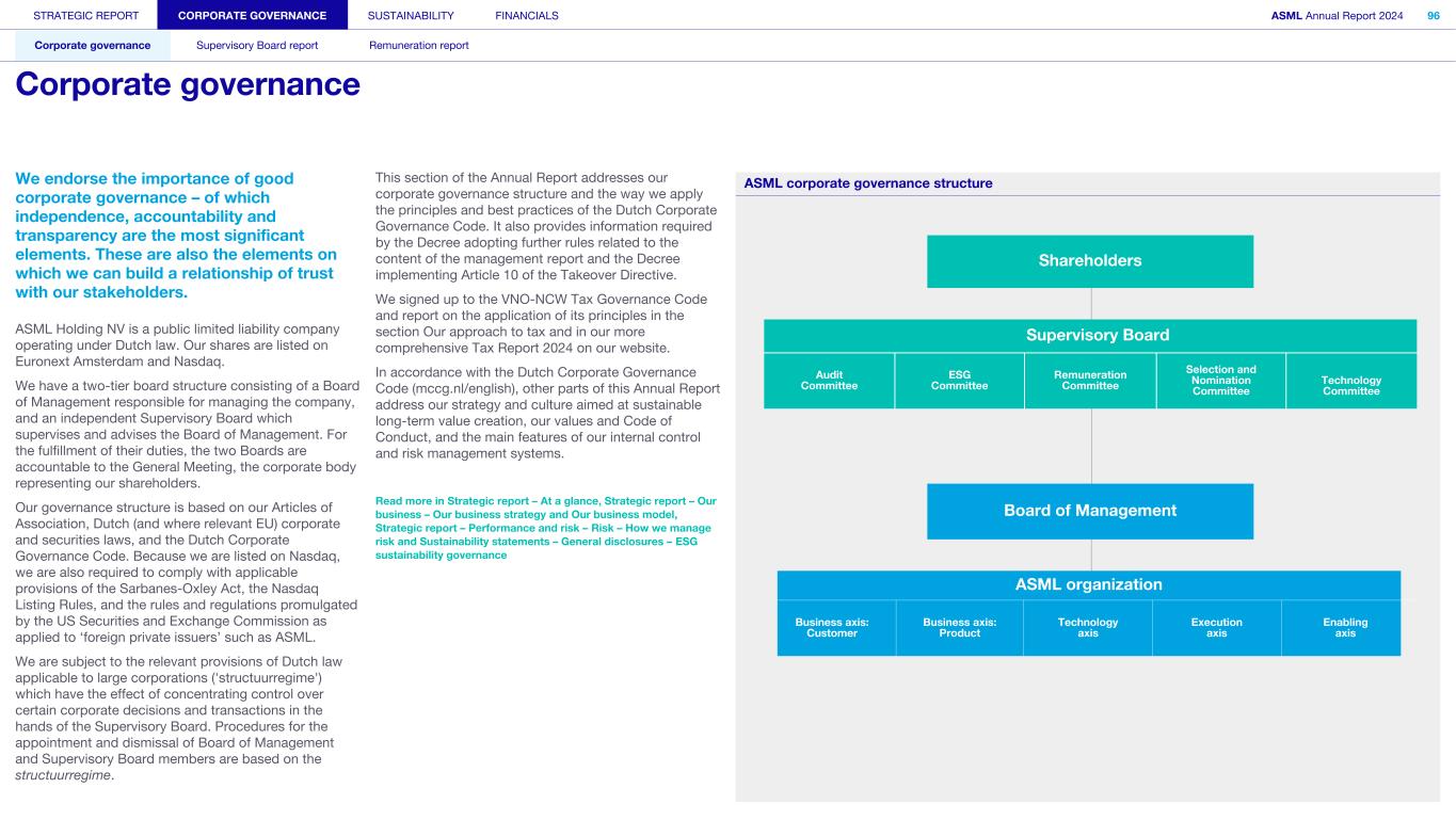 We endorse the importance of good corporate governance – of which independence, accountability and transparency are the most significant elements. These are also the elements on which we can build a relationship of trust with our stakeholders. ASML Holding NV is a public limited liability company operating under Dutch law. Our shares are listed on Euronext Amsterdam and Nasdaq. We have a two-tier board structure consisting of a Board of Management responsible for managing the company, and an independent Supervisory Board which supervises and advises the Board of Management. For the fulfillment of their duties, the two Boards are accountable to the General Meeting, the corporate body representing our shareholders. Our governance structure is based on our Articles of Association, Dutch (and where relevant EU) corporate and securities laws, and the Dutch Corporate Governance Code. Because we are listed on Nasdaq, we are also required to comply with applicable provisions of the Sarbanes-Oxley Act, the Nasdaq Listing Rules, and the rules and regulations promulgated by the US Securities and Exchange Commission as applied to ‘foreign private issuers’ such as ASML. We are subject to the relevant provisions of Dutch law applicable to large corporations ('structuurregime') which have the effect of concentrating control over certain corporate decisions and transactions in the hands of the Supervisory Board. Procedures for the appointment and dismissal of Board of Management and Supervisory Board members are based on the structuurregime. This section of the Annual Report addresses our corporate governance structure and the way we apply the principles and best practices of the Dutch Corporate Governance Code. It also provides information required by the Decree adopting further rules related to the content of the management report and the Decree implementing Article 10 of the Takeover Directive. We signed up to the VNO-NCW Tax Governance Code and report on the application of its principles in the section Our approach to tax and in our more comprehensive Tax Report 2024 on our website. In accordance with the Dutch Corporate Governance Code (mccg.nl/english), other parts of this Annual Report address our strategy and culture aimed at sustainable long-term value creation, our values and Code of Conduct, and the main features of our internal control and risk management systems. Read more in Strategic report – At a glance, Strategic report – Our business – Our business strategy and Our business model, Strategic report – Performance and risk – Risk – How we manage risk and Sustainability statements – General disclosures – ESG sustainability governance ASML corporate governance structure Shareholders Supervisory Board Audit Committee ESG Committee Remuneration Committee Selection and Nomination Committee Technology Committee Board of Management STRATEGIC REPORT CORPORATE GOVERNANCE SUSTAINABILITY FINANCIALS ASML Annual Report 2024 96 Corporate governance Supervisory Board report Remuneration report Corporate governance ASML organization Business axis: Customer Business axis: Product Technology axis Execution axis Enabling axis