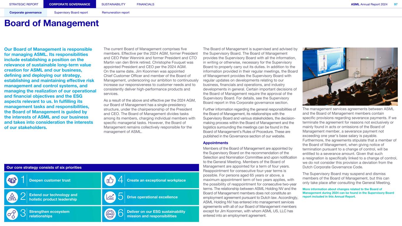 Our Board of Management is responsible for managing ASML. Its responsibilities include establishing a position on the relevance of sustainable long-term value creation for ASML and our business, defining and deploying our strategy, establishing and maintaining effective risk management and control systems, and managing the realization of our operational and financial objectives and the ESG aspects relevant to us. In fulfilling its management tasks and responsibilities, the Board of Management is guided by the interests of ASML and our business and takes into consideration the interests of our stakeholders. The current Board of Management comprises five members. Effective per the 2024 AGM, former President and CEO Peter Wennink and former President and CTO Martin van den Brink retired. Christophe Fouquet was appointed President and CEO per the 2024 AGM. On the same date, Jim Koonmen was appointed Chief Customer Officer and member of the Board of Management, underscoring our ambition to continuously increase our responsiveness to customer needs and to consistently deliver high-performance products and services. As a result of the above and effective per the 2024 AGM, our Board of Management has a single-presidency structure, under the chairpersonship of the President and CEO. The Board of Management divides tasks among its members, charging individual members with specific managerial tasks. However, the Board of Management remains collectively responsible for the management of ASML. The Board of Management is supervised and advised by the Supervisory Board. The Board of Management provides the Supervisory Board with all the information, in writing or otherwise, necessary for the Supervisory Board to properly carry out its duties. In addition to the information provided in their regular meetings, the Board of Management provides the Supervisory Board with regular updates on developments relating to our business, financials and operations, and industry developments in general. Certain important decisions of the Board of Management require the approval of the Supervisory Board. For details, see the Supervisory Board report in this Corporate governance section. Further information regarding the general responsibilities of the Board of Management, its relationships with the Supervisory Board and various stakeholders, the decision- making process within the Board of Management and the logistics surrounding the meetings can be found in the Board of Management’s Rules of Procedure. These are published in the Governance section of our website. Appointments Members of the Board of Management are appointed by the Supervisory Board on the recommendation of the Selection and Nomination Committee and upon notification to the General Meeting. Members of the Board of Management are appointed for a term of four years. Reappointment for consecutive four-year terms is possible. For persons aged 65 years or above, a maximum appointment term of two years applies, with the possibility of reappointment for consecutive two-year terms. The relationship between ASML Holding NV and the Board of Management members does not constitute an employment agreement pursuant to Dutch law. Accordingly, ASML Holding NV has entered into management services agreements with all of our Board of Management members except for Jim Koonmen, with whom ASML US, LLC has entered into an employment agreement. The management services agreements between ASML and the Board of Management members contain specific provisions regarding severance payments. If we terminate the agreement for reasons not exclusively or mainly found in acts or omissions of the Board of Management member, a severance payment not exceeding one year’s base salary is payable. Furthermore, the agreements stipulate that a member of the Board of Management, when giving notice of termination pursuant to a change of control, will be entitled to a severance amount. Given that such a resignation is specifically linked to a change of control, we do not consider this provision a deviation from the Dutch Corporate Governance Code. The Supervisory Board may suspend and dismiss members of the Board of Management, but this can only take place after consulting the General Meeting. More information about changes related to the Board of Management during 2024 can be found in the Supervisory Board report included in this Annual Report. STRATEGIC REPORT CORPORATE GOVERNANCE SUSTAINABILITY FINANCIALS ASML Annual Report 2024 97 Corporate governance Supervisory Board report Remuneration report Board of Management Our core strategy consists of six priorities 1 Deepen customer trust 4 Create an exceptional workplace 2 Extend our technology and holistic product leadership 5 Drive operational excellence 3 Strengthen ecosystem relationships 6 Deliver on our ESG sustainability mission and responsibilities