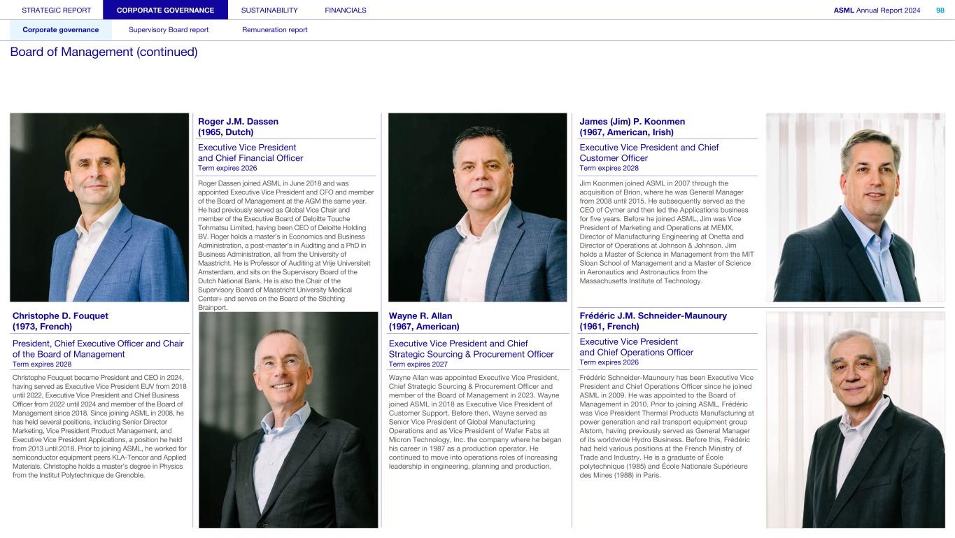 Roger J.M. Dassen (1965, Dutch) James (Jim) P. Koonmen (1967, American, Irish) Executive Vice President and Chief Financial Officer Term expires 2026 Executive Vice President and Chief Customer Officer Term expires 2028 Roger Dassen joined ASML in June 2018 and was appointed Executive Vice President and CFO and member of the Board of Management at the AGM the same year. He had previously served as Global Vice Chair and member of the Executive Board of Deloitte Touche Tohmatsu Limited, having been CEO of Deloitte Holding BV. Roger holds a master’s in Economics and Business Administration, a post-master’s in Auditing and a PhD in Business Administration, all from the University of Maastricht. He is Professor of Auditing at Vrije Universiteit Amsterdam, and sits on the Supervisory Board of the Dutch National Bank. He is also the Chair of the Supervisory Board of Maastricht University Medical Center+ and serves on the Board of the Stichting Brainport. Jim Koonmen joined ASML in 2007 through the acquisition of Brion, where he was General Manager from 2008 until 2015. He subsequently served as the CEO of Cymer and then led the Applications business for five years. Before he joined ASML, Jim was Vice President of Marketing and Operations at MEMX, Director of Manufacturing Engineering at Onetta and Director of Operations at Johnson & Johnson. Jim holds a Master of Science in Management from the MIT Sloan School of Management and a Master of Science in Aeronautics and Astronautics from the Massachusetts Institute of Technology. Christophe D. Fouquet (1973, French) Wayne R. Allan (1967, American) Frédéric J.M. Schneider-Maunoury (1961, French) President, Chief Executive Officer and Chair of the Board of Management Term expires 2028 Executive Vice President and Chief Strategic Sourcing & Procurement Officer Term expires 2027 Executive Vice President and Chief Operations Officer Term expires 2026 Christophe Fouquet became President and CEO in 2024, having served as Executive Vice President EUV from 2018 until 2022, Executive Vice President and Chief Business Officer from 2022 until 2024 and member of the Board of Management since 2018. Since joining ASML in 2008, he has held several positions, including Senior Director Marketing, Vice President Product Management, and Executive Vice President Applications, a position he held from 2013 until 2018. Prior to joining ASML, he worked for semiconductor equipment peers KLA-Tencor and Applied Materials. Christophe holds a master’s degree in Physics from the Institut Polytechnique de Grenoble. Wayne Allan was appointed Executive Vice President, Chief Strategic Sourcing & Procurement Officer and member of the Board of Management in 2023. Wayne joined ASML in 2018 as Executive Vice President of Customer Support. Before then, Wayne served as Senior Vice President of Global Manufacturing Operations and as Vice President of Wafer Fabs at Micron Technology, Inc. the company where he began his career in 1987 as a production operator. He continued to move into operations roles of increasing leadership in engineering, planning and production. Frédéric Schneider-Maunoury has been Executive Vice President and Chief Operations Officer since he joined ASML in 2009. He was appointed to the Board of Management in 2010. Prior to joining ASML, Frédéric was Vice President Thermal Products Manufacturing at power generation and rail transport equipment group Alstom, having previously served as General Manager of its worldwide Hydro Business. Before this, Frédéric had held various positions at the French Ministry of Trade and Industry. He is a graduate of École polytechnique (1985) and École Nationale Supérieure des Mines (1988) in Paris. STRATEGIC REPORT CORPORATE GOVERNANCE SUSTAINABILITY FINANCIALS ASML Annual Report 2024 98 Corporate governance Supervisory Board report Remuneration report Board of Management (continued)