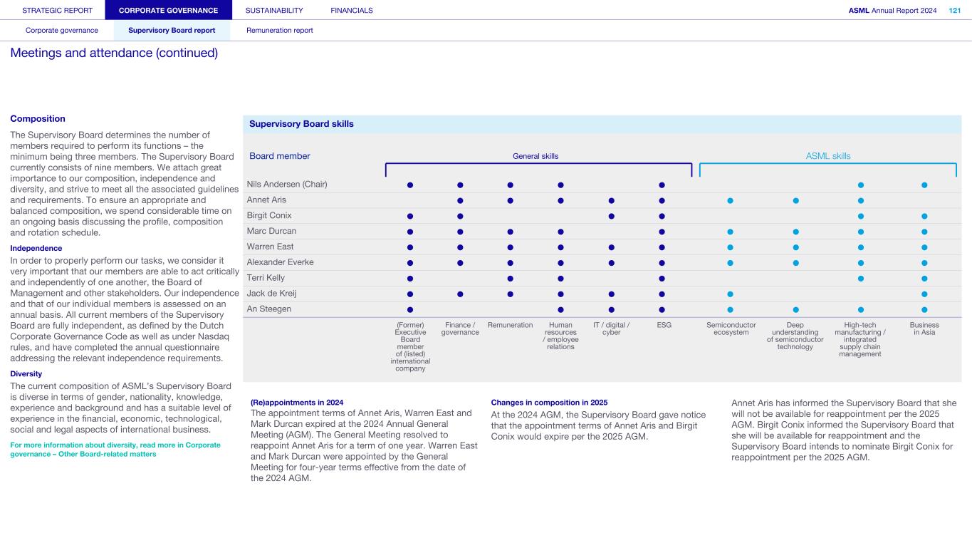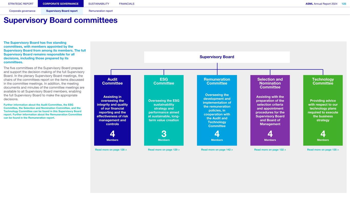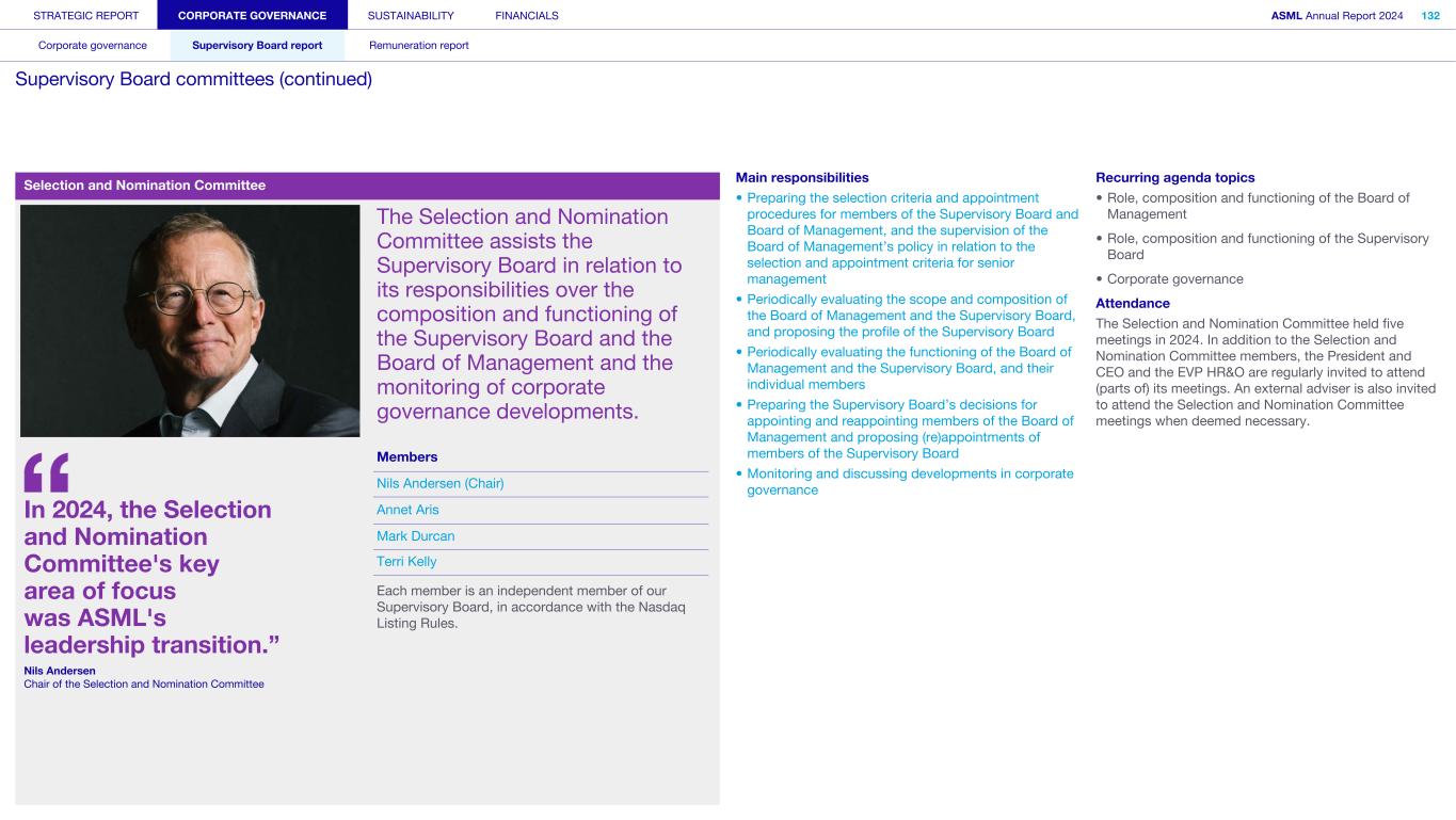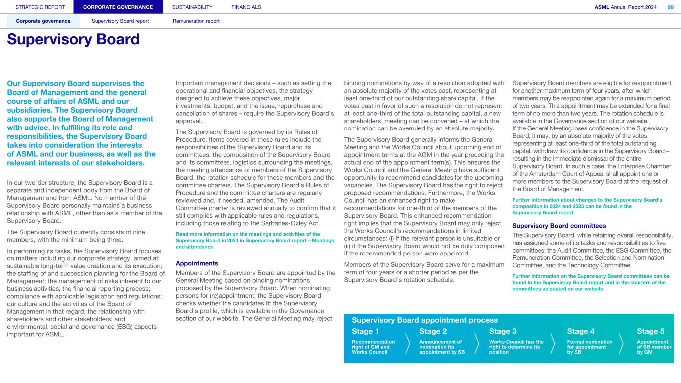 Our Supervisory Board supervises the Board of Management and the general course of affairs of ASML and our subsidiaries. The Supervisory Board also supports the Board of Management with advice. In fulfilling its role and responsibilities, the Supervisory Board takes into consideration the interests of ASML and our business, as well as the relevant interests of our stakeholders. In our two-tier structure, the Supervisory Board is a separate and independent body from the Board of Management and from ASML. No member of the Supervisory Board personally maintains a business relationship with ASML, other than as a member of the Supervisory Board. The Supervisory Board currently consists of nine members, with the minimum being three. In performing its tasks, the Supervisory Board focuses on matters including our corporate strategy, aimed at sustainable long-term value creation and its execution; the staffing of and succession planning for the Board of Management; the management of risks inherent to our business activities; the financial reporting process; compliance with applicable legislation and regulations; our culture and the activities of the Board of Management in that regard; the relationship with shareholders and other stakeholders; and environmental, social and governance (ESG) aspects important for ASML. Important management decisions – such as setting the operational and financial objectives, the strategy designed to achieve these objectives, major investments, budget, and the issue, repurchase and cancellation of shares – require the Supervisory Board’s approval. The Supervisory Board is governed by its Rules of Procedure. Items covered in these rules include the responsibilities of the Supervisory Board and its committees, the composition of the Supervisory Board and its committees, logistics surrounding the meetings, the meeting attendance of members of the Supervisory Board, the rotation schedule for these members and the committee charters. The Supervisory Board’s Rules of Procedure and the committee charters are regularly reviewed and, if needed, amended. The Audit Committee charter is reviewed annually to confirm that it still complies with applicable rules and regulations, including those relating to the Sarbanes-Oxley Act. Read more information on the meetings and activities of the Supervisory Board in 2024 in Supervisory Board report – Meetings and attendance Appointments Members of the Supervisory Board are appointed by the General Meeting based on binding nominations proposed by the Supervisory Board. When nominating persons for (re)appointment, the Supervisory Board checks whether the candidates fit the Supervisory Board’s profile, which is available in the Governance section of our website. The General Meeting may reject binding nominations by way of a resolution adopted with an absolute majority of the votes cast, representing at least one-third of our outstanding share capital. If the votes cast in favor of such a resolution do not represent at least one-third of the total outstanding capital, a new shareholders’ meeting can be convened – at which the nomination can be overruled by an absolute majority. The Supervisory Board generally informs the General Meeting and the Works Council about upcoming end of appointment terms at the AGM in the year preceding the actual end of the appointment term(s). This ensures the Works Council and the General Meeting have sufficient opportunity to recommend candidates for the upcoming vacancies. The Supervisory Board has the right to reject proposed recommendations. Furthermore, the Works Council has an enhanced right to make recommendations for one-third of the members of the Supervisory Board. This enhanced recommendation right implies that the Supervisory Board may only reject the Works Council’s recommendations in limited circumstances: (i) if the relevant person is unsuitable or (ii) if the Supervisory Board would not be duly composed if the recommended person were appointed. Members of the Supervisory Board serve for a maximum term of four years or a shorter period as per the Supervisory Board’s rotation schedule. Supervisory Board appointment process Stage 1 Stage 2 Stage 3 Stage 4 Stage 5 Recommendation right of GM and Works Council Announcement of nomination for appointment by SB Works Council has the right to determine its position Formal nomination for appointment by SB Appointment of SB member by GM Supervisory Board members are eligible for reappointment for another maximum term of four years, after which members may be reappointed again for a maximum period of two years. This appointment may be extended for a final term of no more than two years. The rotation schedule is available in the Governance section of our website. If the General Meeting loses confidence in the Supervisory Board, it may, by an absolute majority of the votes representing at least one-third of the total outstanding capital, withdraw its confidence in the Supervisory Board – resulting in the immediate dismissal of the entire Supervisory Board. In such a case, the Enterprise Chamber of the Amsterdam Court of Appeal shall appoint one or more members to the Supervisory Board at the request of the Board of Management. Further information about changes to the Supervisory Board‘s composition in 2024 and 2025 can be found in the Supervisory Board report Supervisory Board committees The Supervisory Board, while retaining overall responsibility, has assigned some of its tasks and responsibilities to five committees: the Audit Committee, the ESG Committee, the Remuneration Committee, the Selection and Nomination Committee, and the Technology Committee. Further information on the Supervisory Board committees can be found in the Supervisory Board report and in the charters of the committees as posted on our website STRATEGIC REPORT CORPORATE GOVERNANCE SUSTAINABILITY FINANCIALS ASML Annual Report 2024 99 Corporate governance Supervisory 